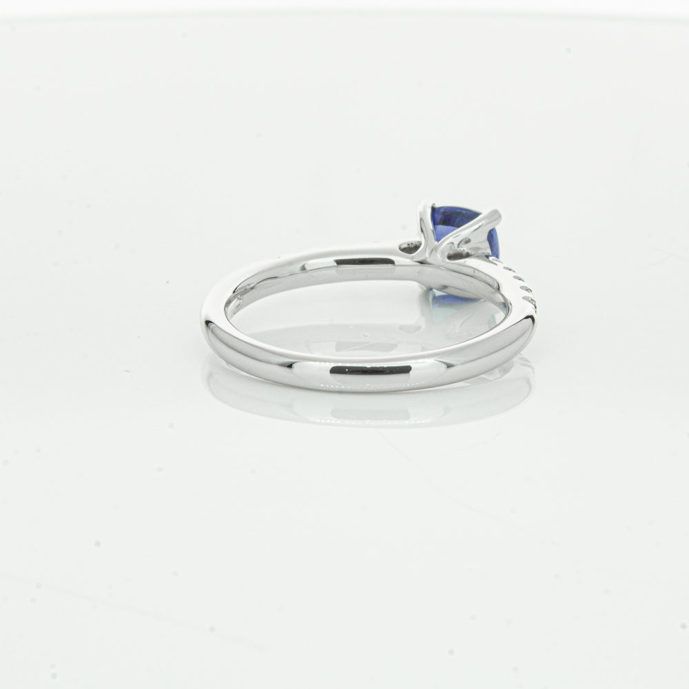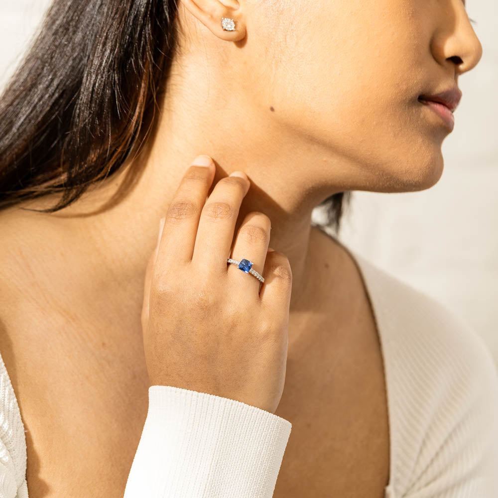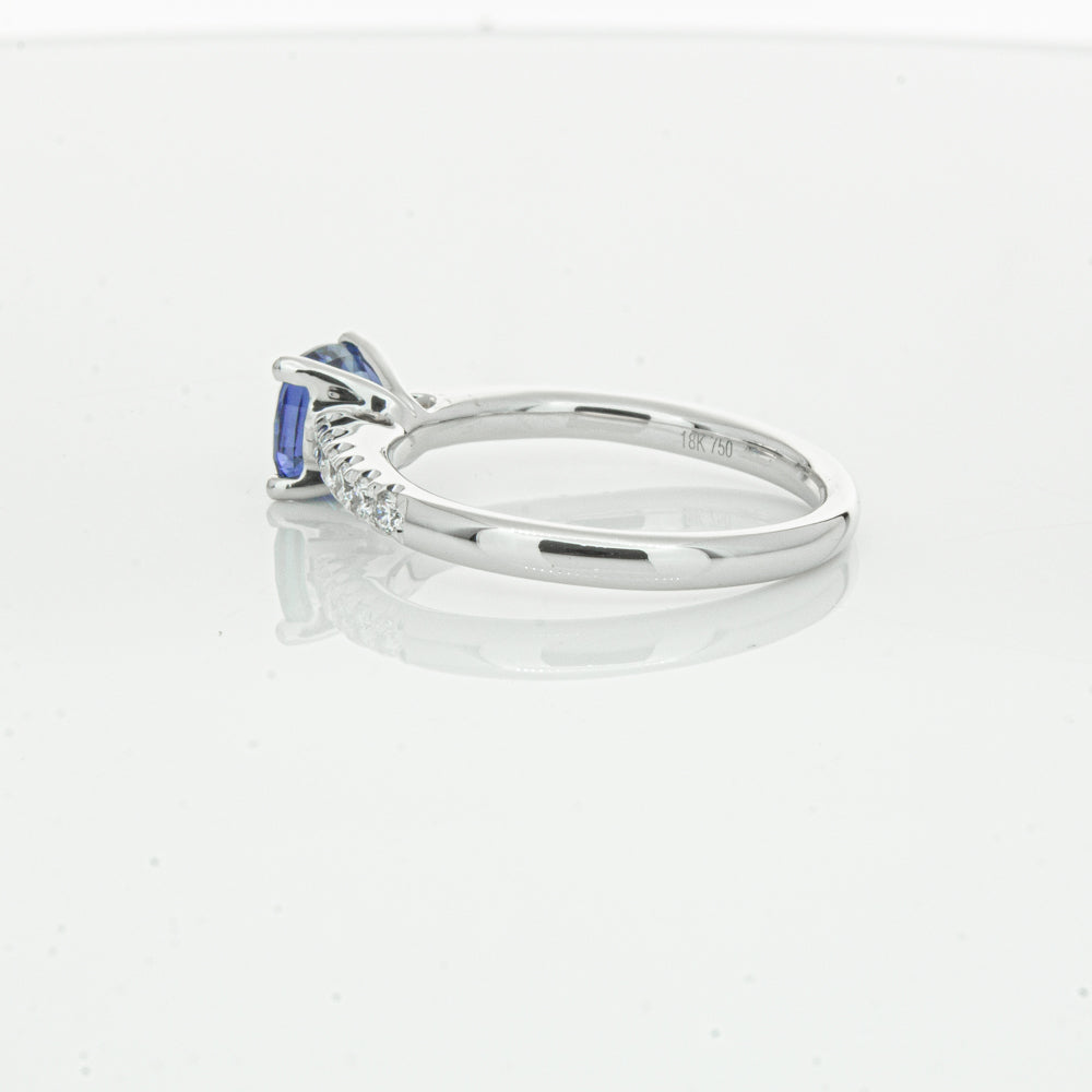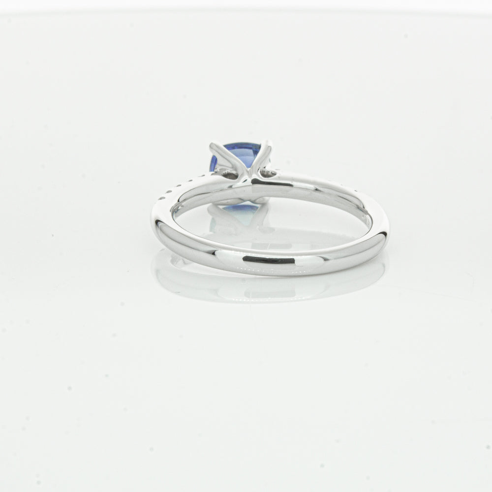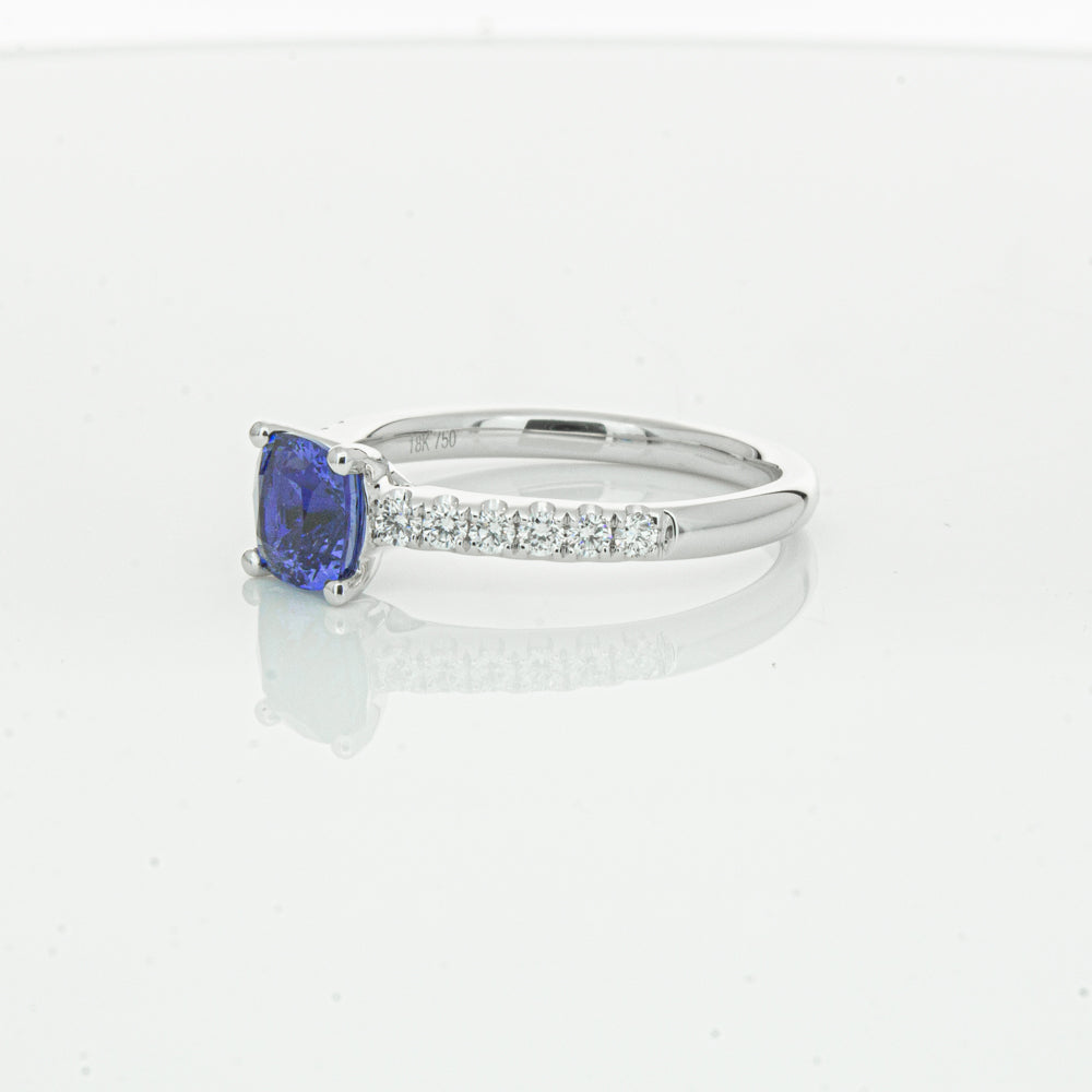 18ct white gold Meridien ring, featuring a 1.21ct cushion cut sapphire from Sri Lanka with diamond set shoulders.