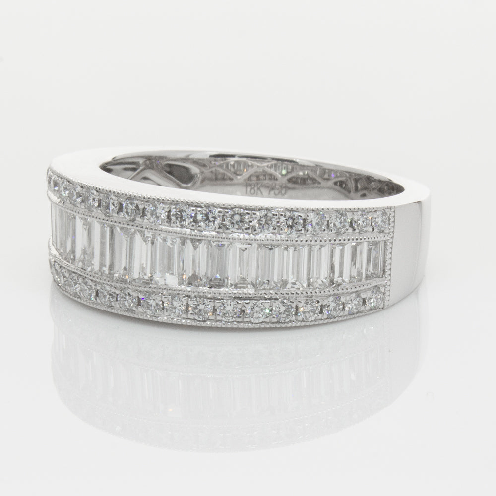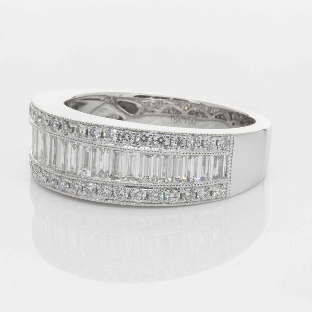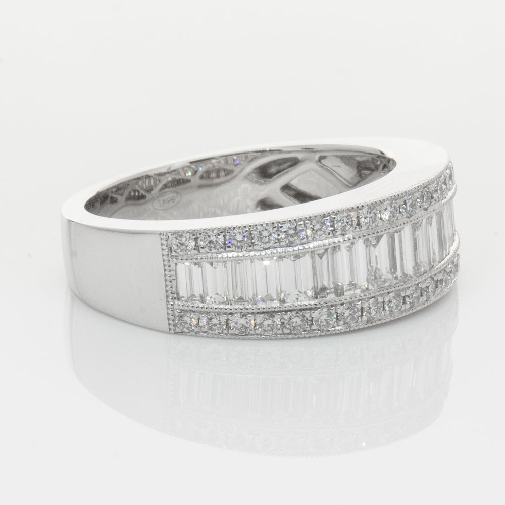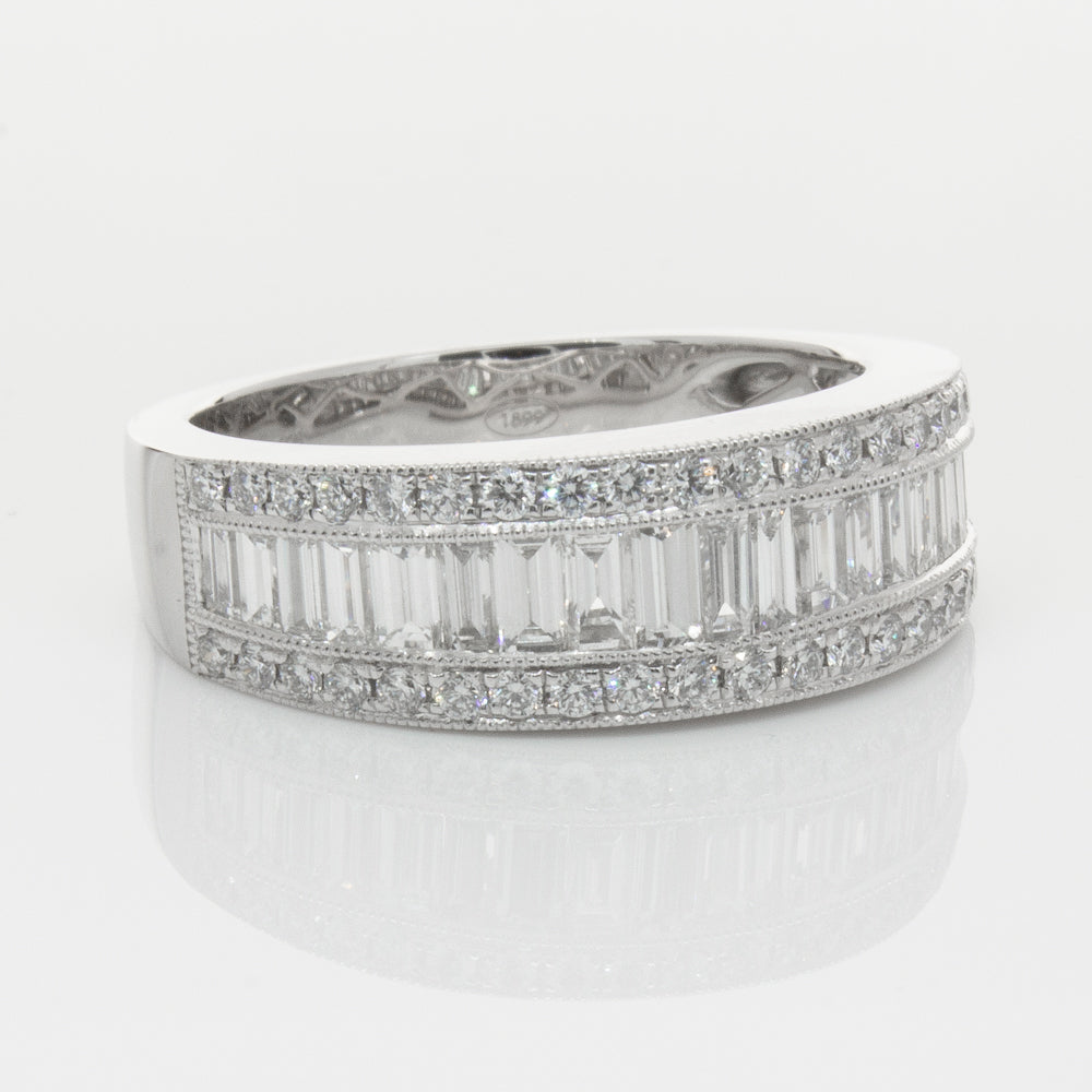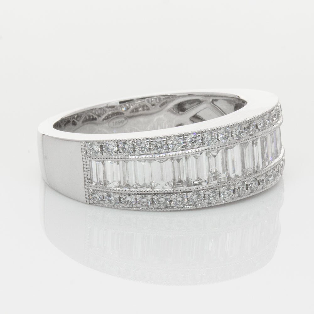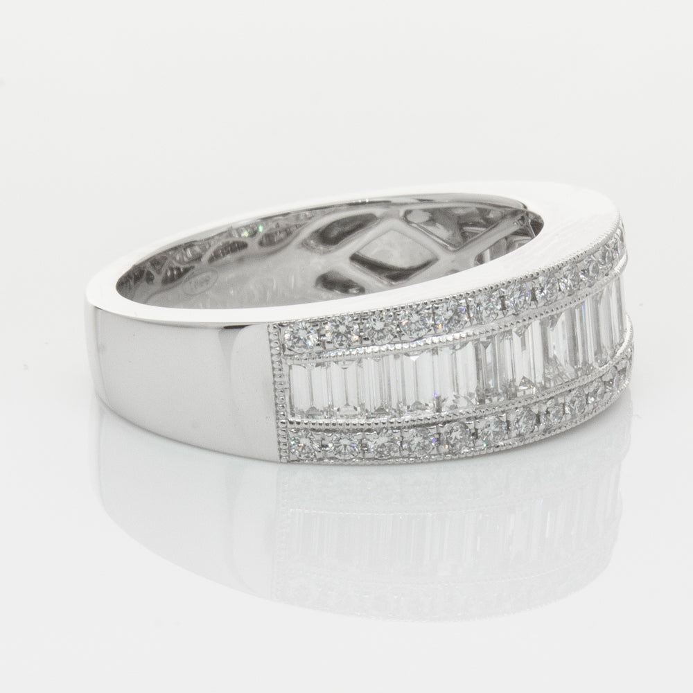Crafted from 18ct white gold tapered band featuring channel set baguette and sparkling round brilliant cut diamonds.