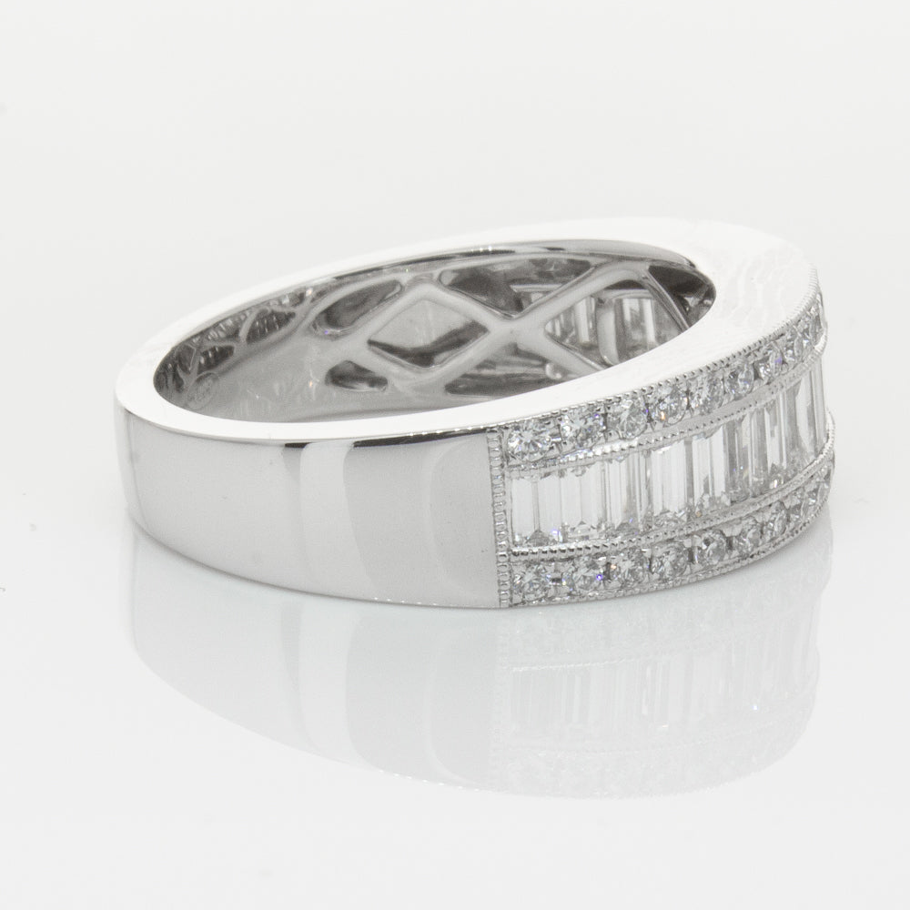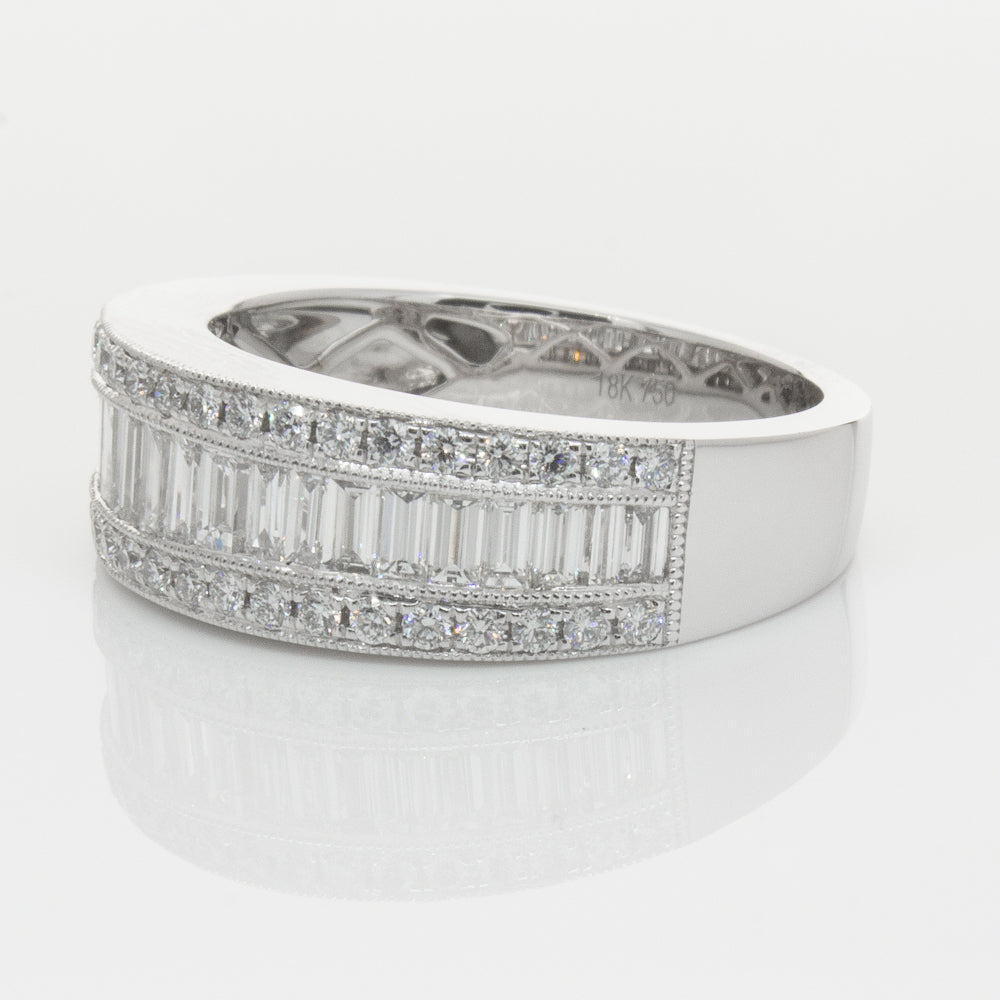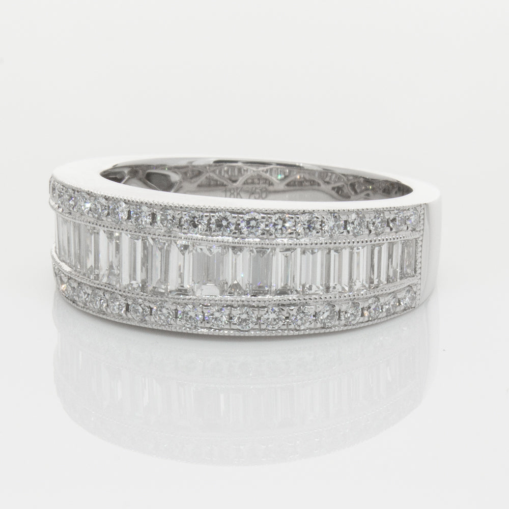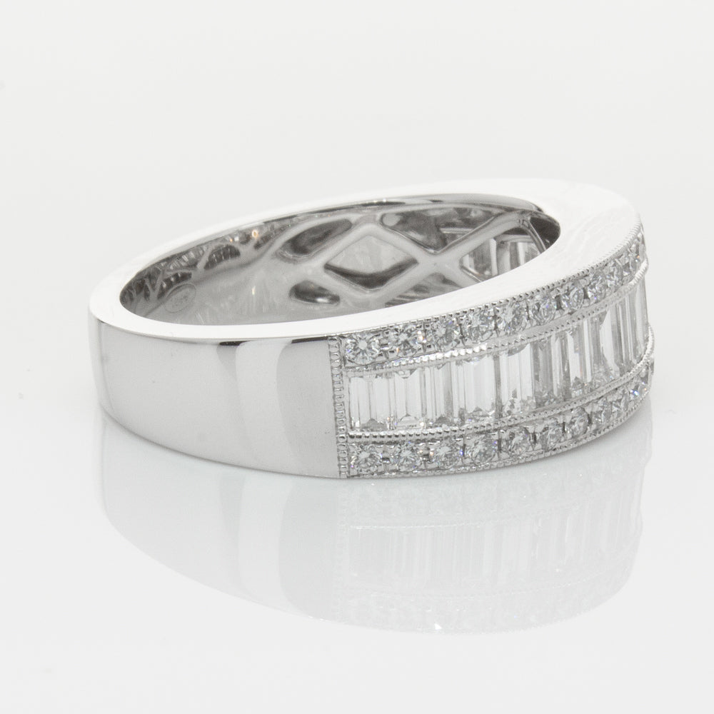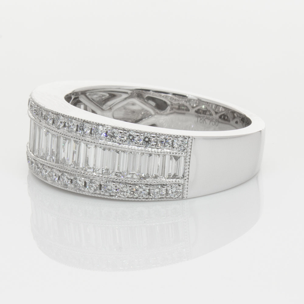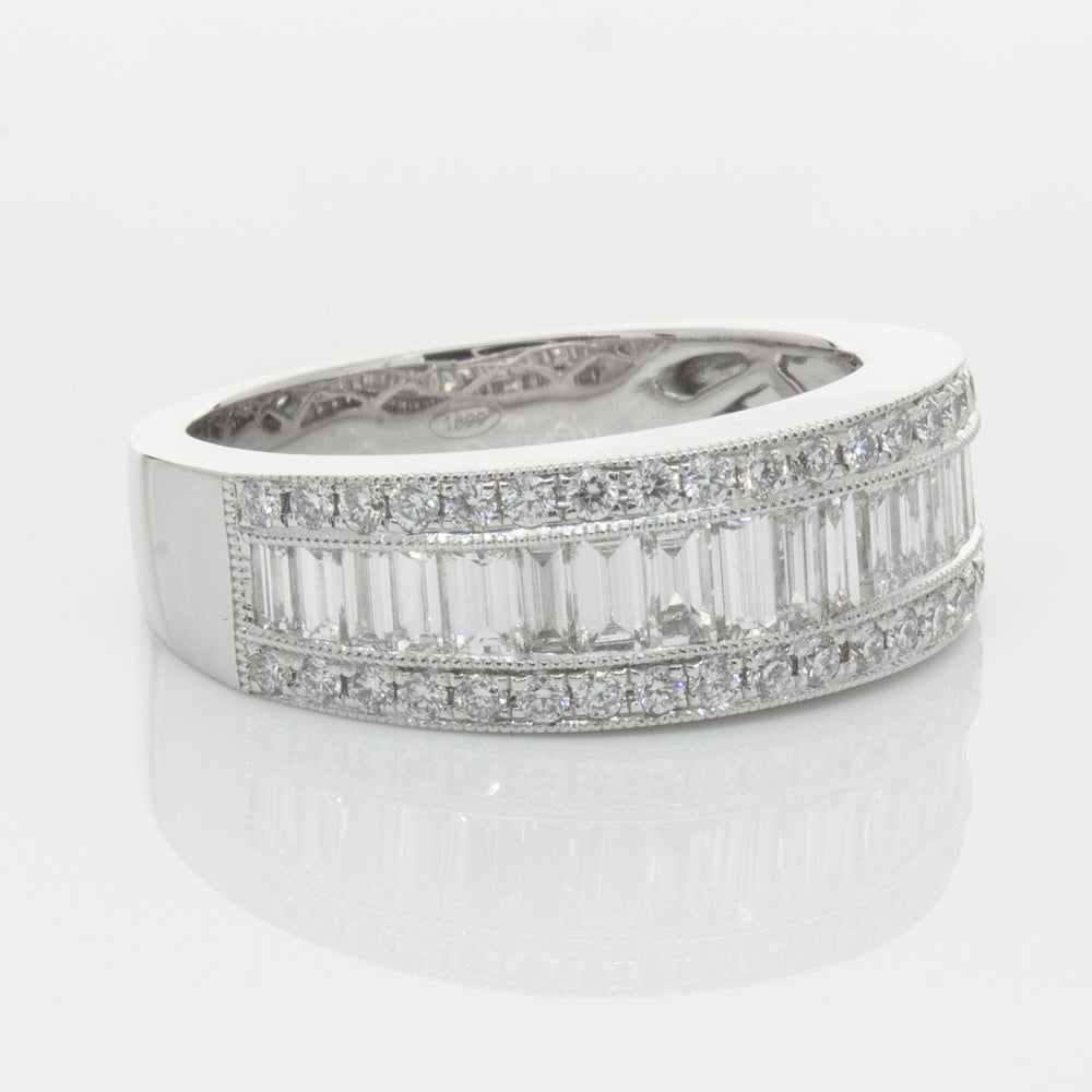 Crafted from 18ct white gold tapered band featuring channel set baguette and sparkling round brilliant cut diamonds.