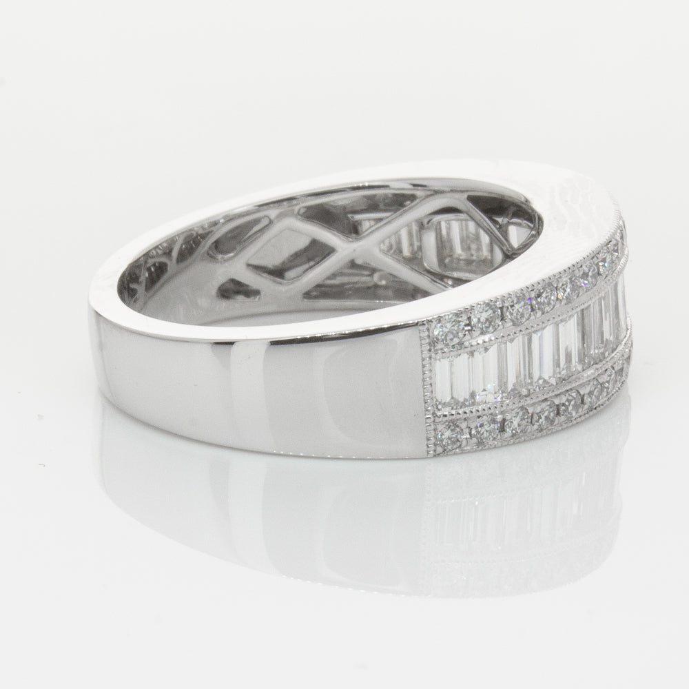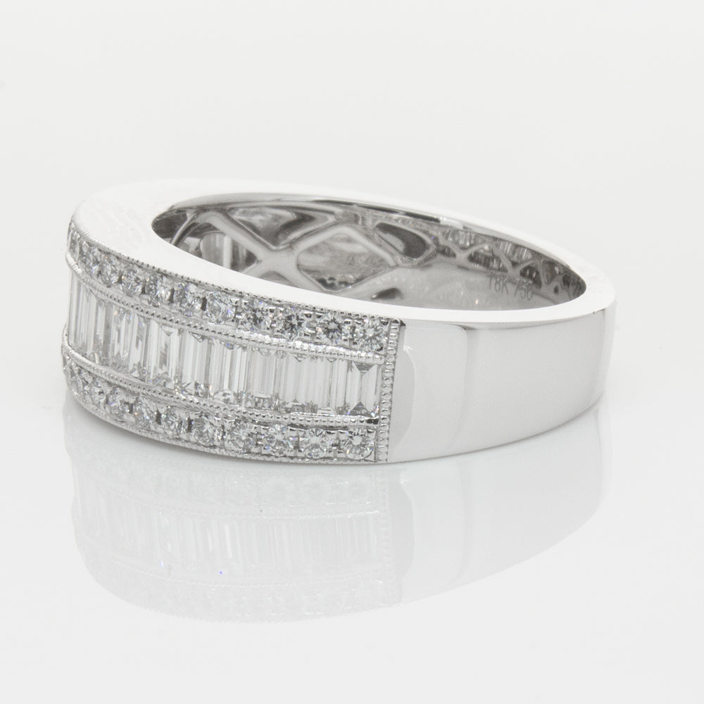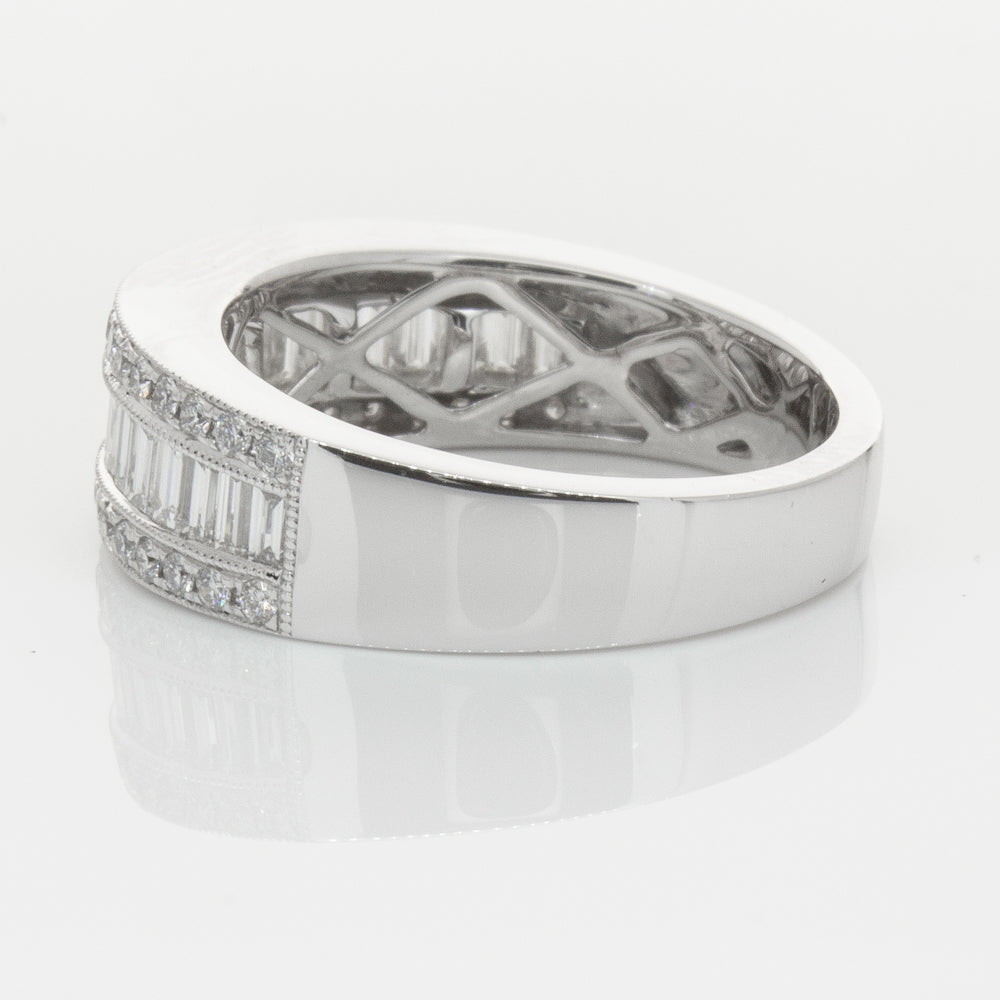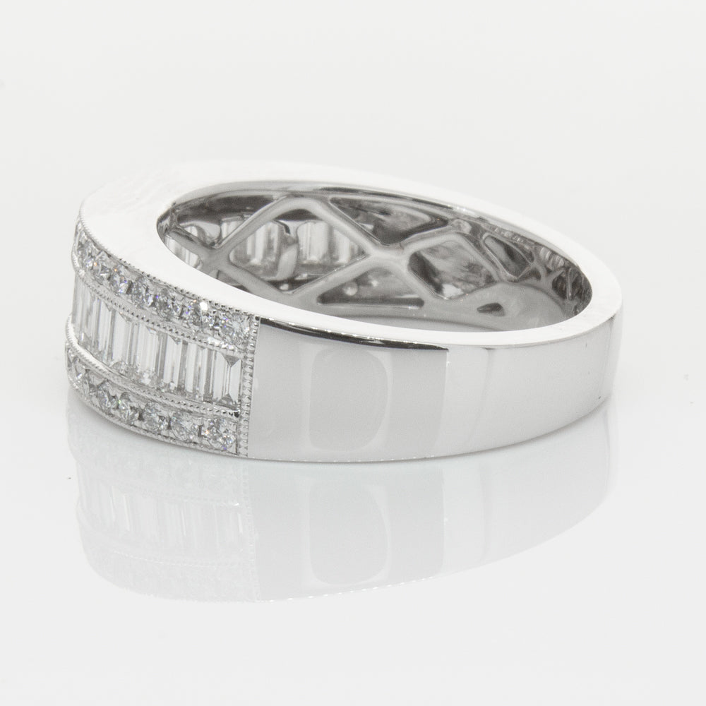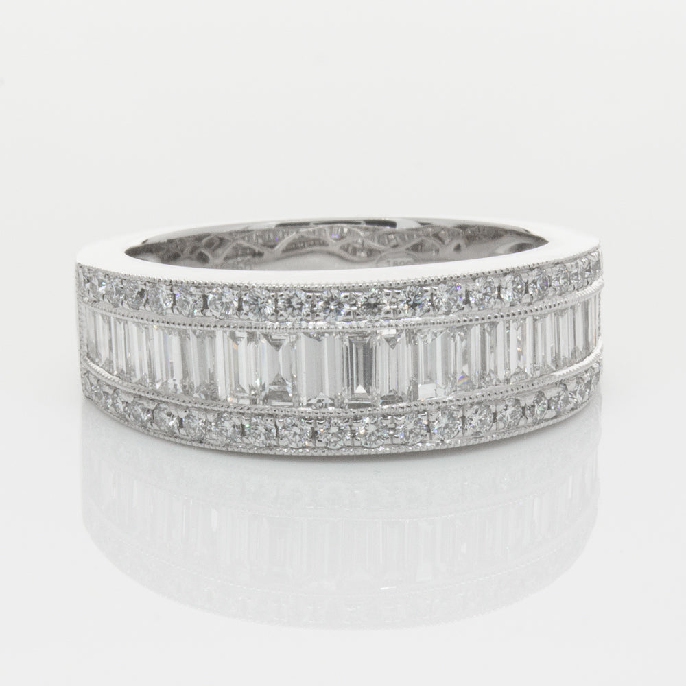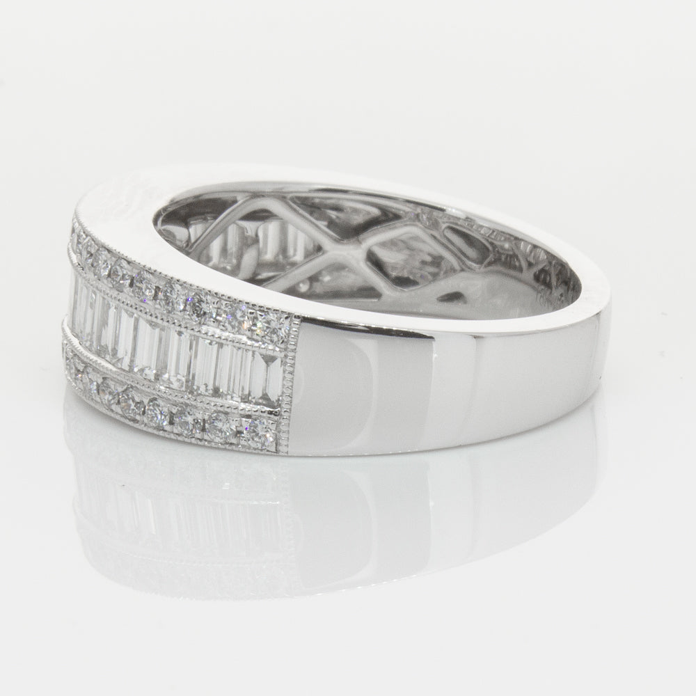 Crafted from 18ct white gold tapered band featuring channel set baguette and sparkling round brilliant cut diamonds.
