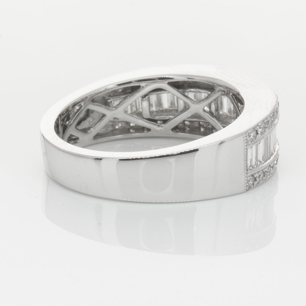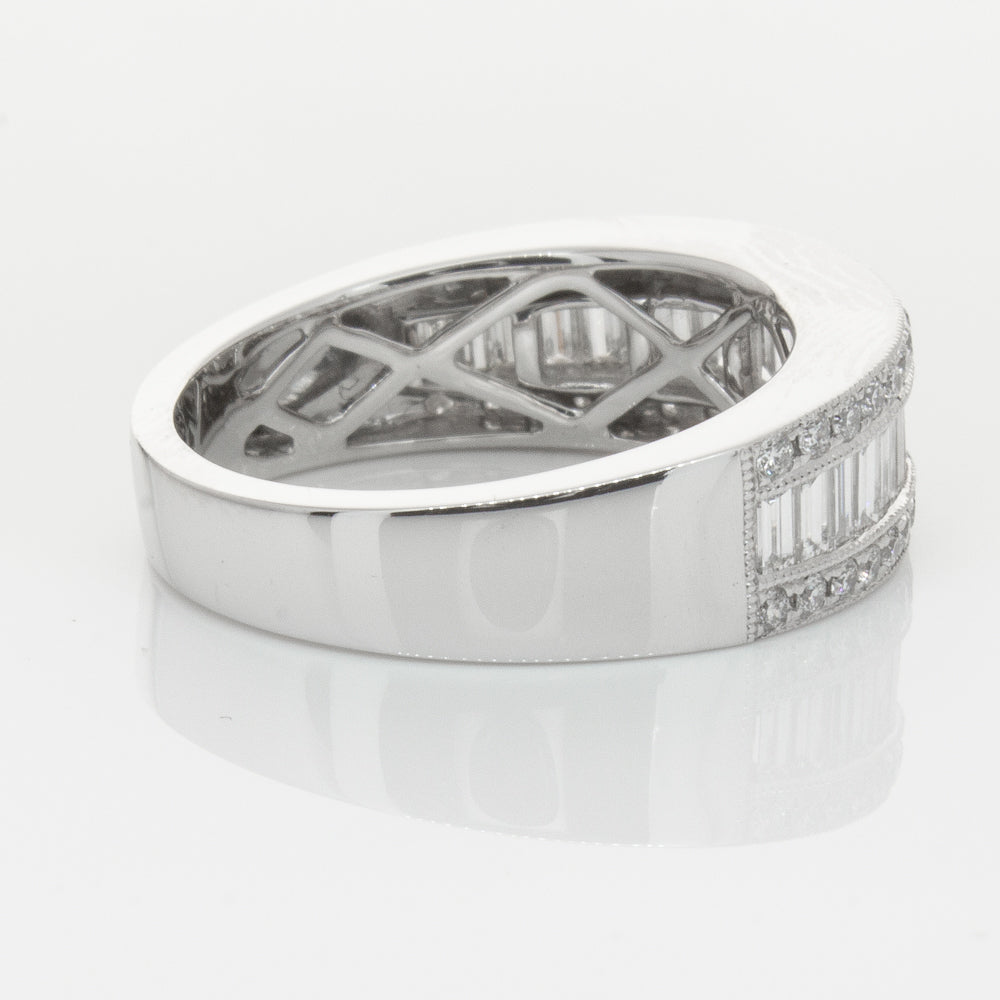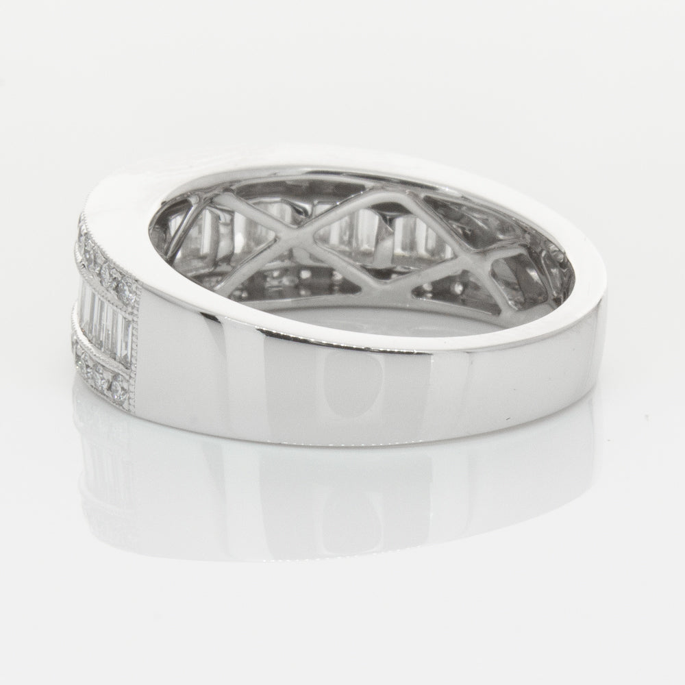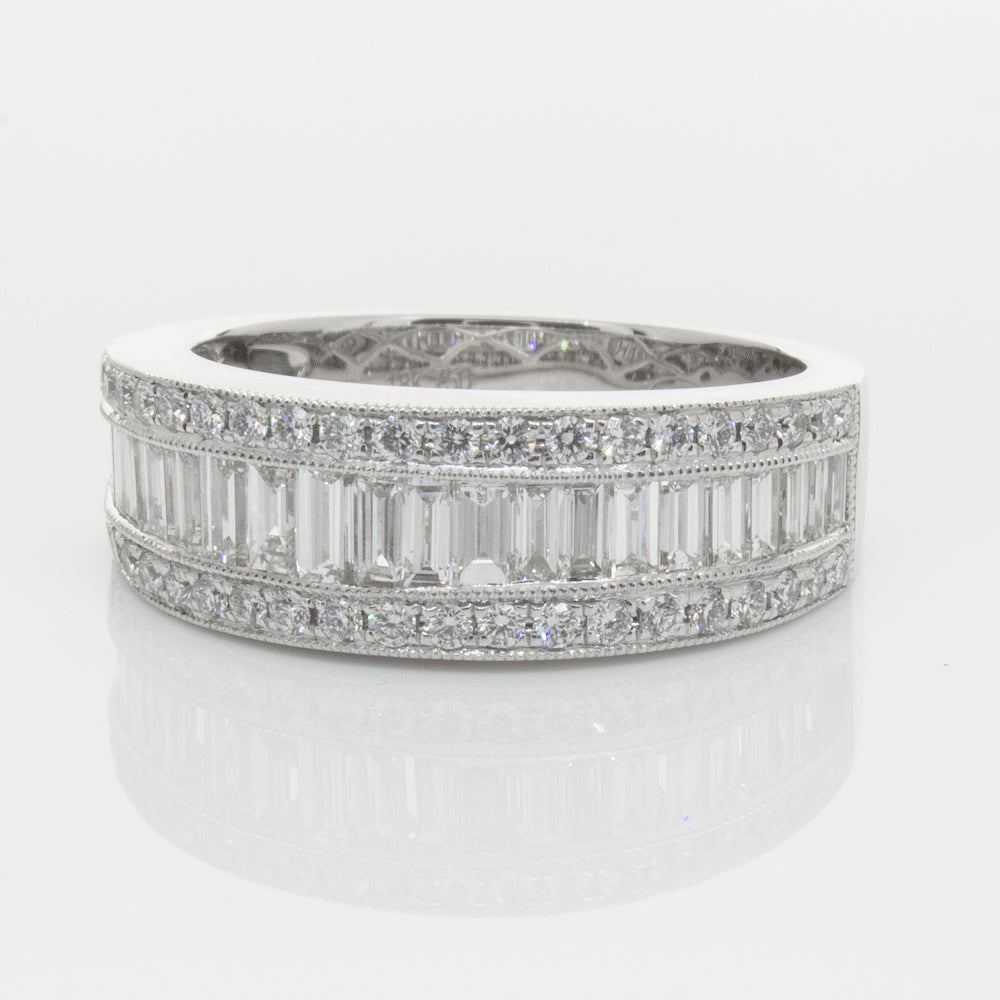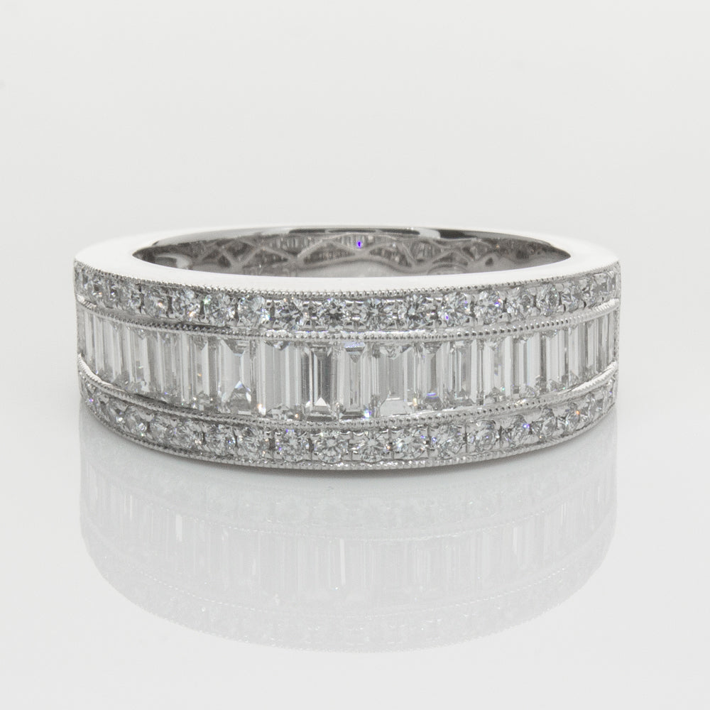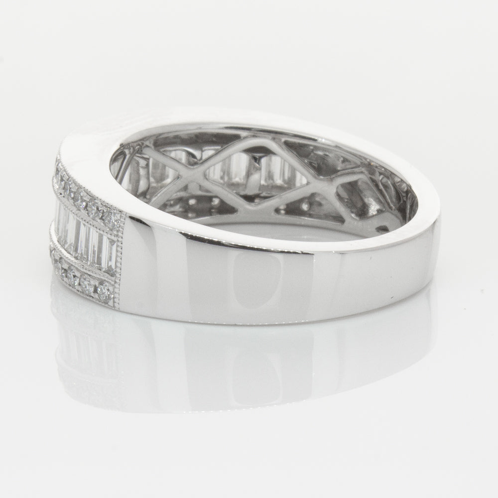 Crafted from 18ct white gold tapered band featuring channel set baguette and sparkling round brilliant cut diamonds.