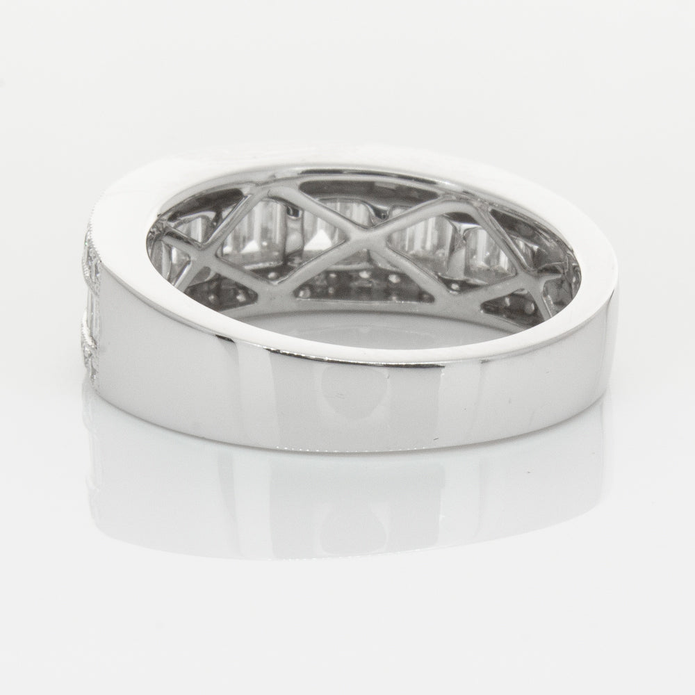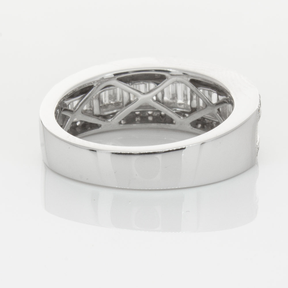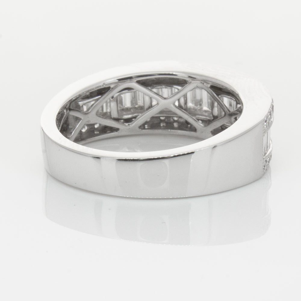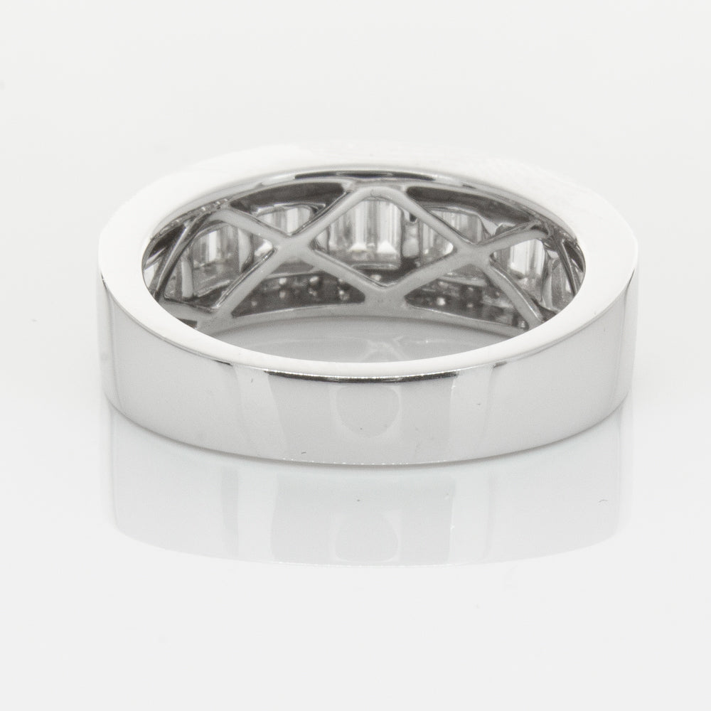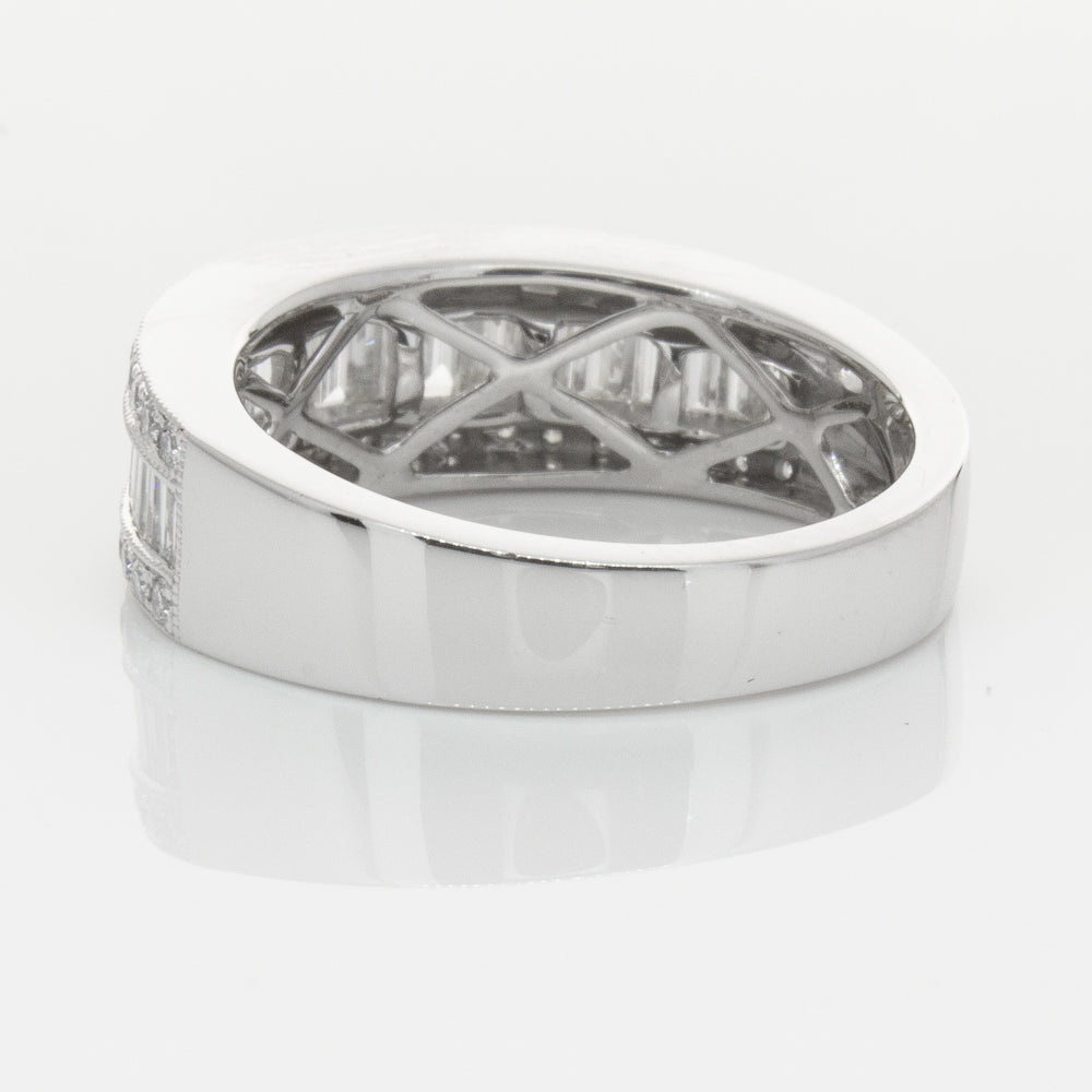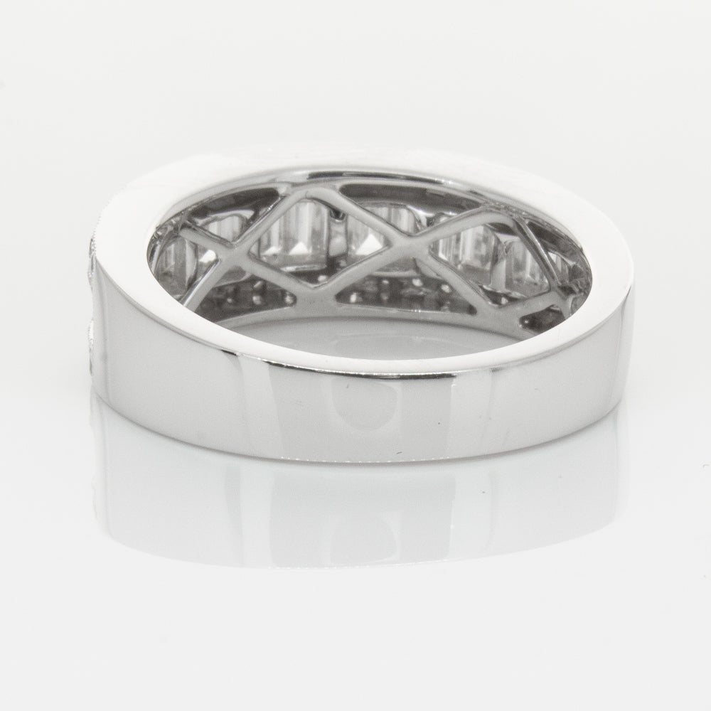 Crafted from 18ct white gold tapered band featuring channel set baguette and sparkling round brilliant cut diamonds.