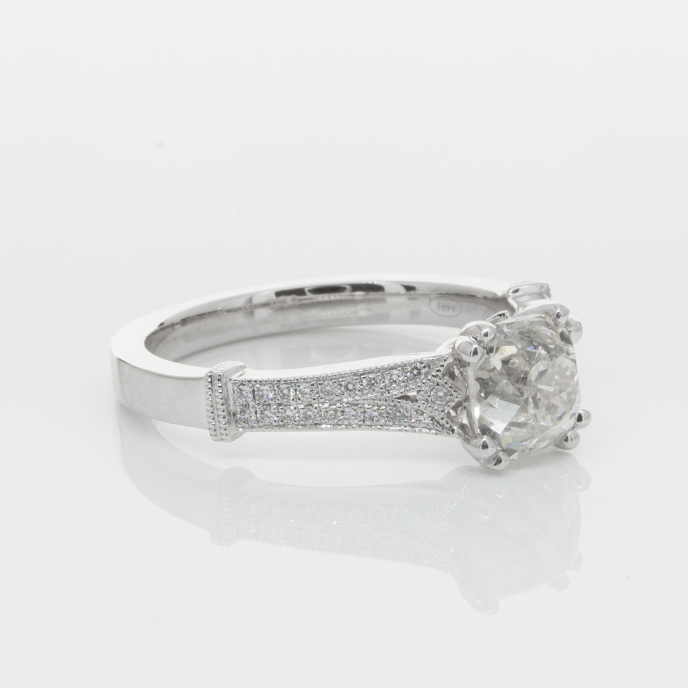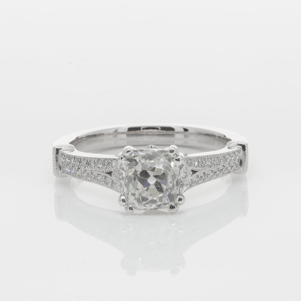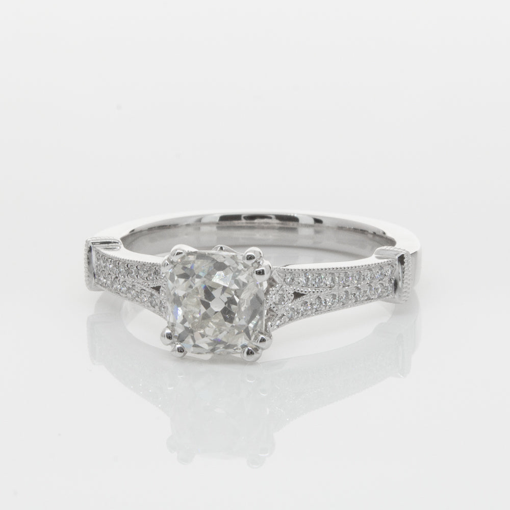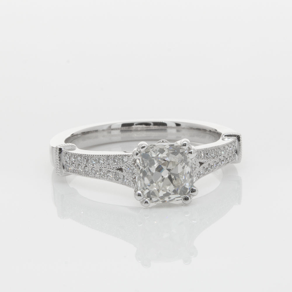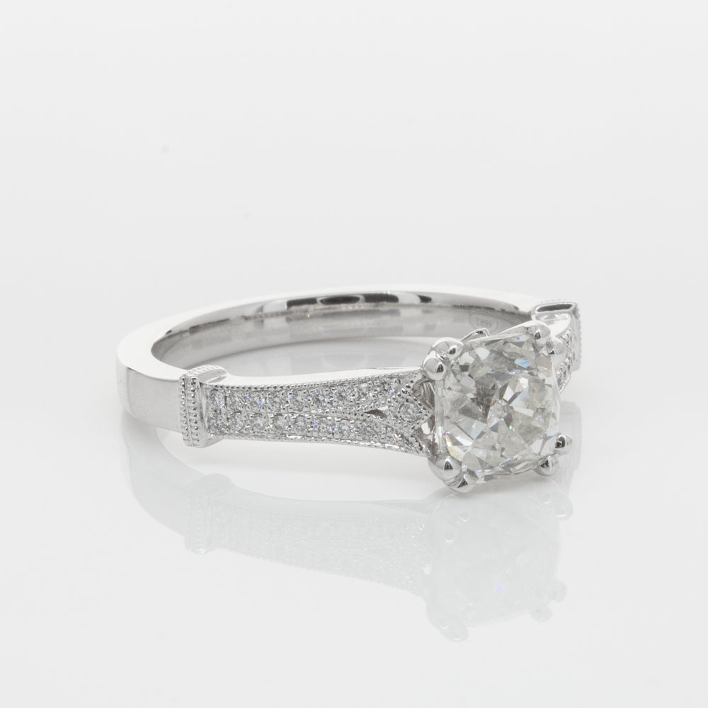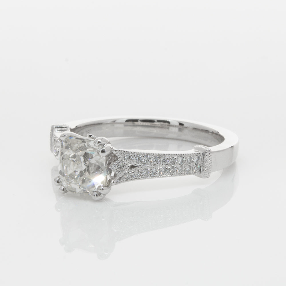 This 18ct white gold ring features one old square cut dazzling white diamond with four double claw settings, resting on diamond set shoulders.