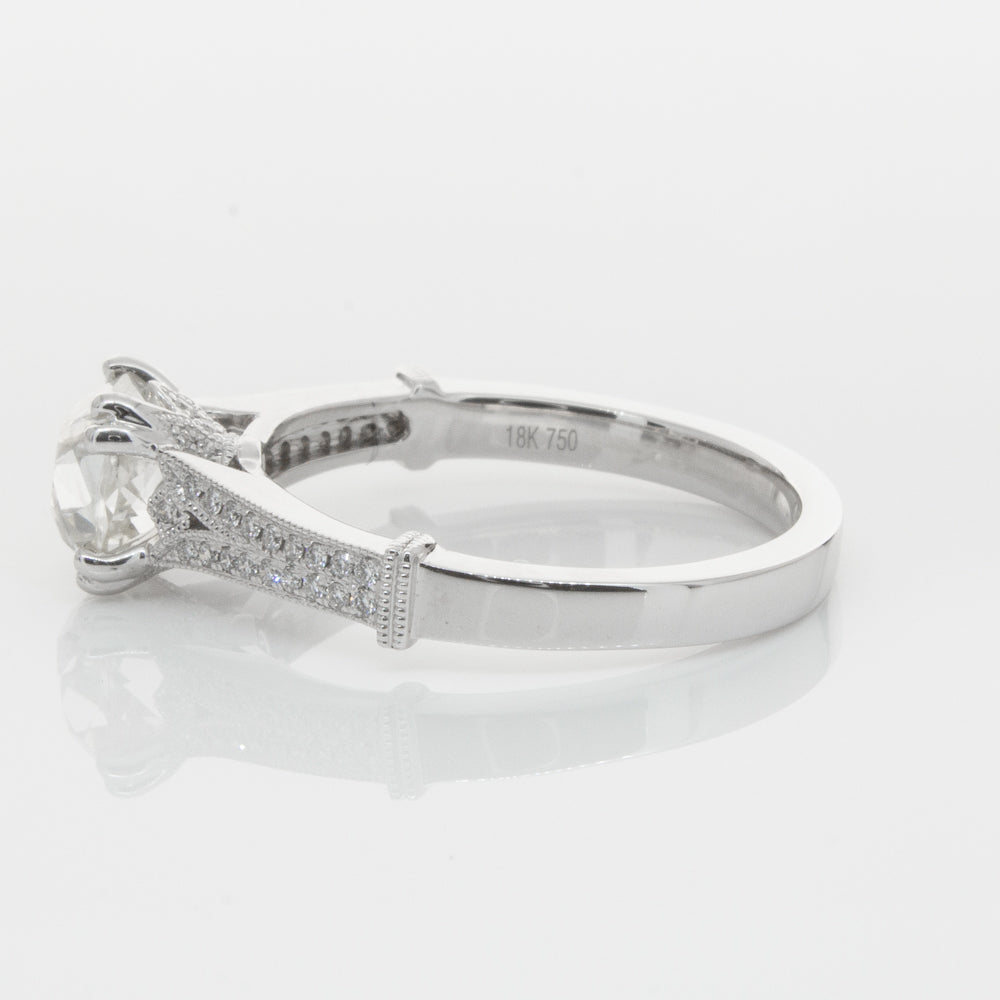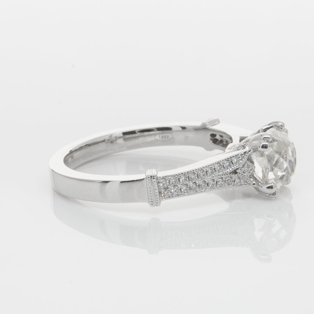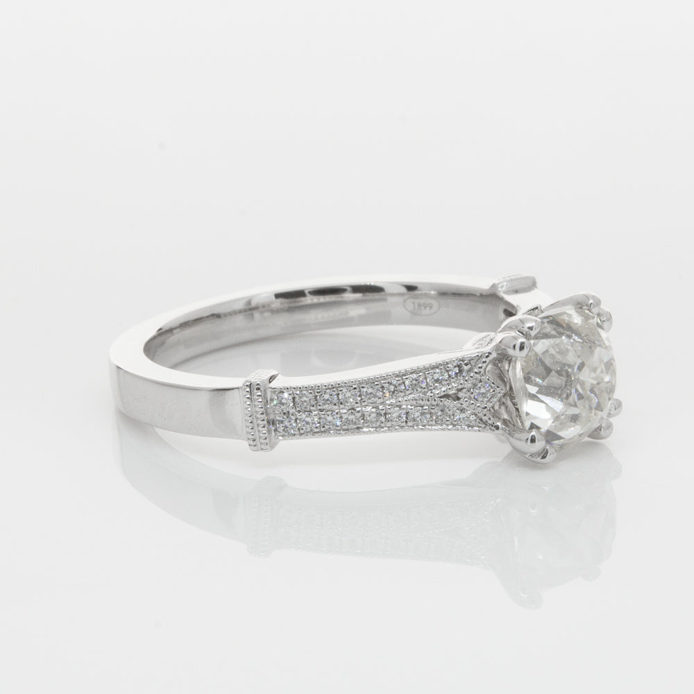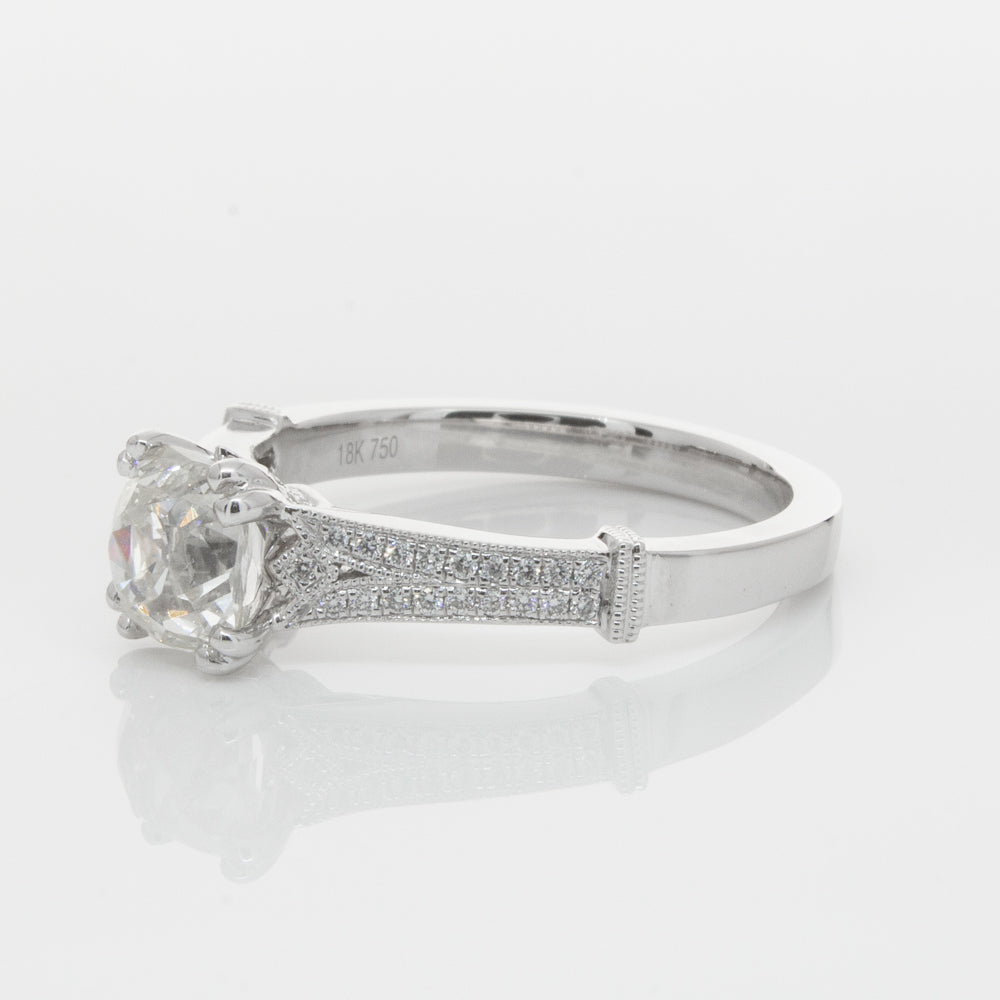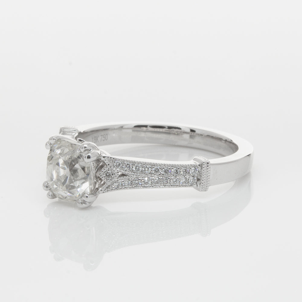 This 18ct white gold ring features one old square cut dazzling white diamond with four double claw settings, resting on diamond set shoulders.