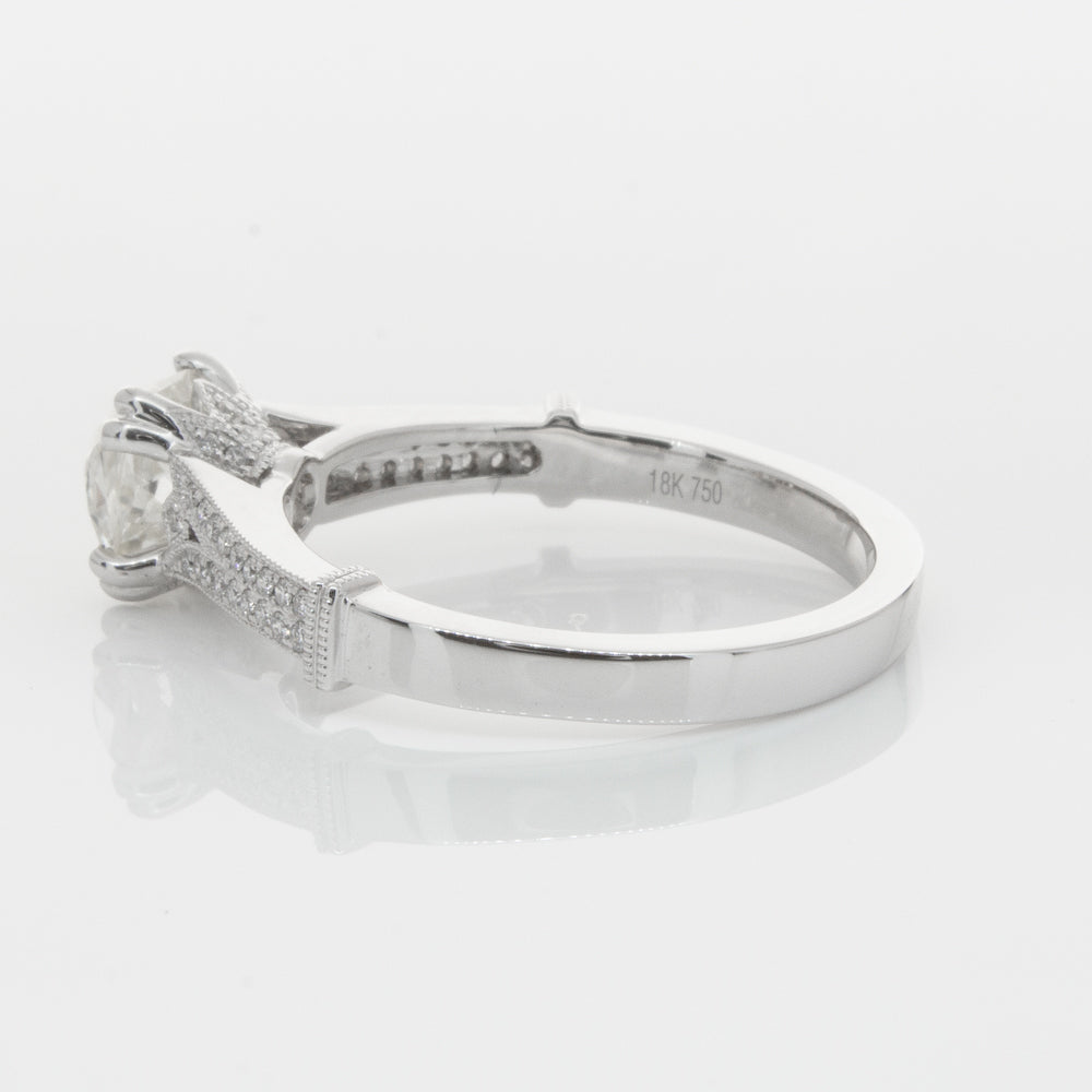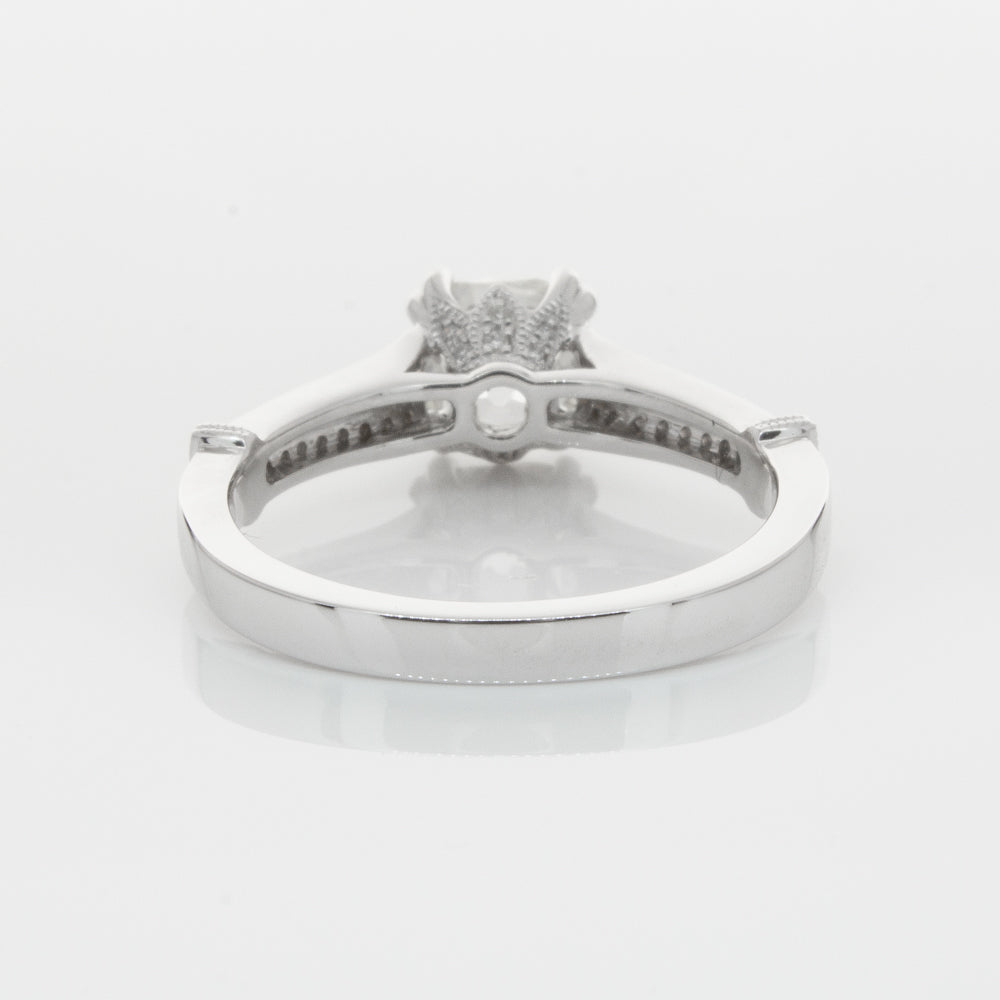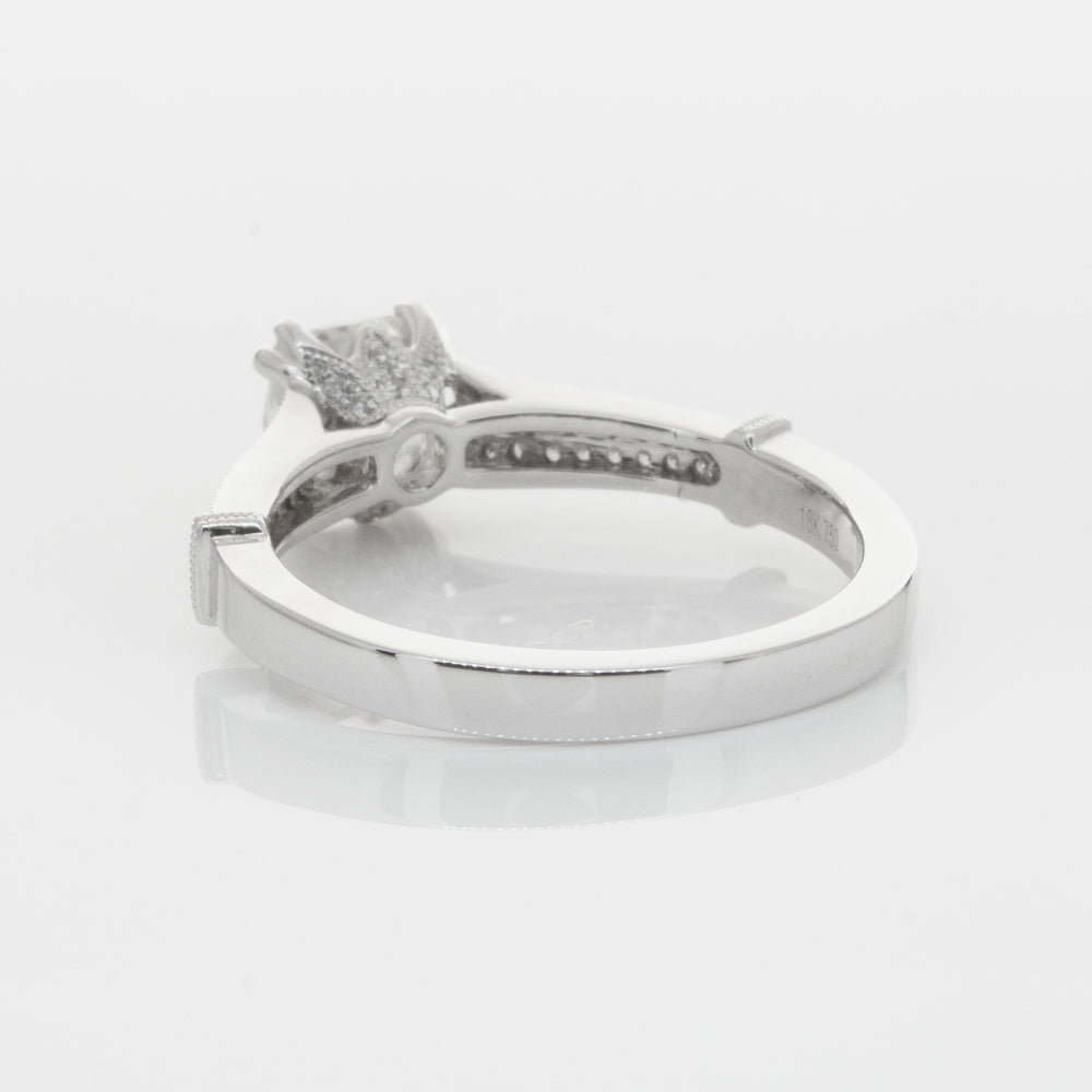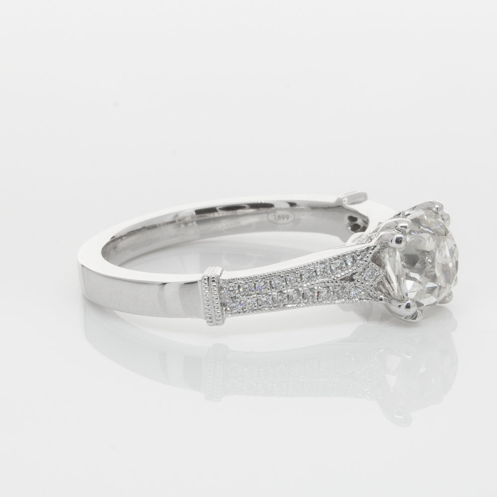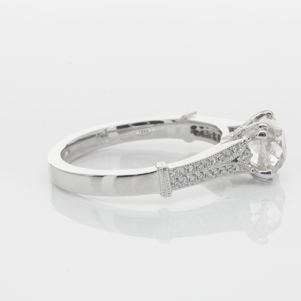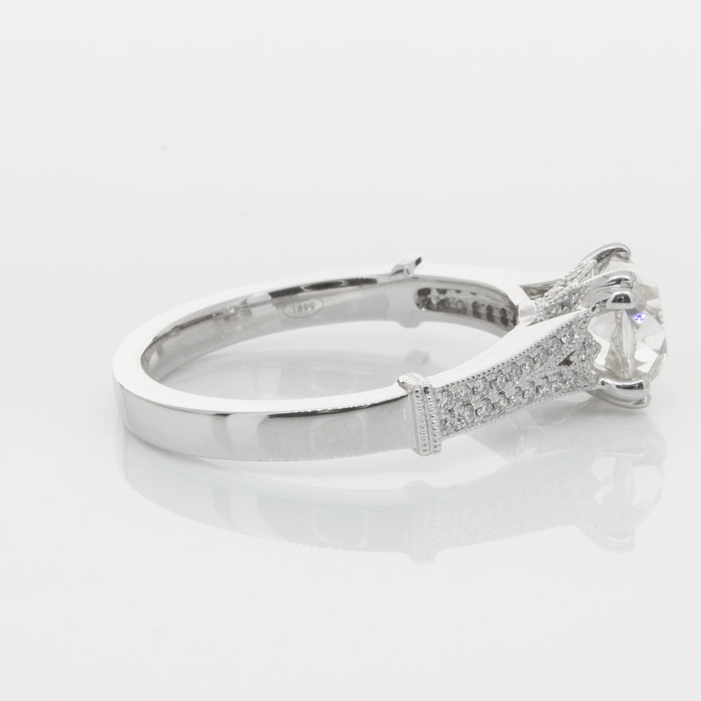 This 18ct white gold ring features one old square cut dazzling white diamond with four double claw settings, resting on diamond set shoulders.