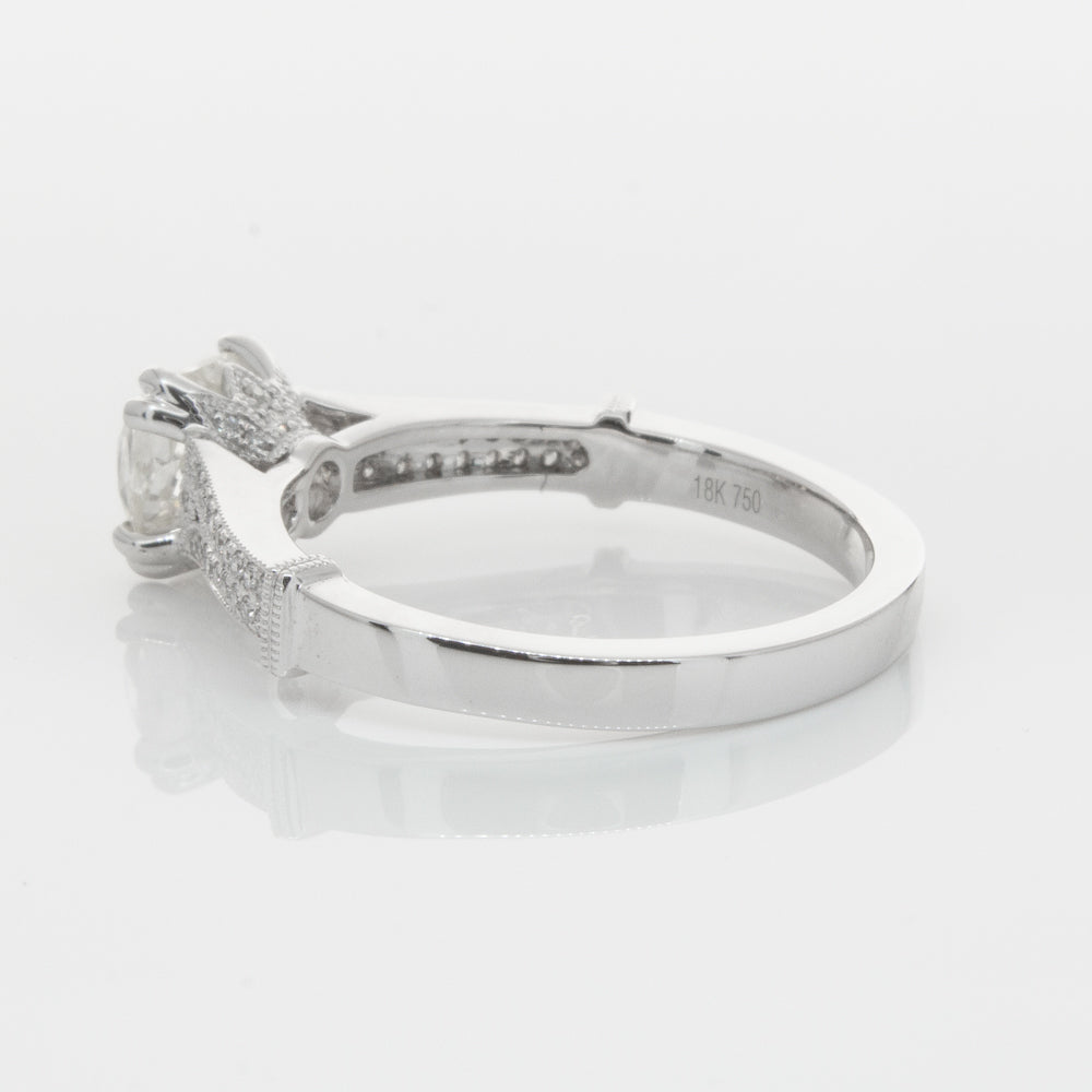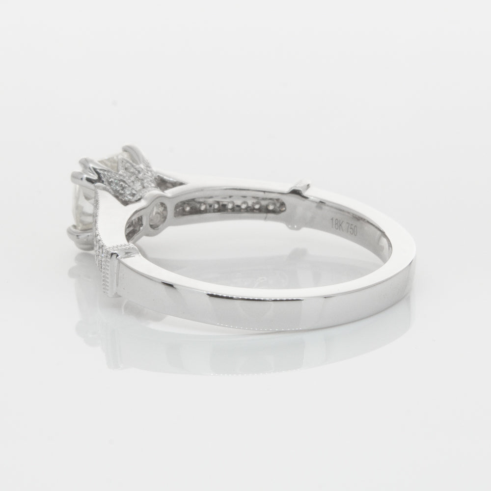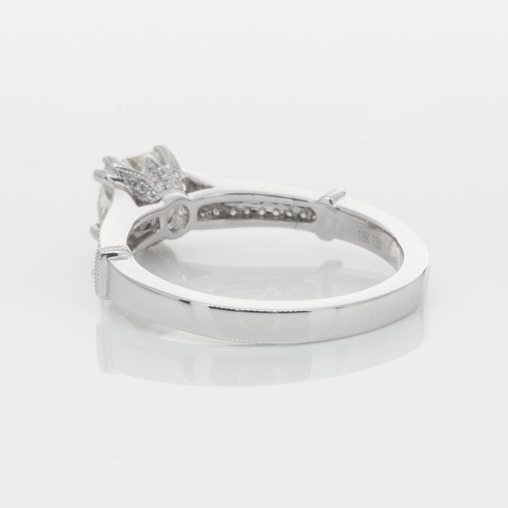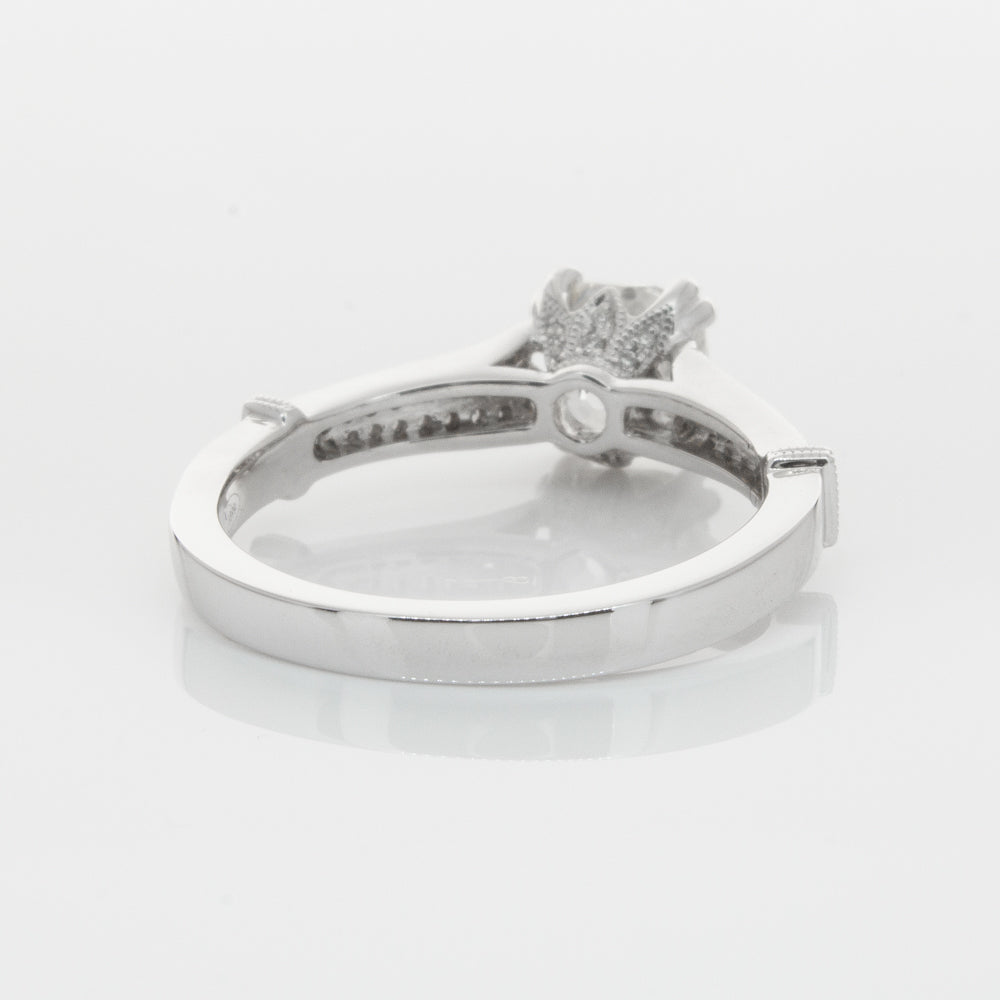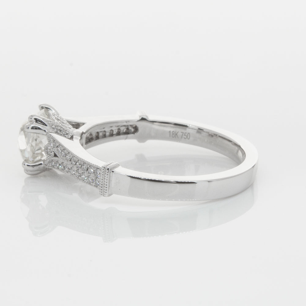 This 18ct white gold ring features one old square cut dazzling white diamond with four double claw settings, resting on diamond set shoulders.
