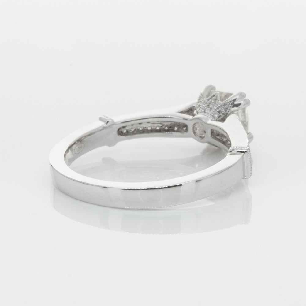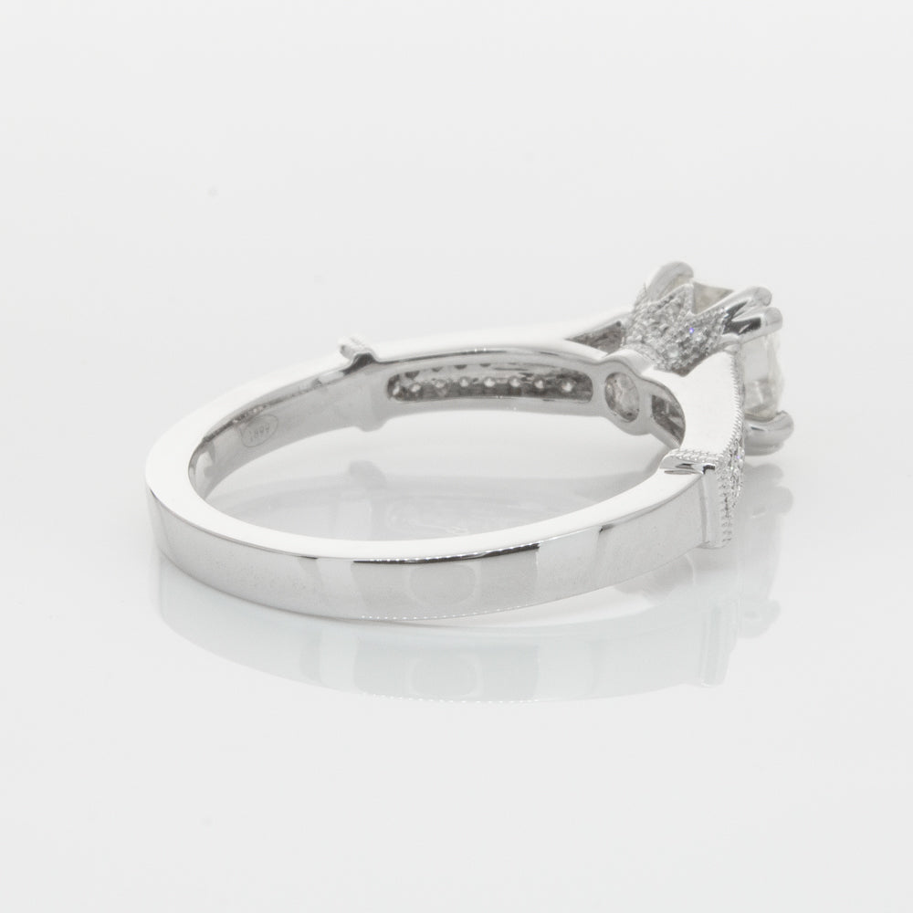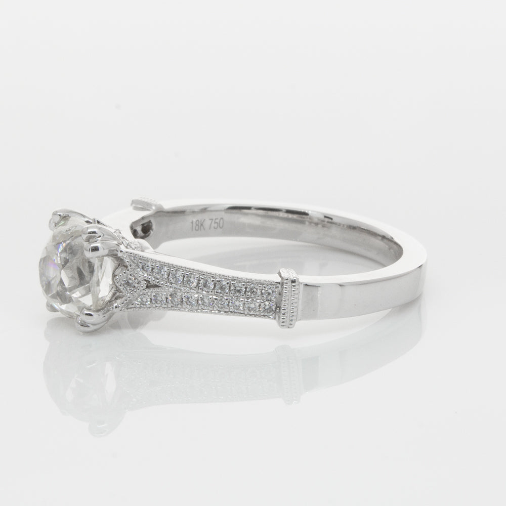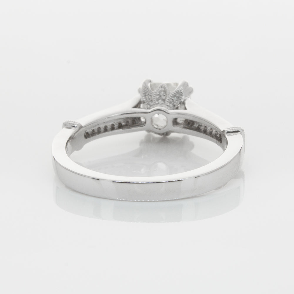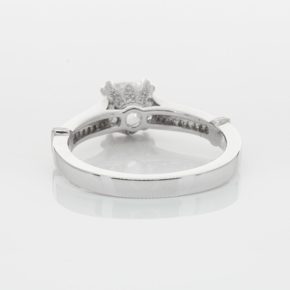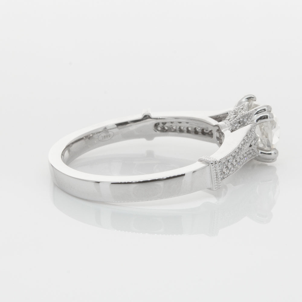 This 18ct white gold ring features one old square cut dazzling white diamond with four double claw settings, resting on diamond set shoulders.