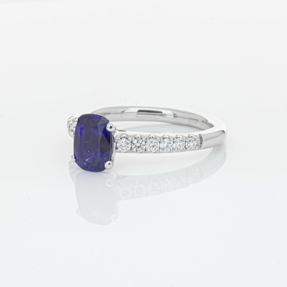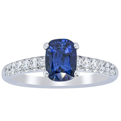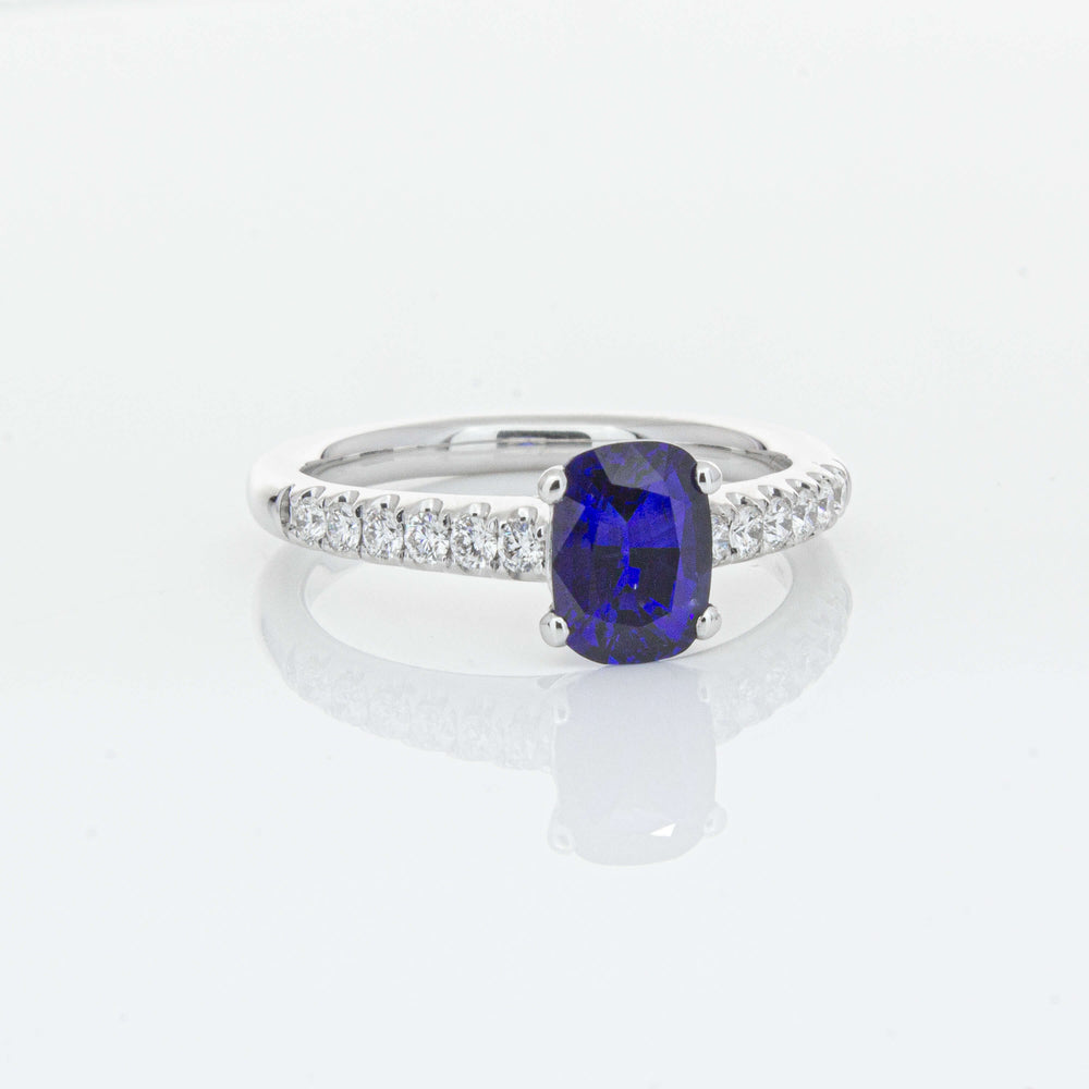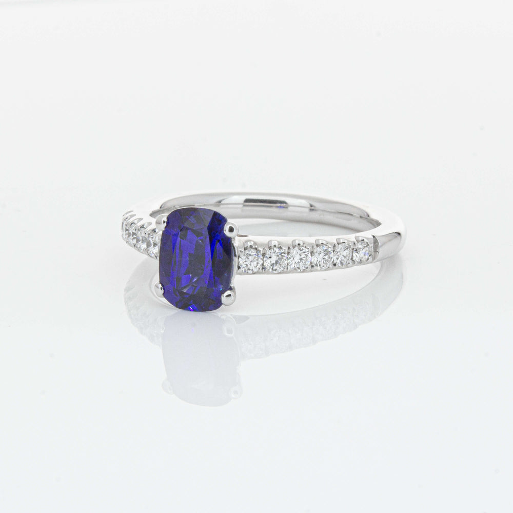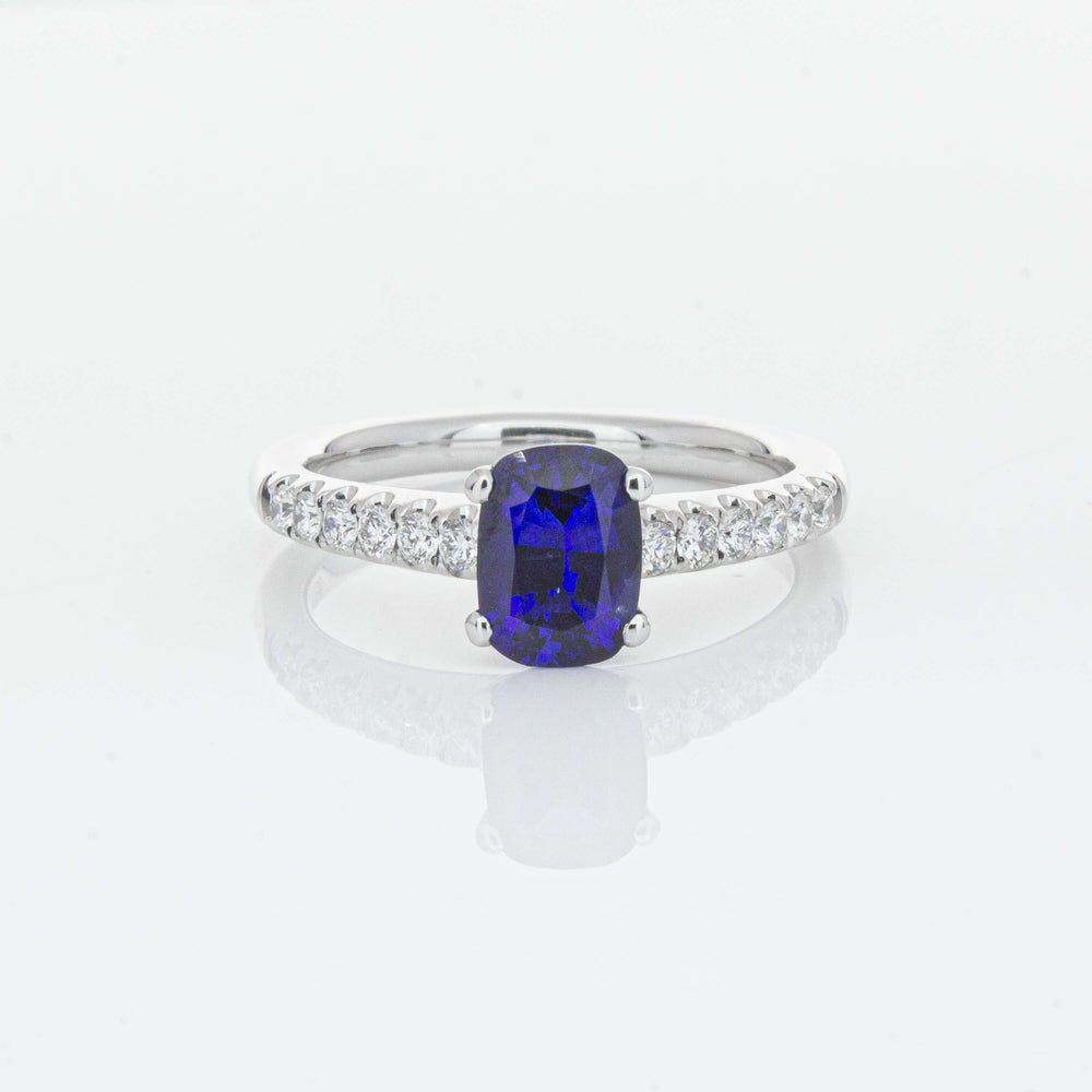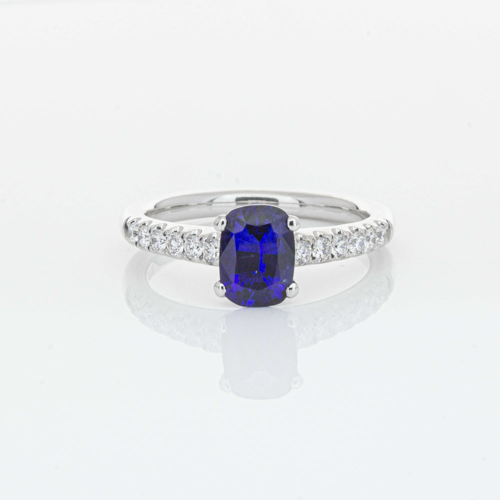 Carefully crafted from 18ct white gold, this stunning Meridien ring features a 1.36ct cushion faceted sapphire with diamond set shoulders.