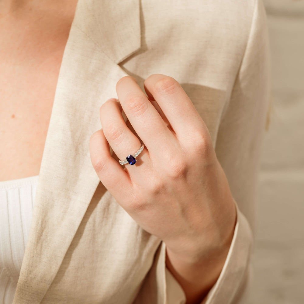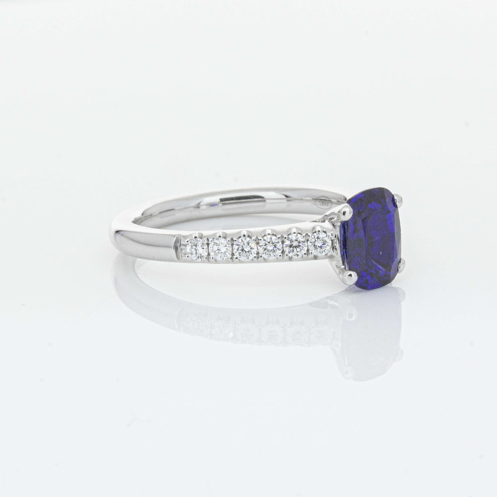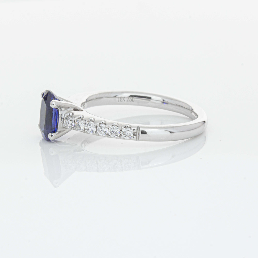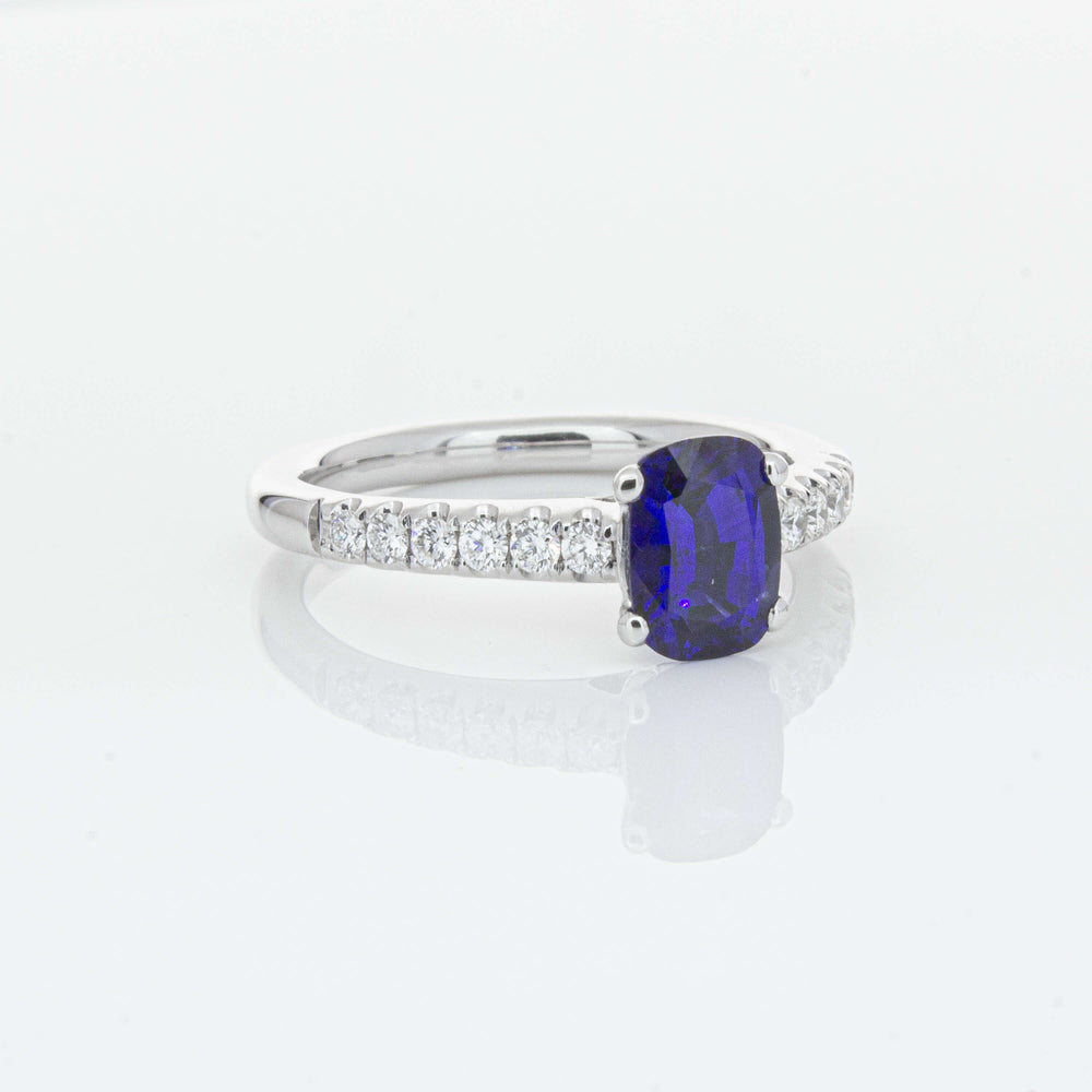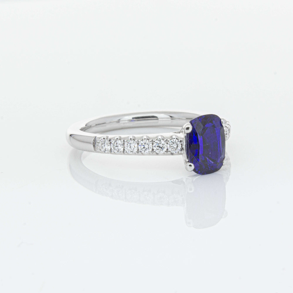 Carefully crafted from 18ct white gold, this stunning Meridien ring features a 1.36ct cushion faceted sapphire with diamond set shoulders.