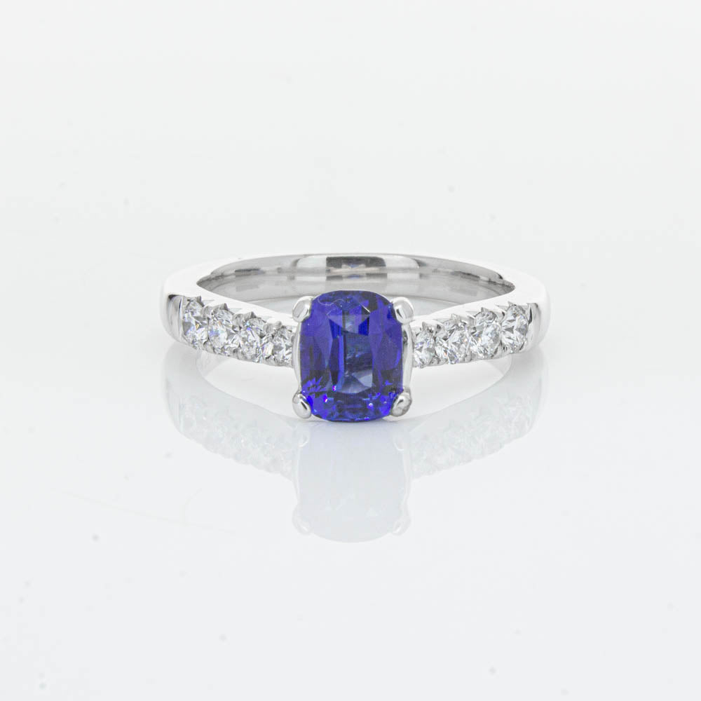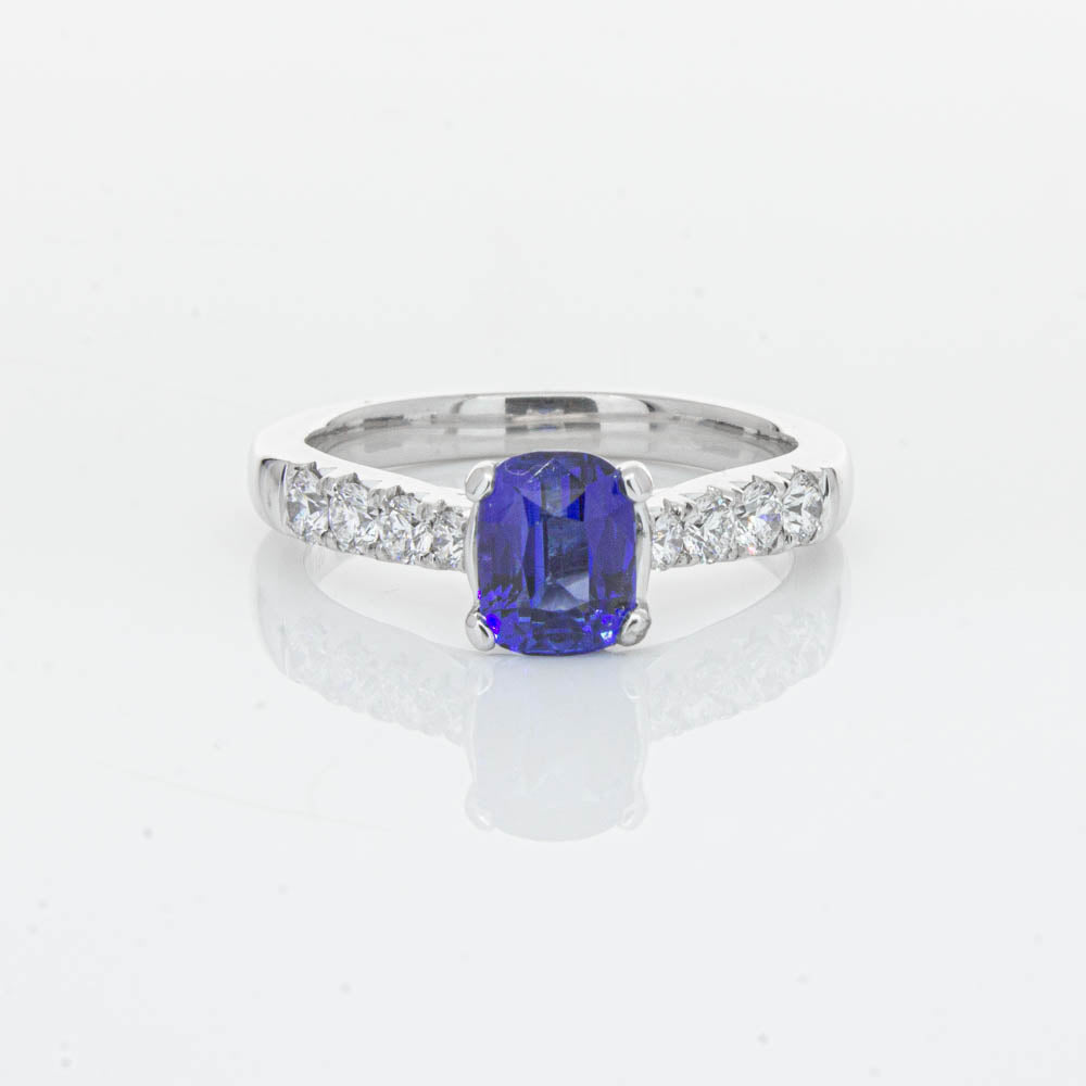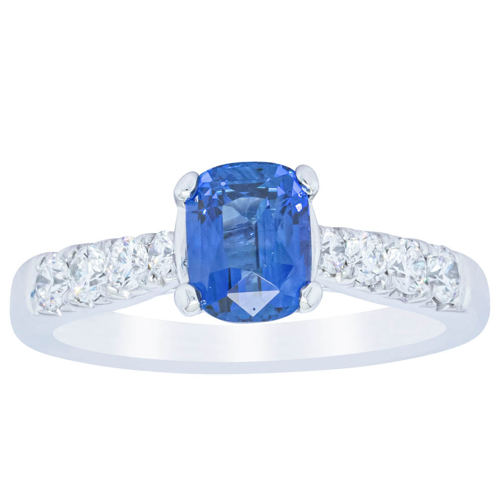 This sparkling new addition to our luxe 1899 Phoenix collection features one twinkling cushion faceted blue sapphire highlighted by dazzling shoulder diamonds.