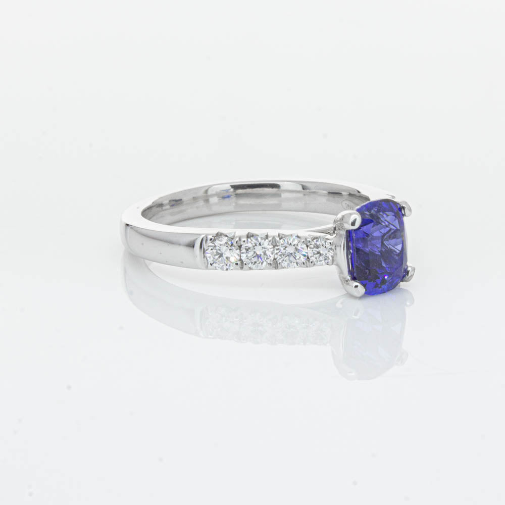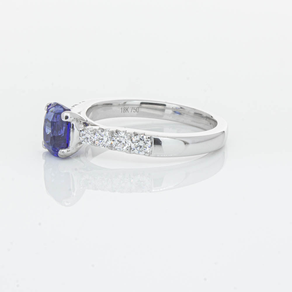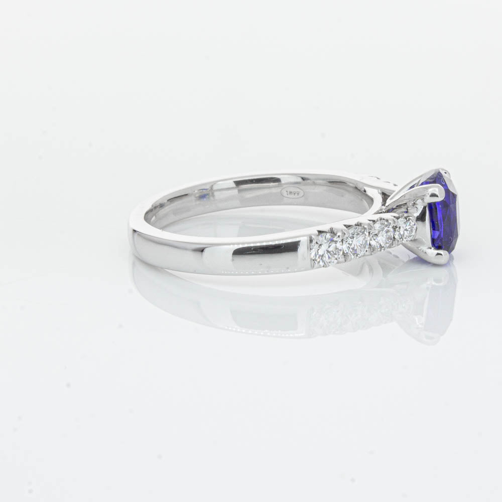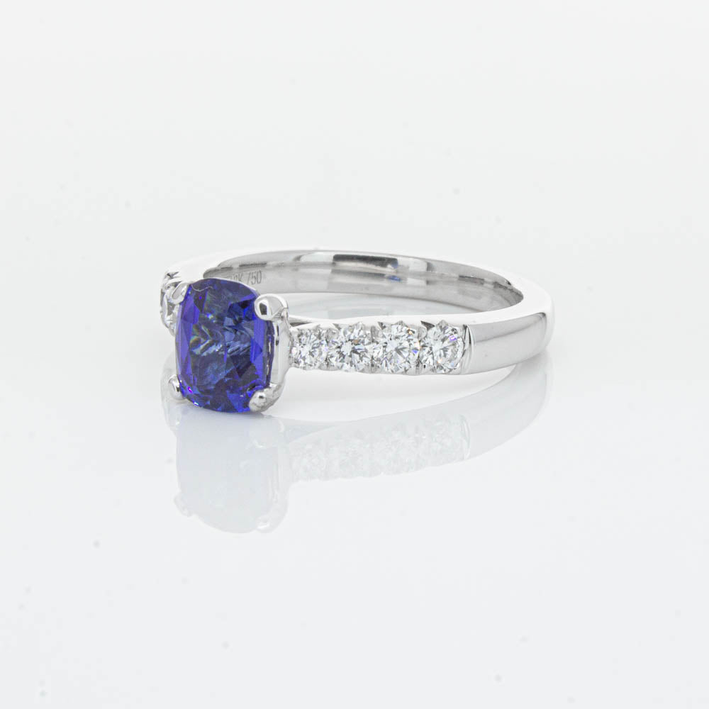 This sparkling new addition to our luxe 1899 Phoenix collection features one twinkling cushion faceted blue sapphire highlighted by dazzling shoulder diamonds.