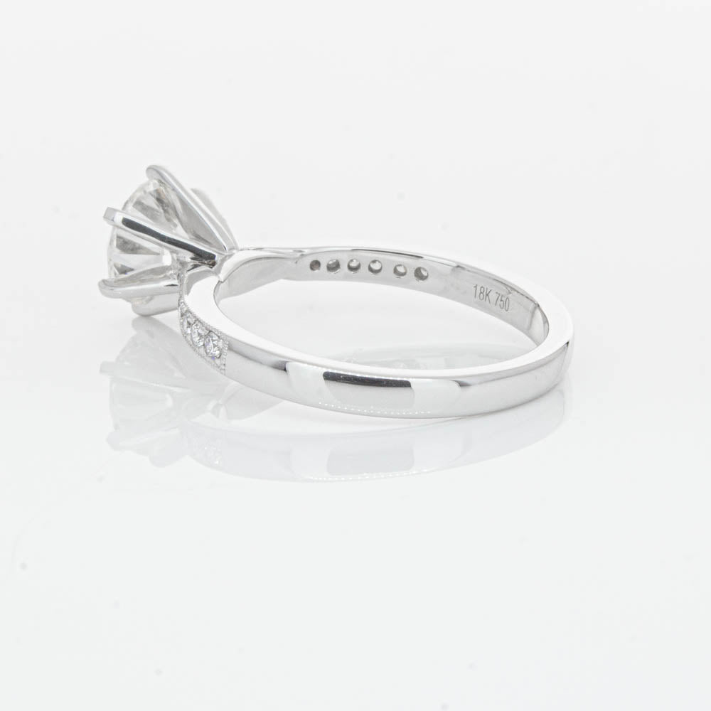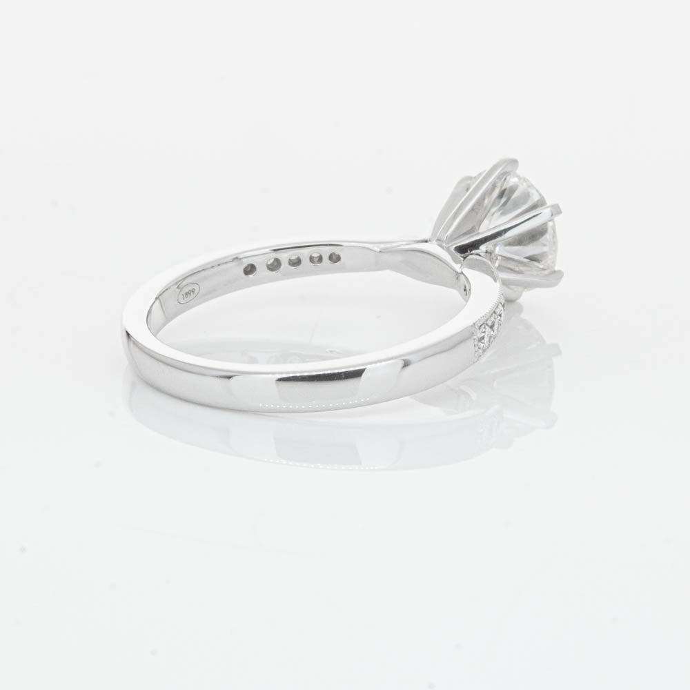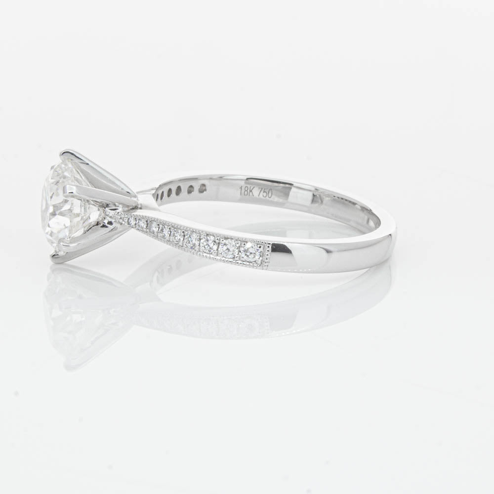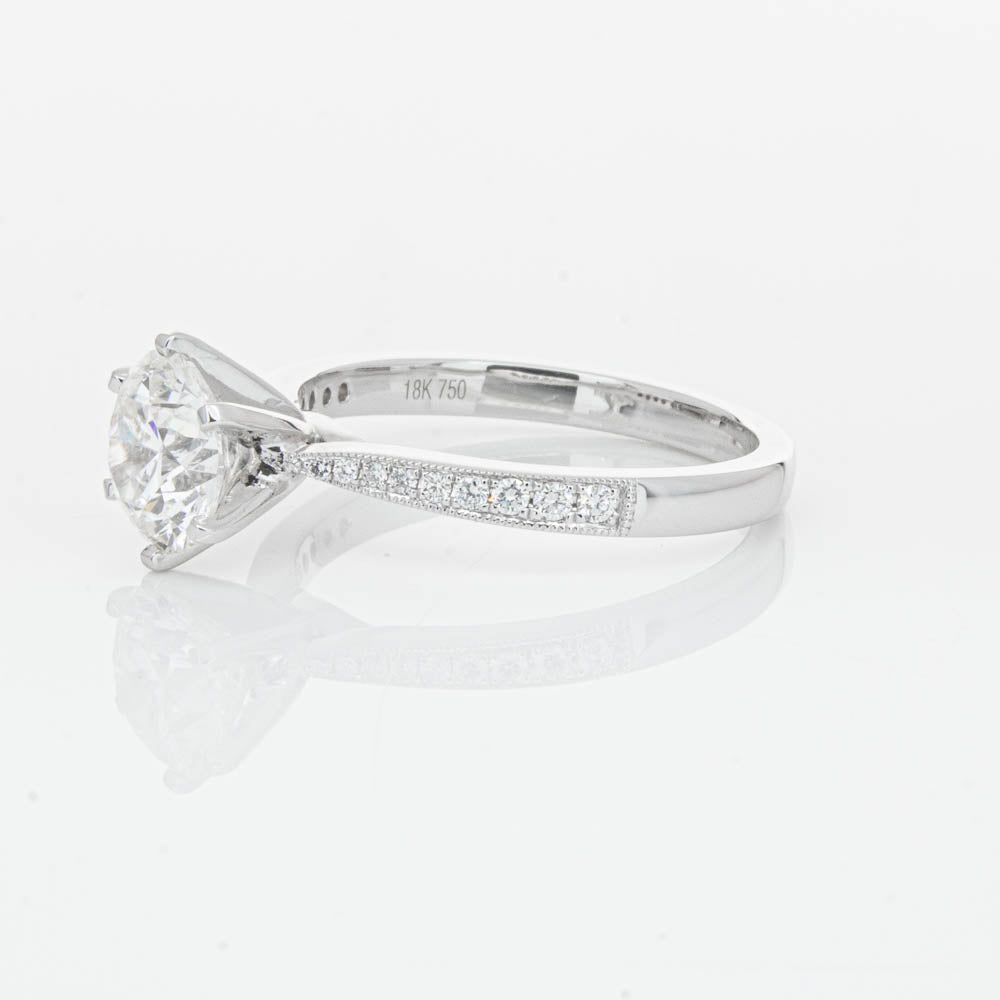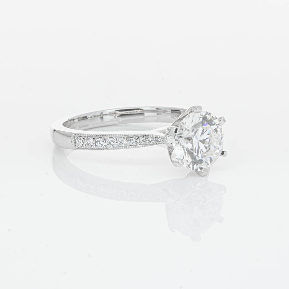 A delicate diamond set band with milgrain detailing, tapers towards the zenith to showcase a sparkling diamond.