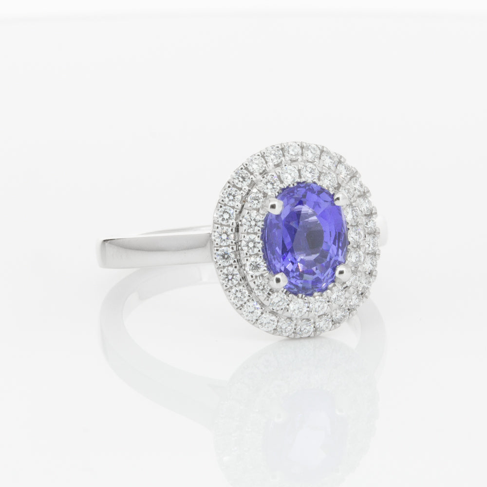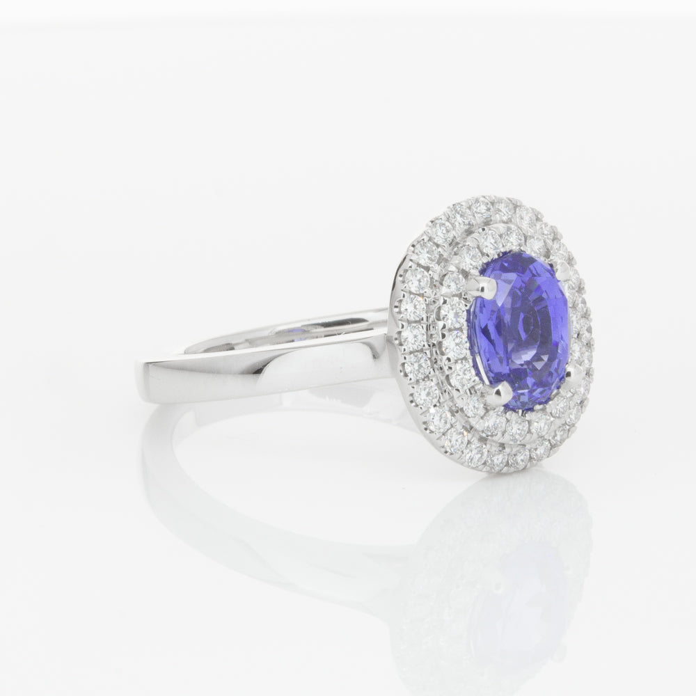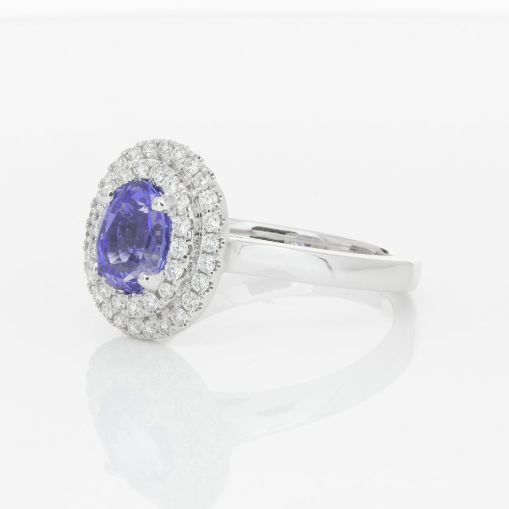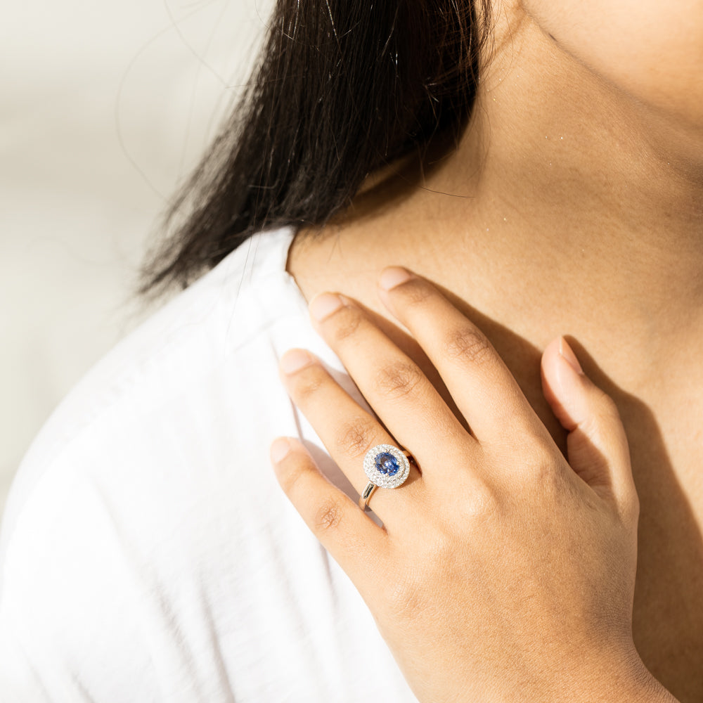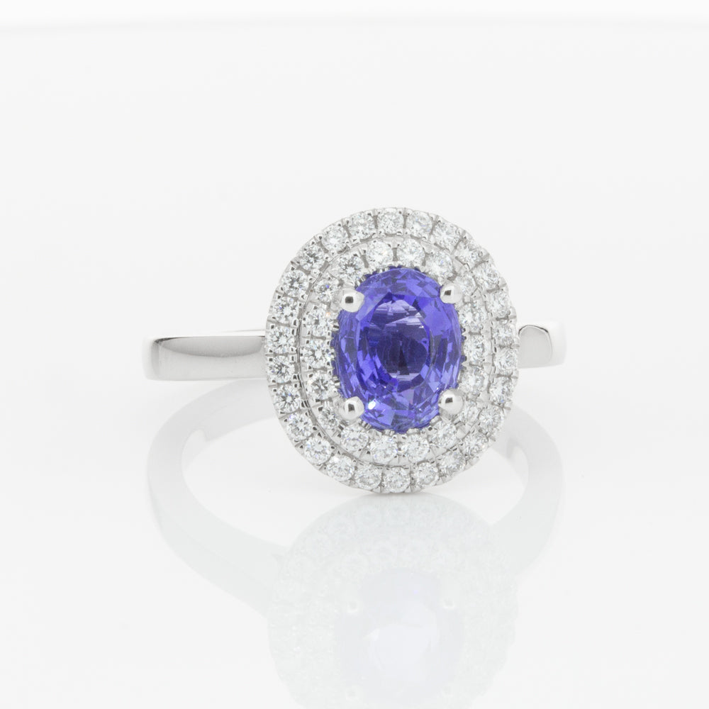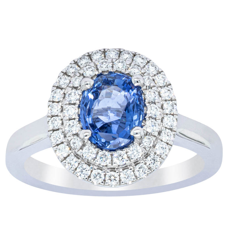 18ct white gold ring featuring one oval cut sapphire framed by a two tier halo of dazzling white diamonds.