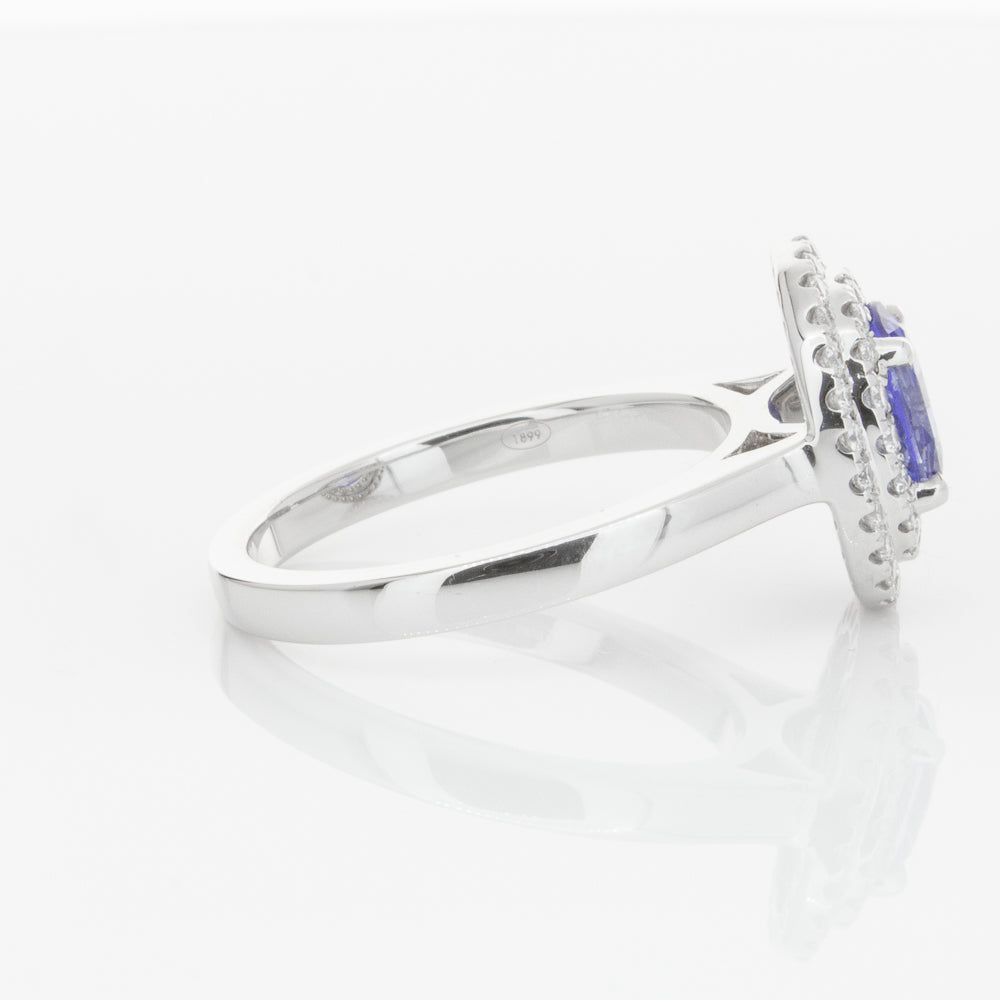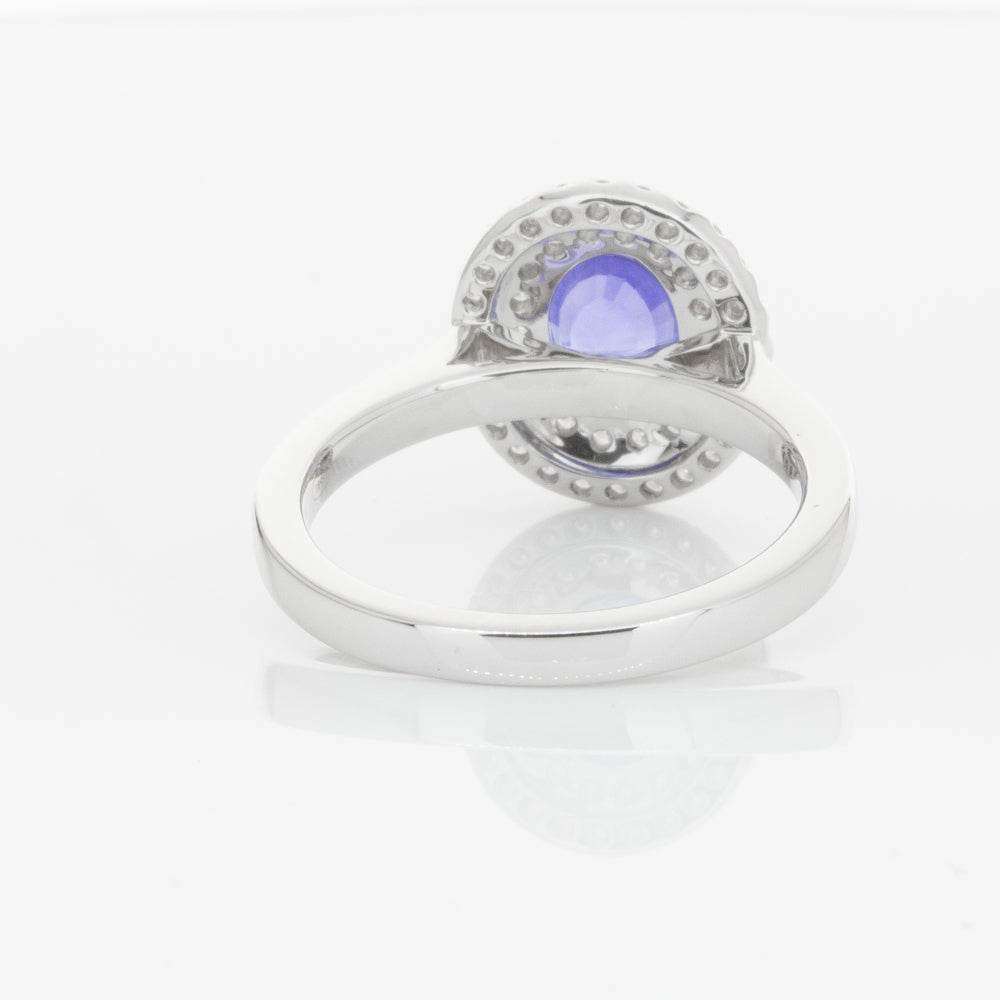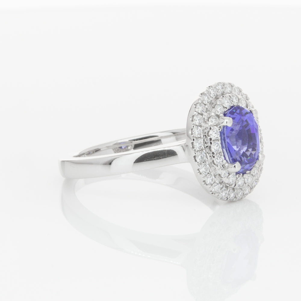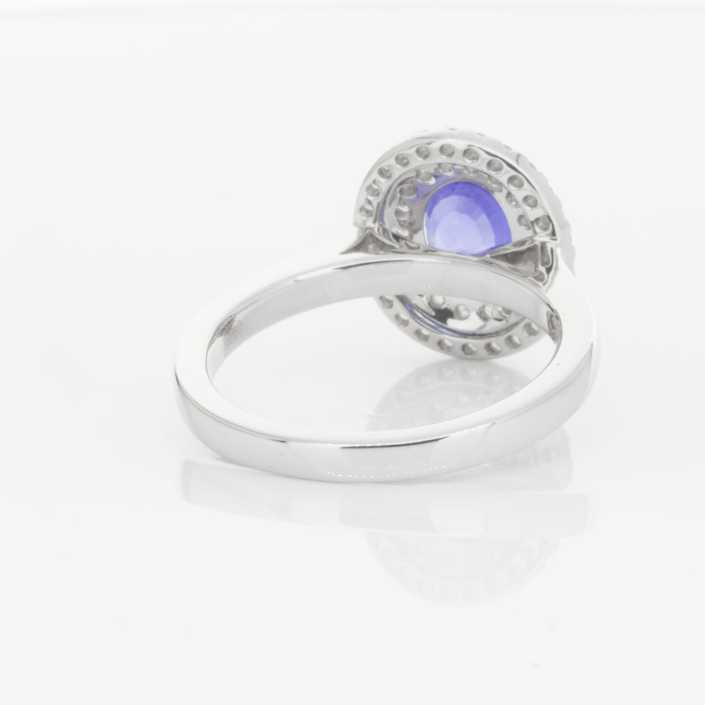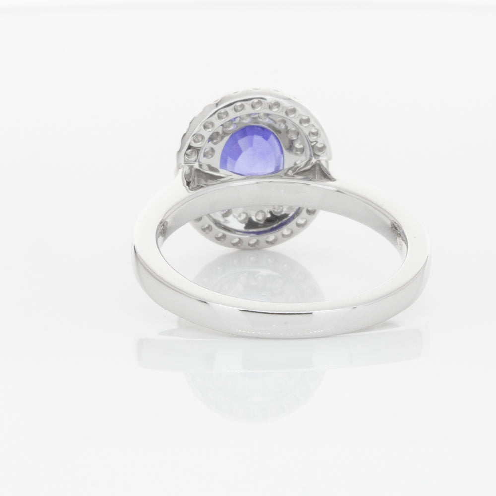 18ct white gold ring featuring one oval cut sapphire framed by a two tier halo of dazzling white diamonds.