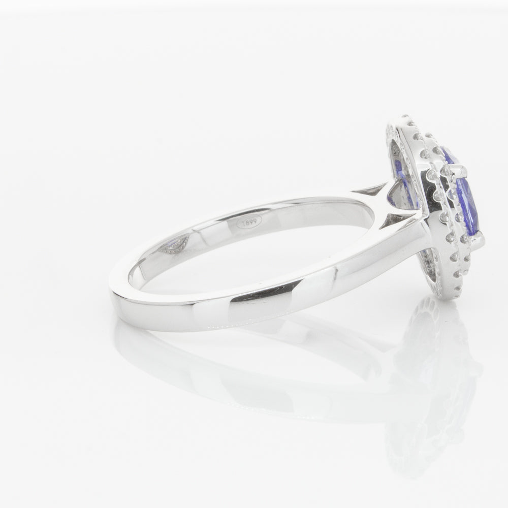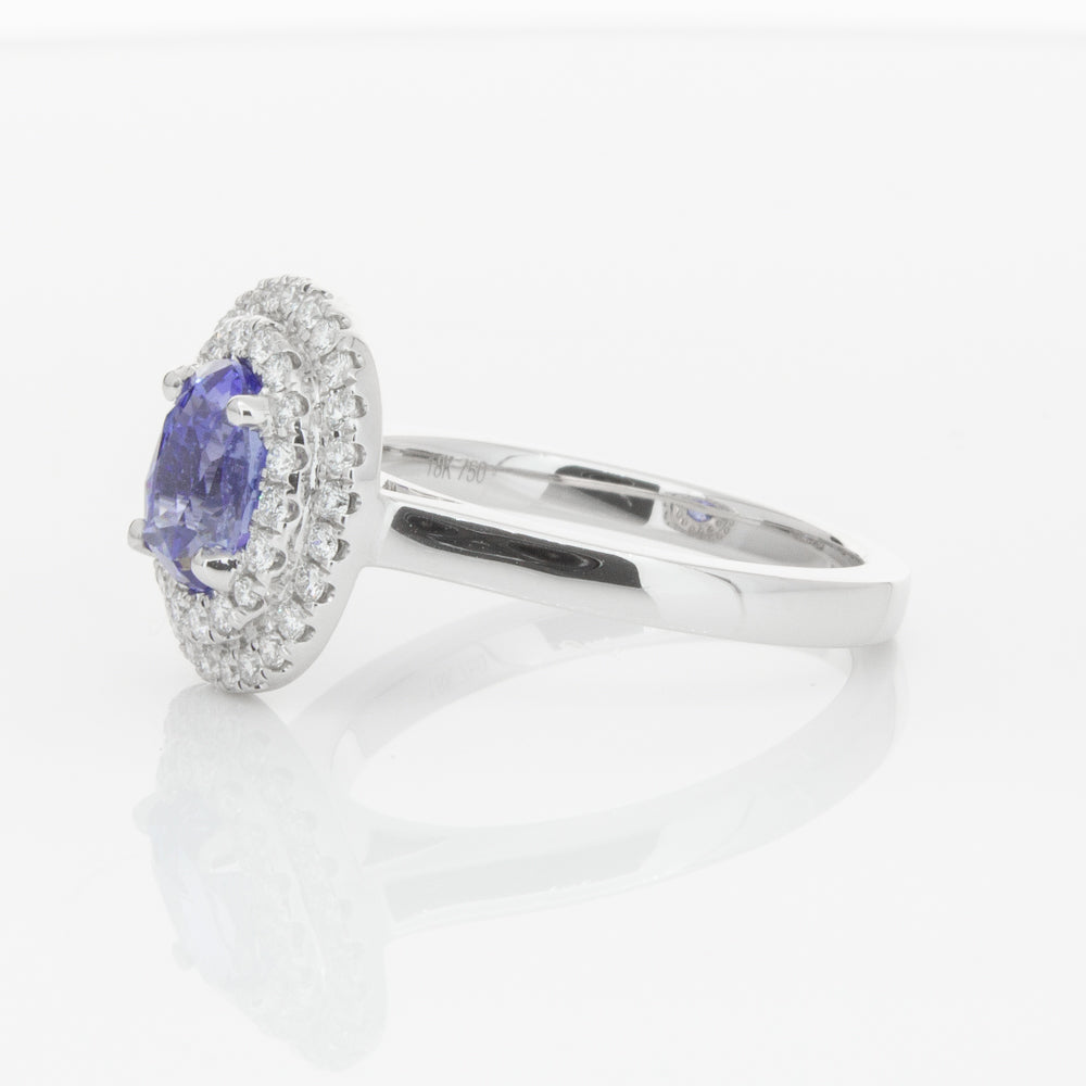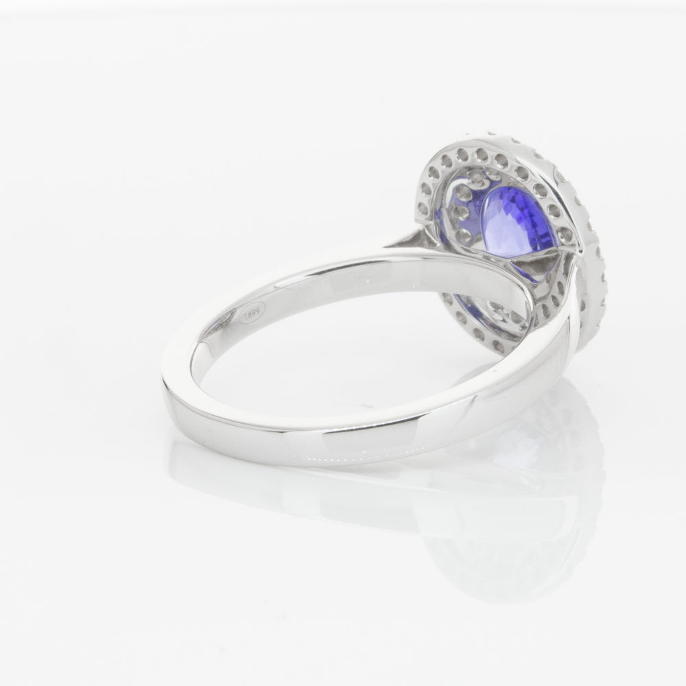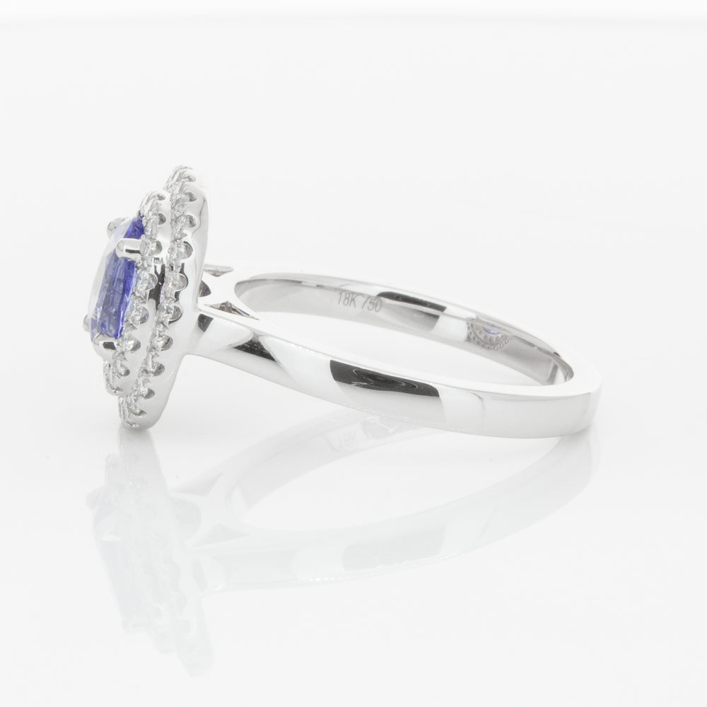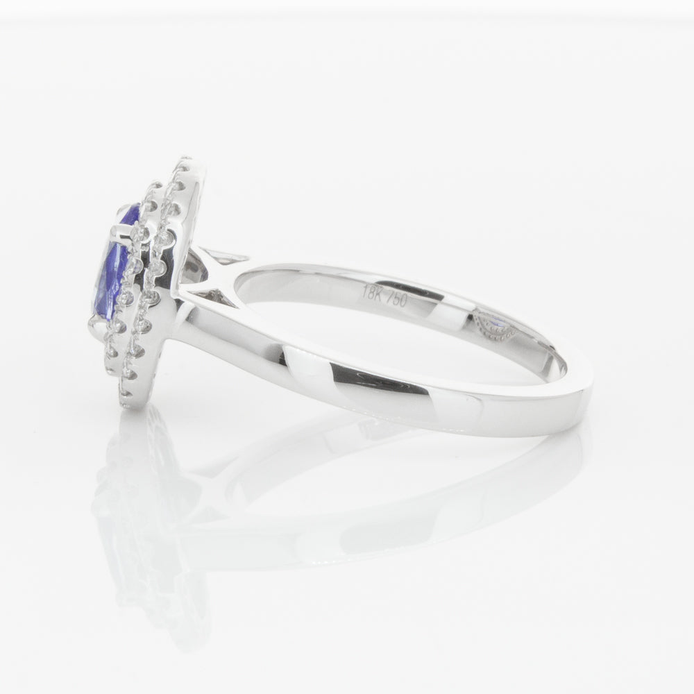 18ct white gold ring featuring one oval cut sapphire framed by a two tier halo of dazzling white diamonds.
