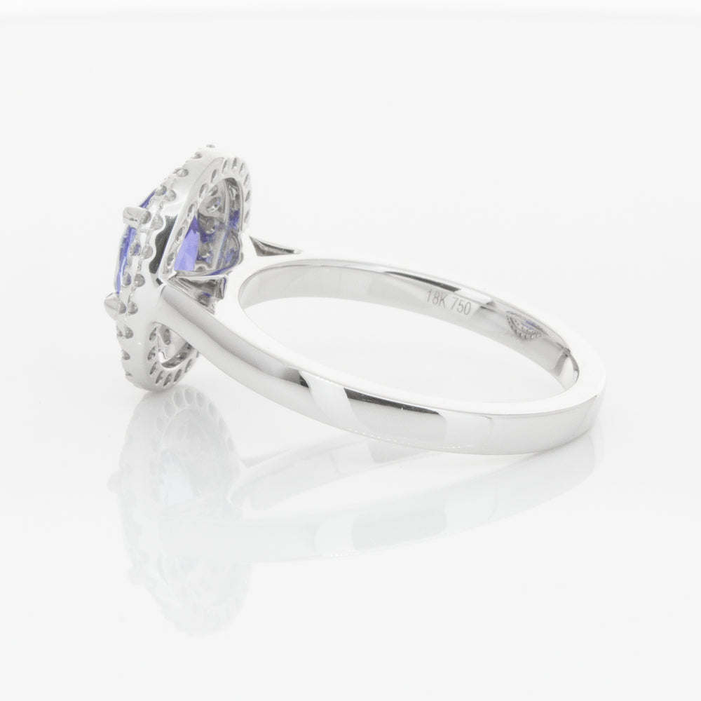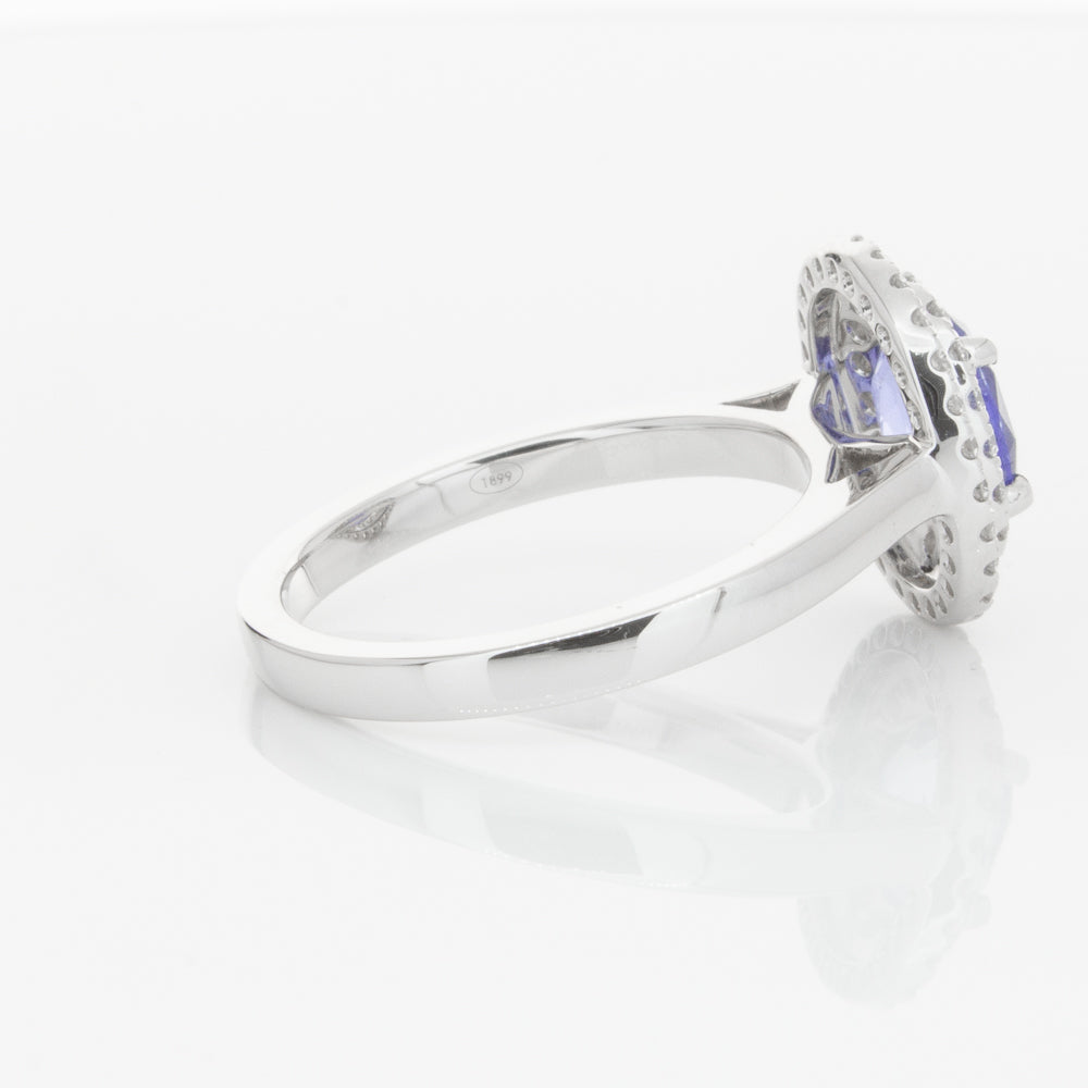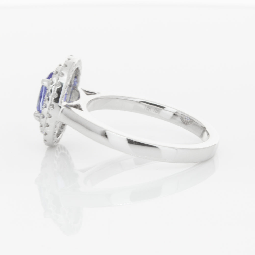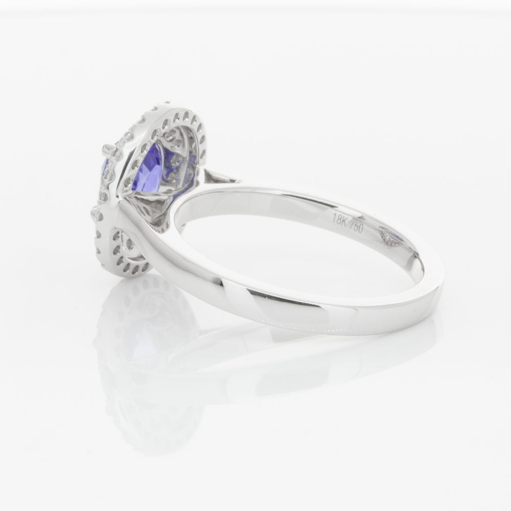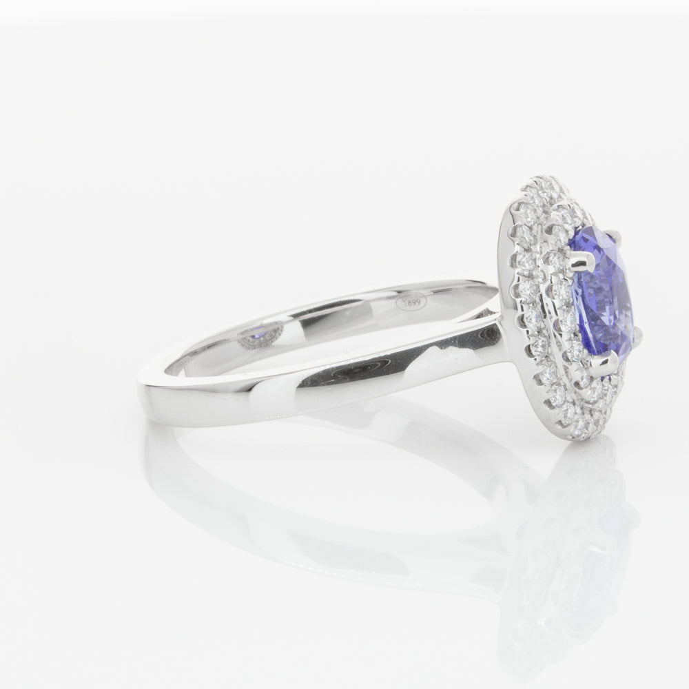 18ct white gold ring featuring one oval cut sapphire framed by a two tier halo of dazzling white diamonds.