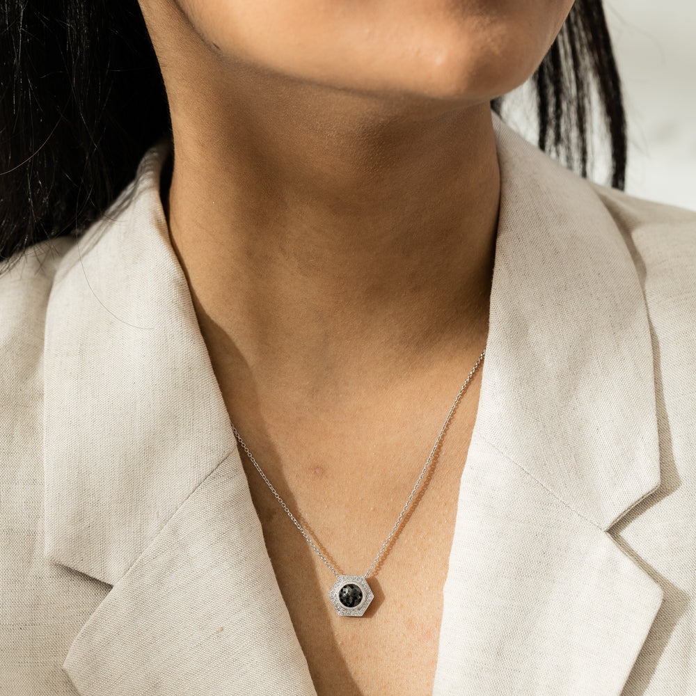 Exceptionally set in beautiful 18ct white gold, this stunning pendant features one rose cut black diamond framed by a delicate white diamond halo.