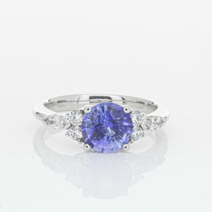 “This exquisite ring features a natural 1.80ct round sapphire in a captivating cornflower blue, reminiscent of a clear early-morning spring sky. Displaying exceptional light return, the sapphire’s brilliance is a result of its rare crystal structure and the expert craftsmanship applied during cutting. Set in our signature high palladium 18ct white gold in our Oriana design, the sapphire is complemented by tapering natural mixed cut diamonds that gracefully lead to a polished solid band. A considered design capturing the enduring allure of fine gemstones. - Joseph Tattersfield