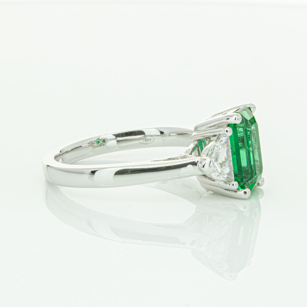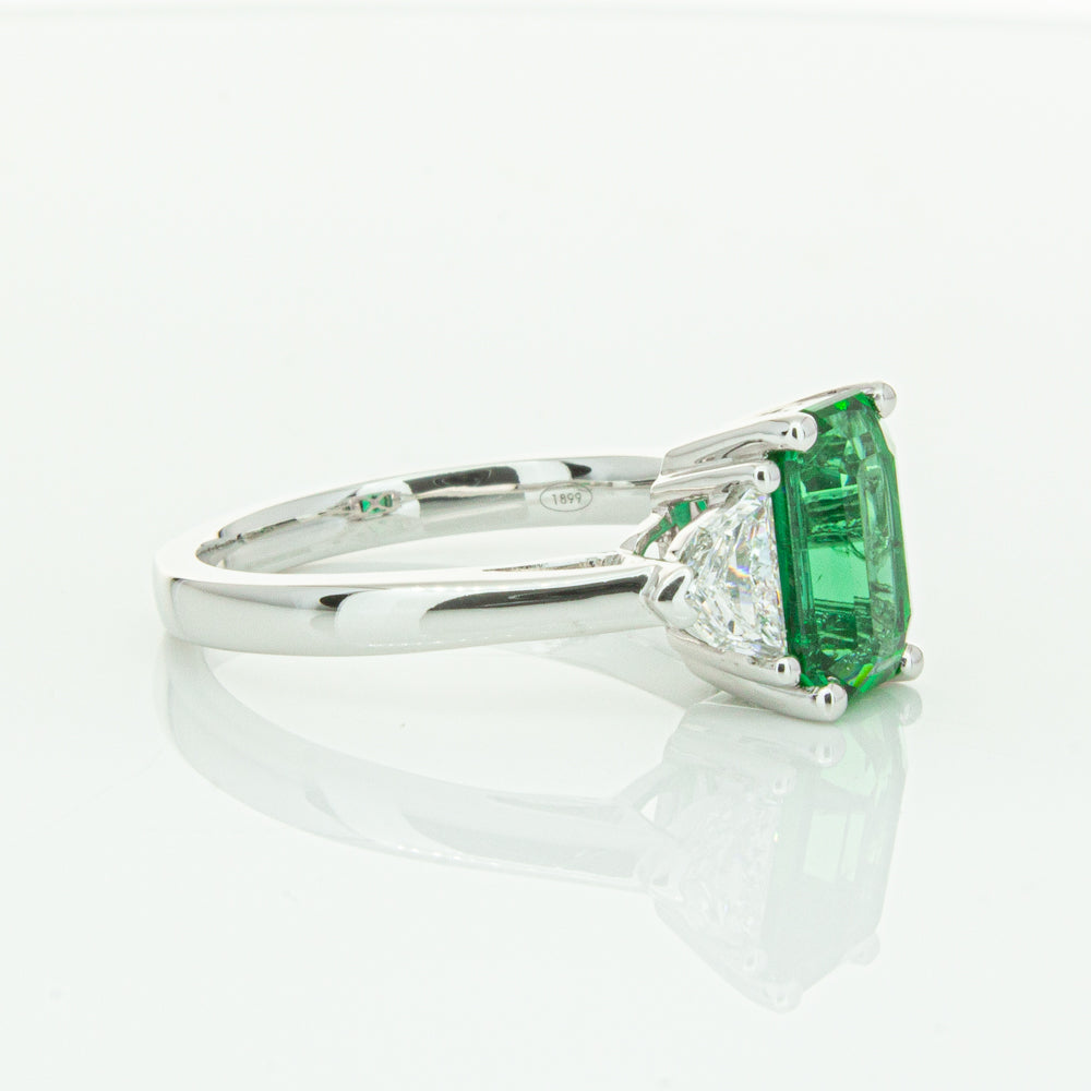 An outstandingly clean emerald of strong colour and dynamic light return is coupled with our first employment of “Cadillac” side diamonds adding an attractive softness. Gently tapered shoulders lead to a rounded profile band all in Walker & Hall’s signature high palladium 18ct white gold.