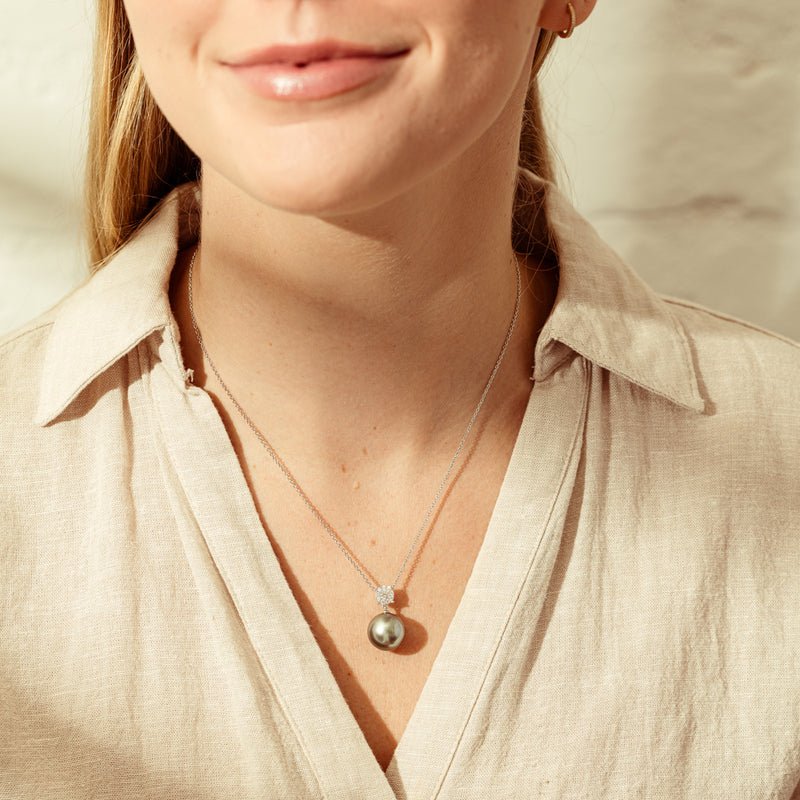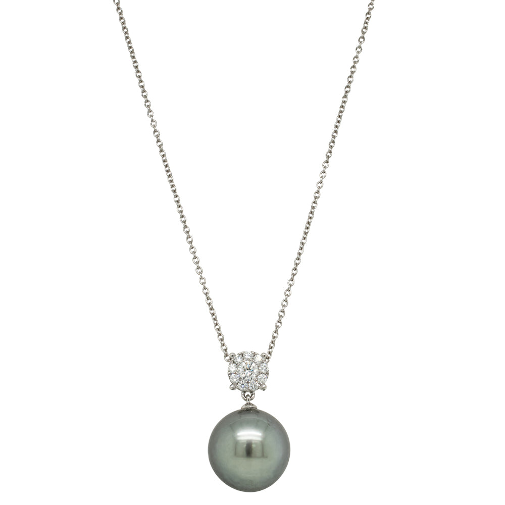 This beautiful 18ct white gold pendant features one cultured black pearl with ten round brilliant cut diamonds.