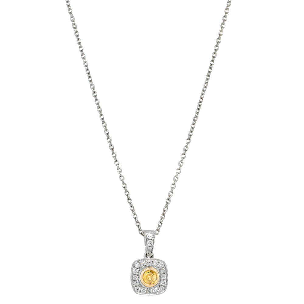 From our 1899 collection, this radiant pendant is crafted from 18ct white gold with a ring of 18ct yellow gold millgrain setting for the centre yellow diamond. The diamond set pendant and bail sparkles against the golden diamond for enhanced glamour.
