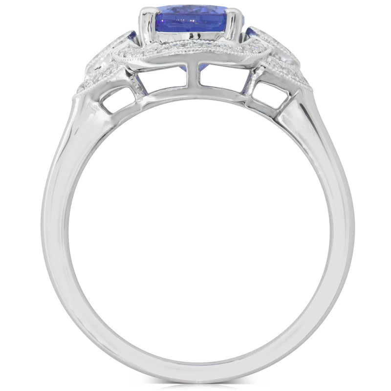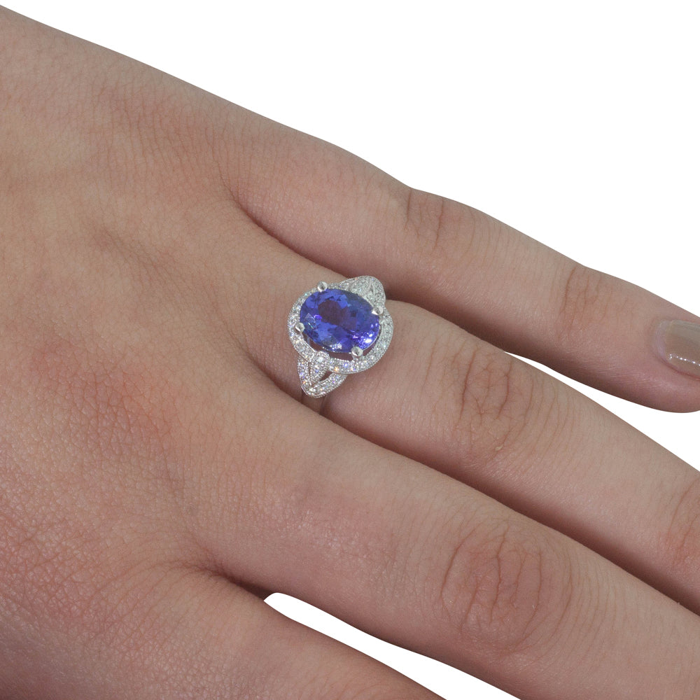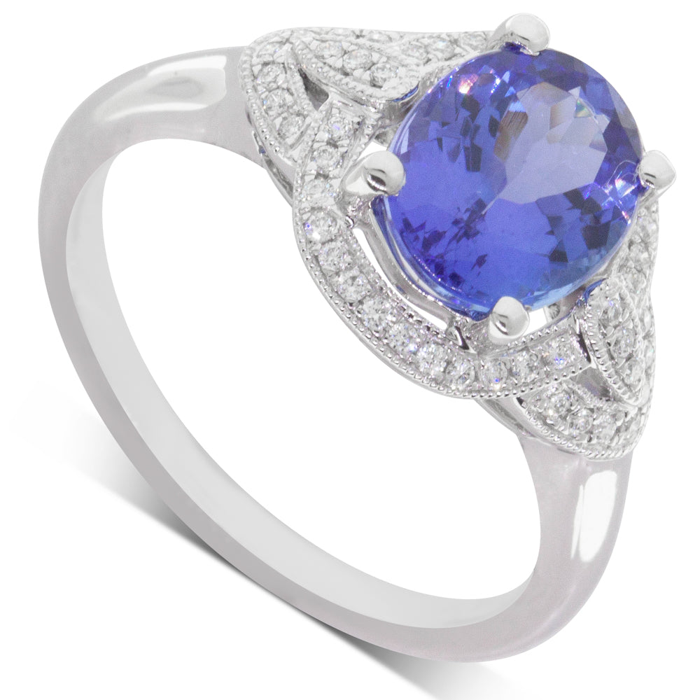 Shower her in sparkles with this mesmerising tanzanite and diamond halo ring. Crafted beautifully in 18ct white gold this stunning ring boasts a shimmering oval faceted tanzanite framed by a halo of round brilliant cut diamonds. With diamond set shoulders to complete a vision of elegance, this ring is sure to impress.