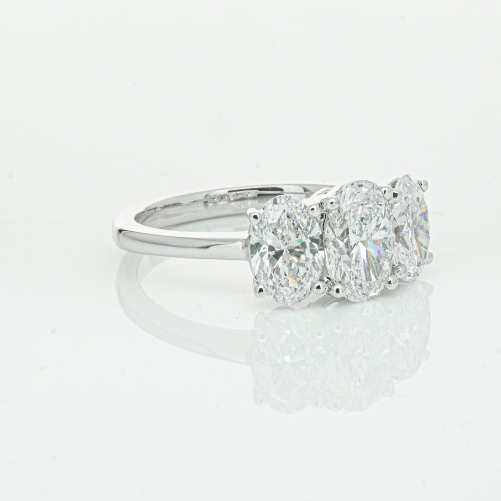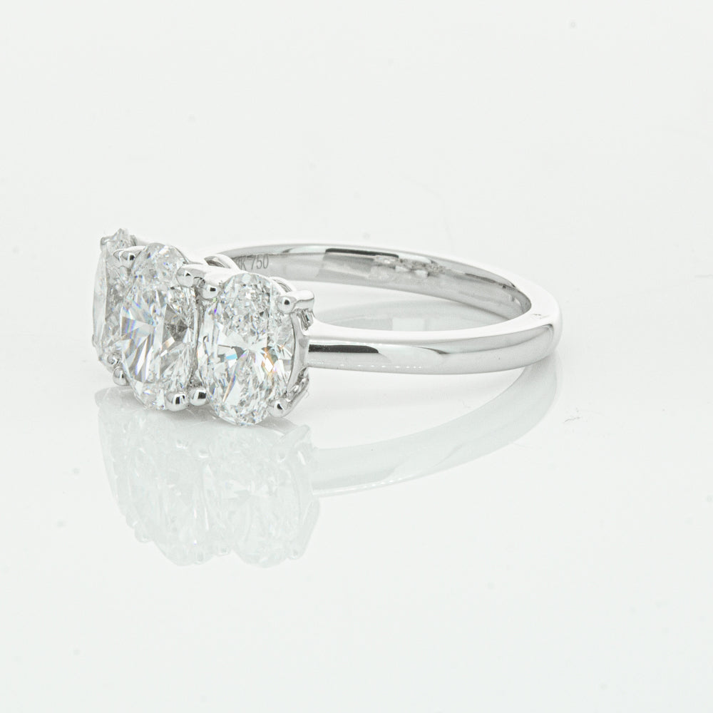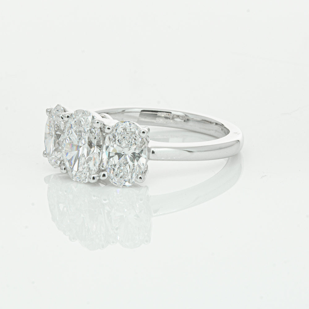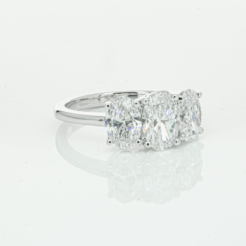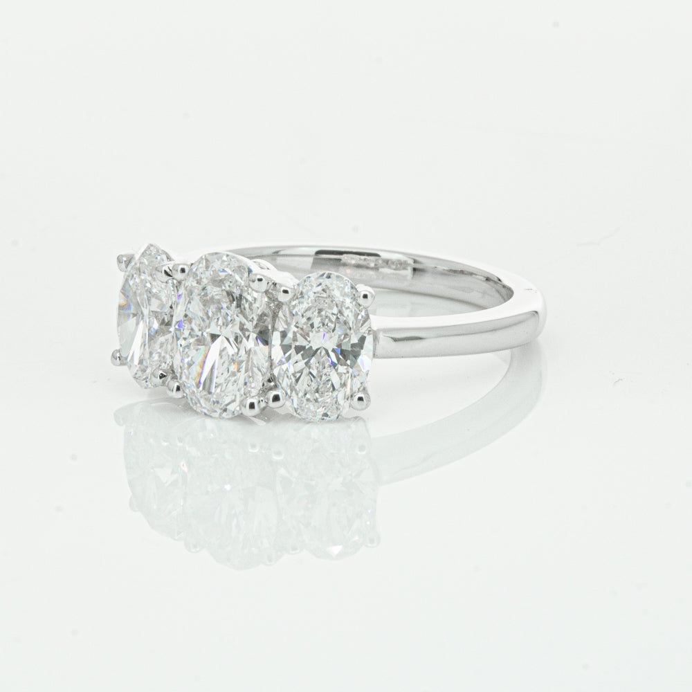 This exquisite oval diamond graduated three stone ring demonstrates sophisticated design at its finest. The refined band is crafted from our high palladium 18 carat white gold, providing enhanced wearability for a piece that deserves to be worn and enjoyed daily. Undeniably, the instant attraction is the trio of perfectly aligned brilliant oval shaped diamonds, each expertly cut and polished to bring out their unique brilliance and fire.