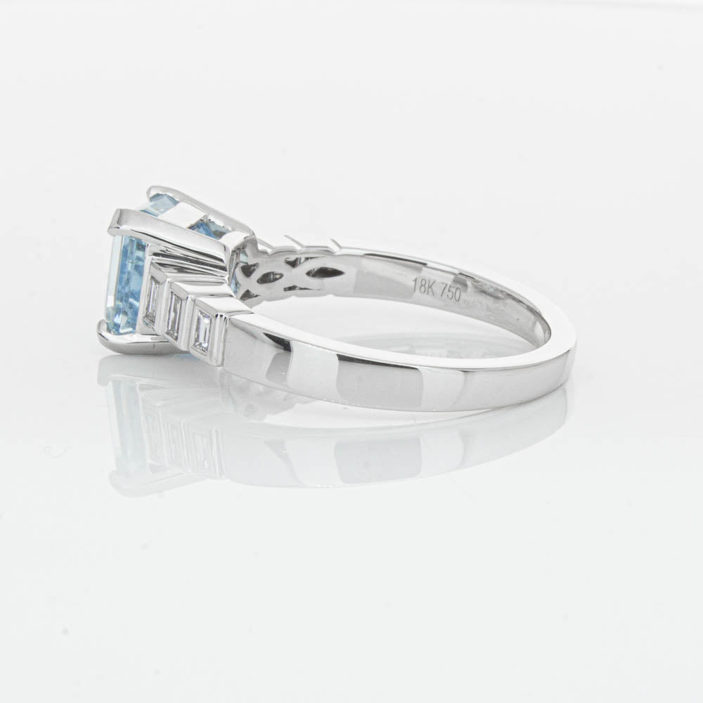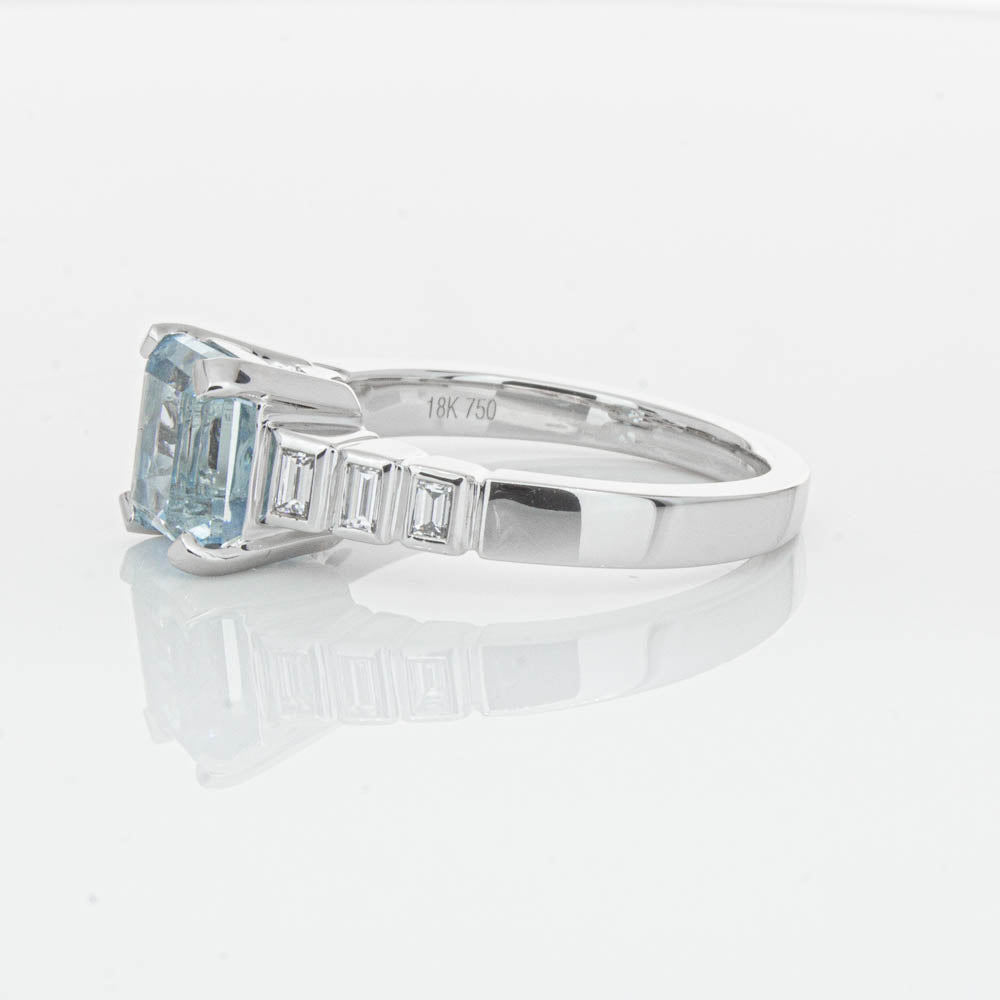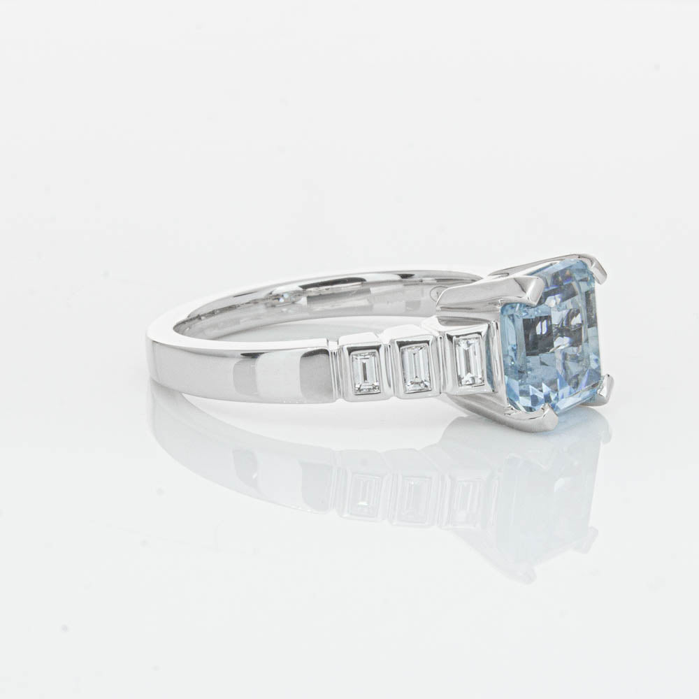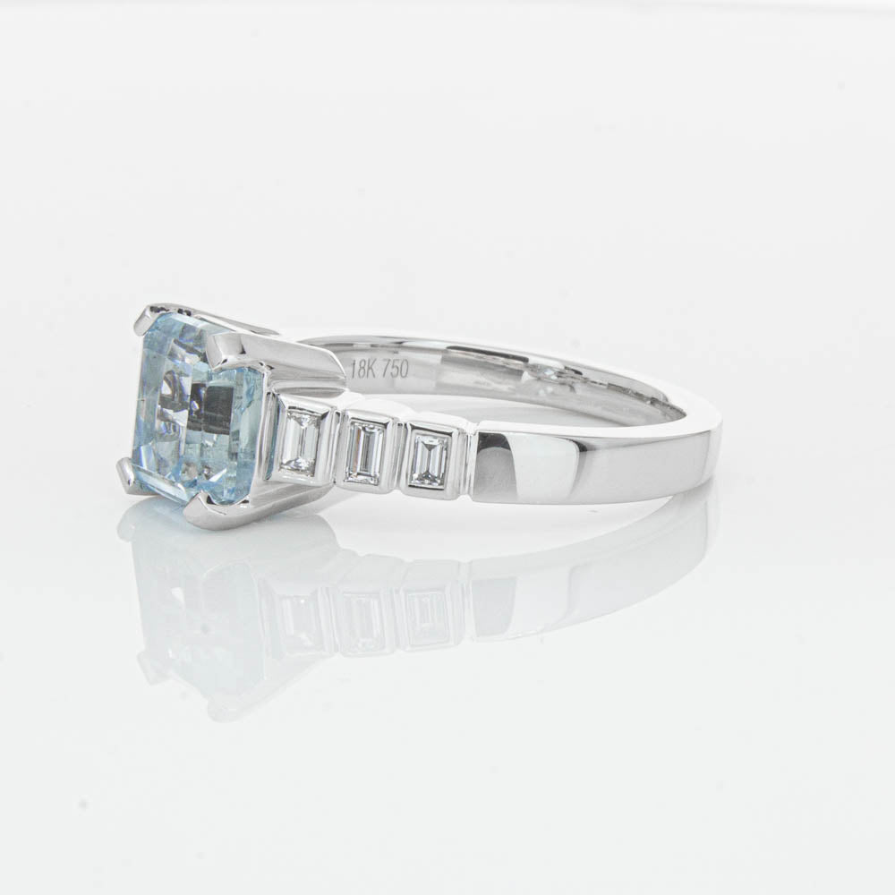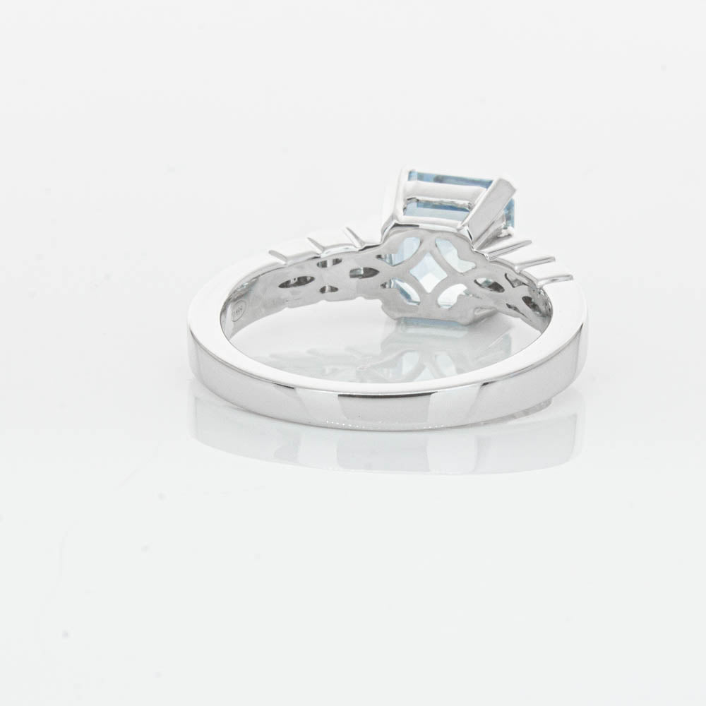 This gorgeous 18ct White Gold ring combines a stunning 2.48ct rectangular step cut aquamarine with sparkling diamond set shoulders. Perfect for special occasions or everyday wear, its sophisticated design and timeless beauty make it a truly remarkable piece.