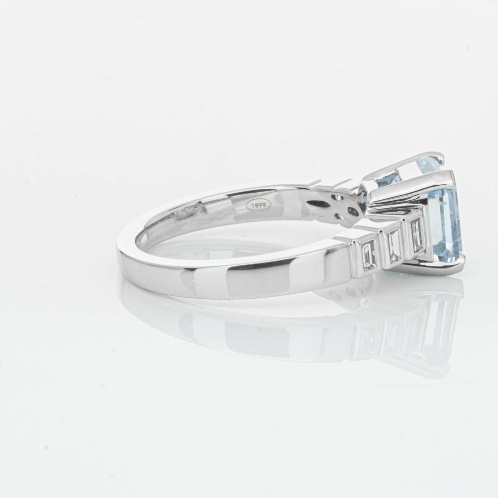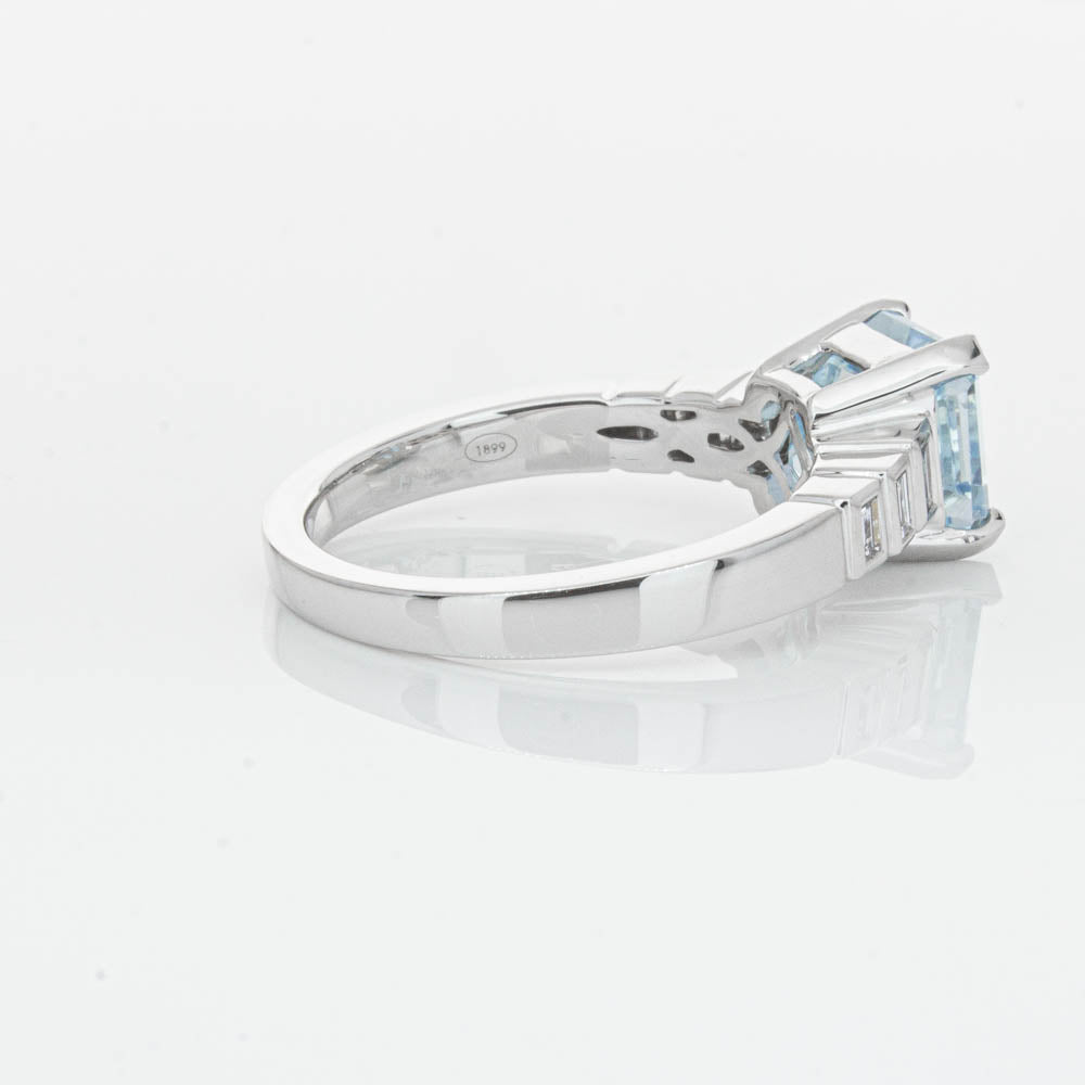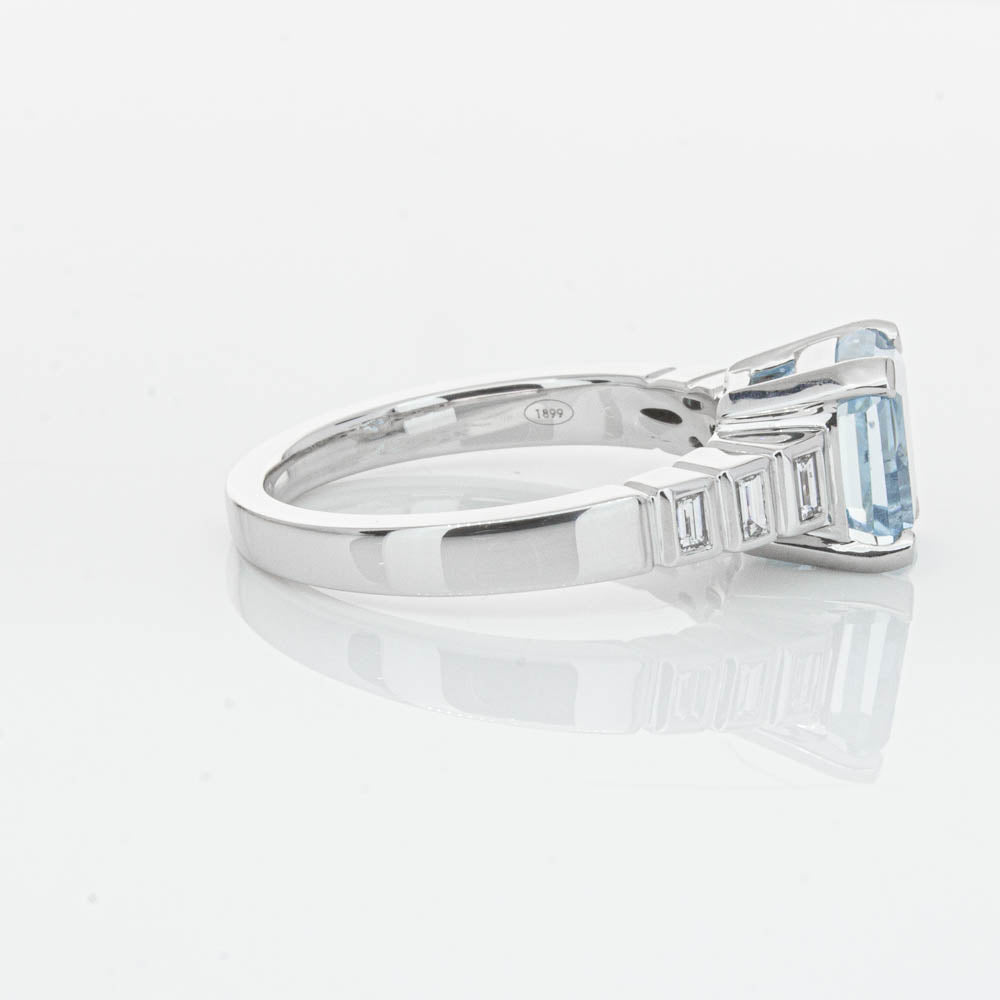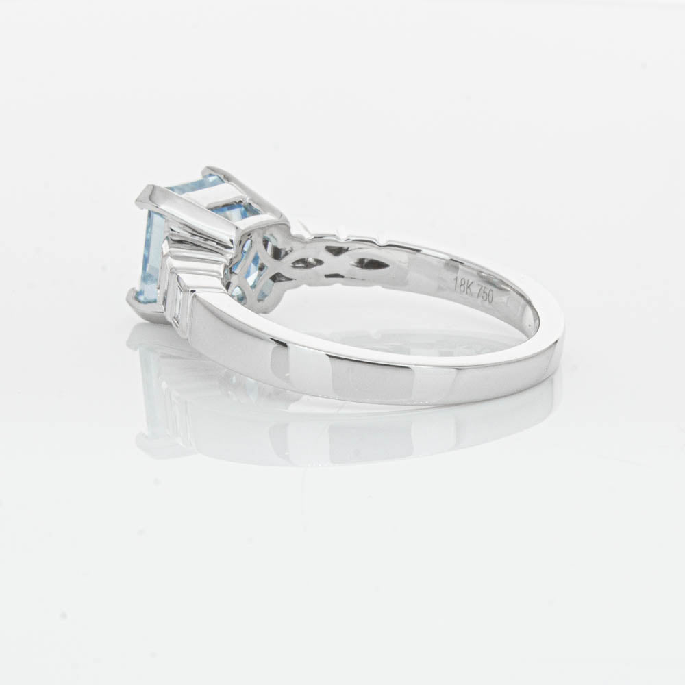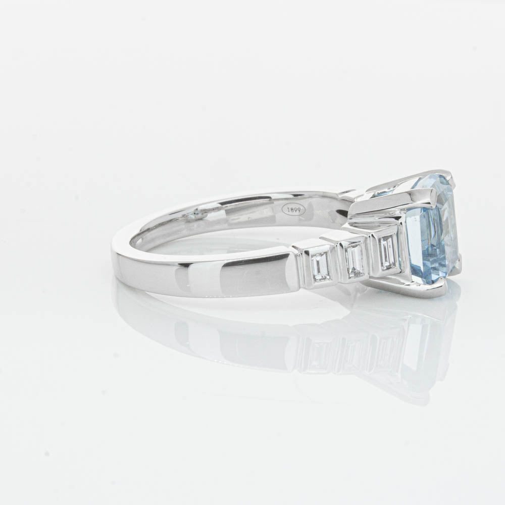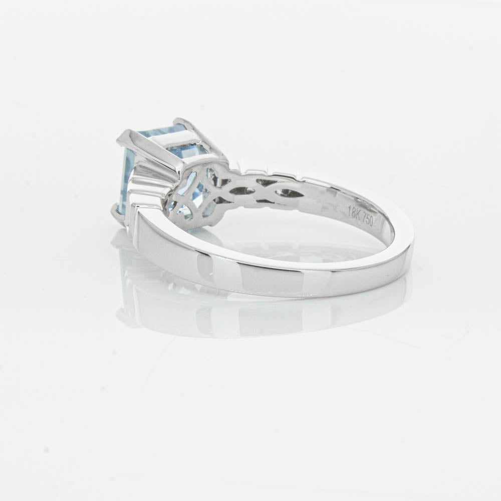 This gorgeous 18ct White Gold ring combines a stunning 2.48ct rectangular step cut aquamarine with sparkling diamond set shoulders. Perfect for special occasions or everyday wear, its sophisticated design and timeless beauty make it a truly remarkable piece.