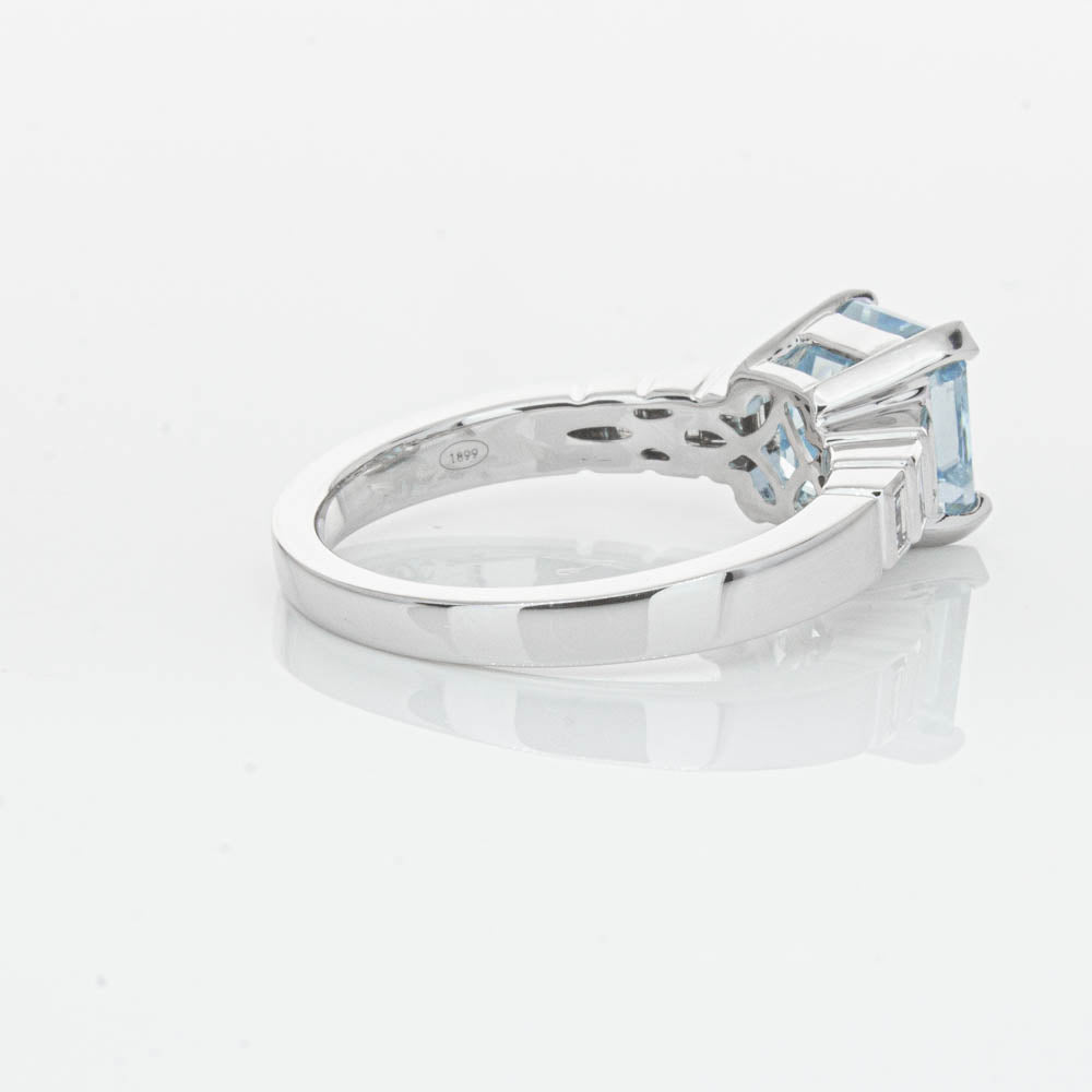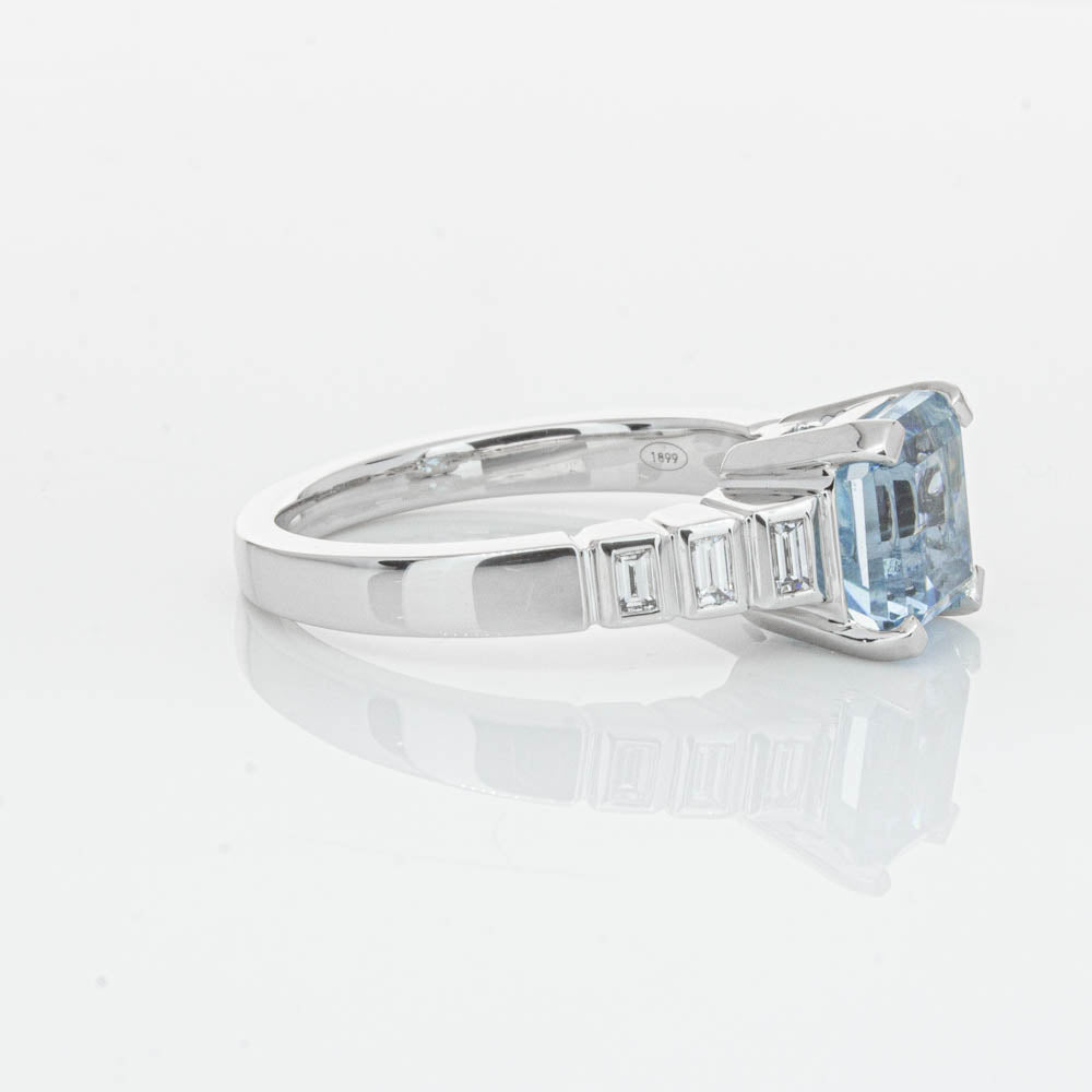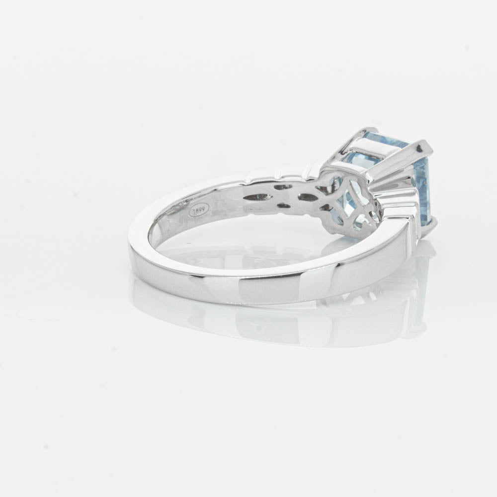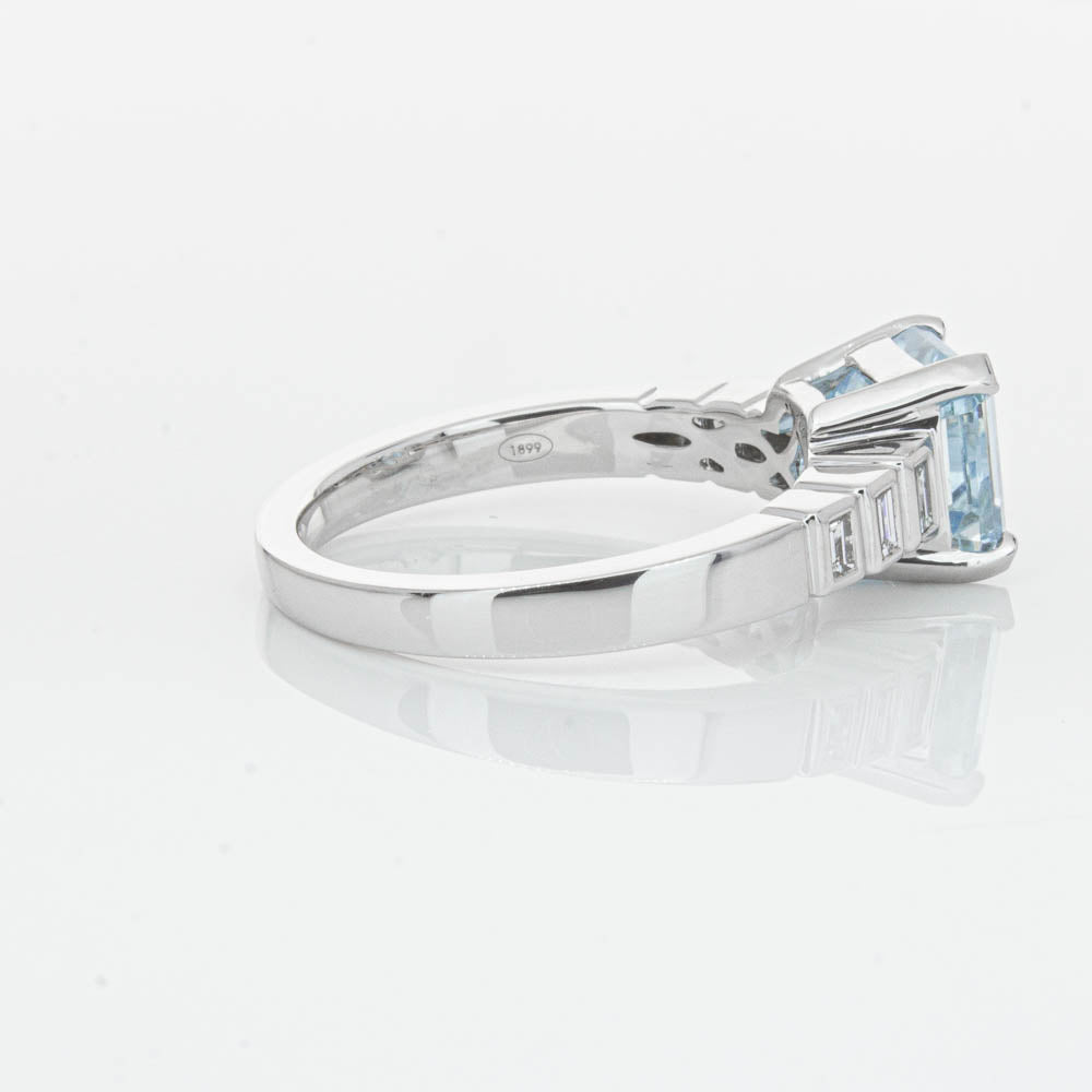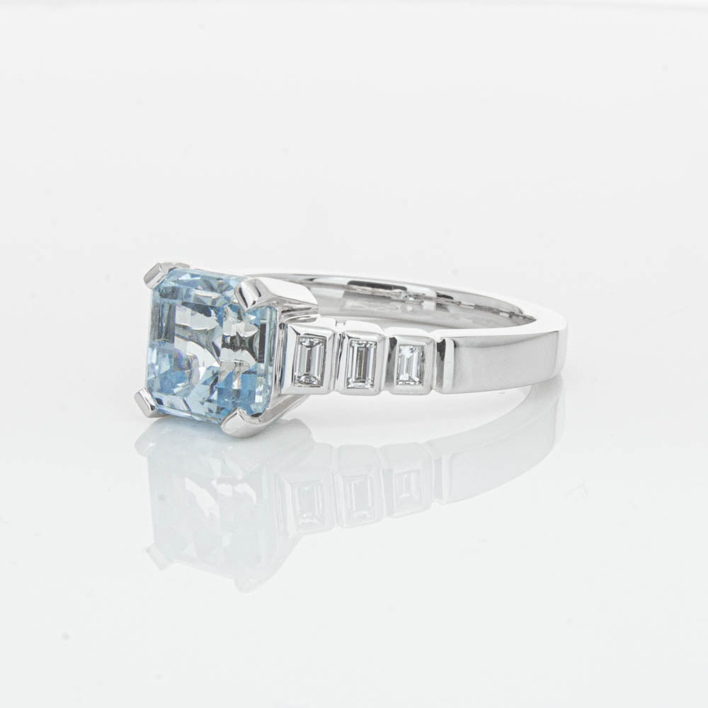 This gorgeous 18ct White Gold ring combines a stunning 2.48ct rectangular step cut aquamarine with sparkling diamond set shoulders. Perfect for special occasions or everyday wear, its sophisticated design and timeless beauty make it a truly remarkable piece.