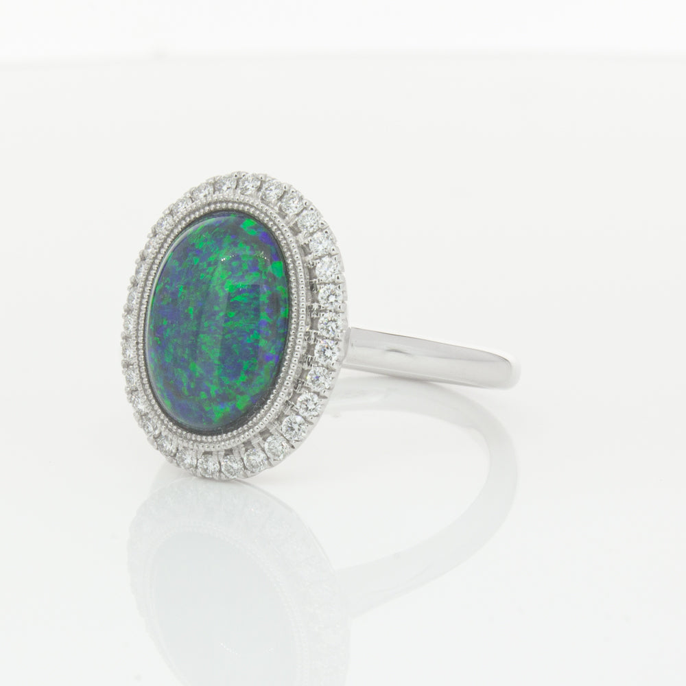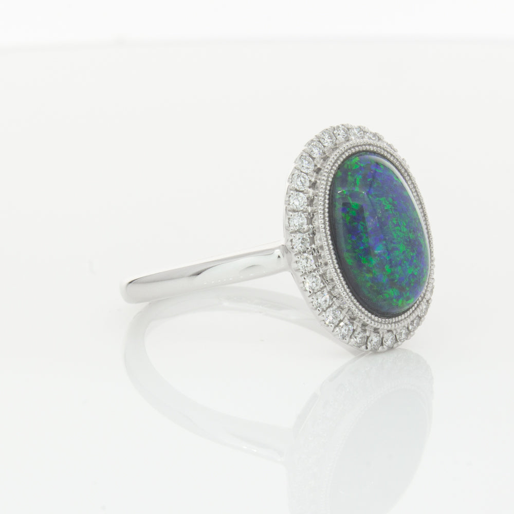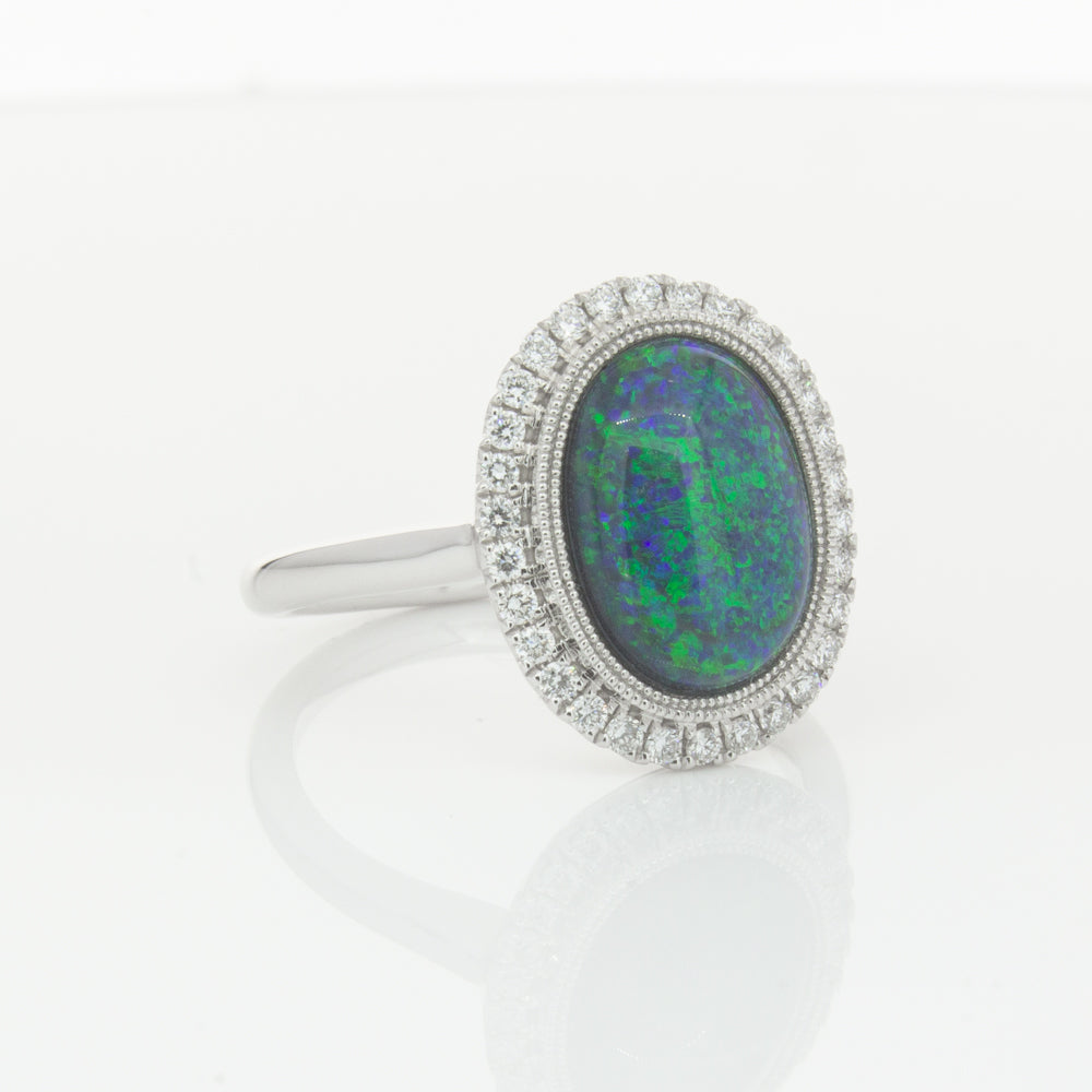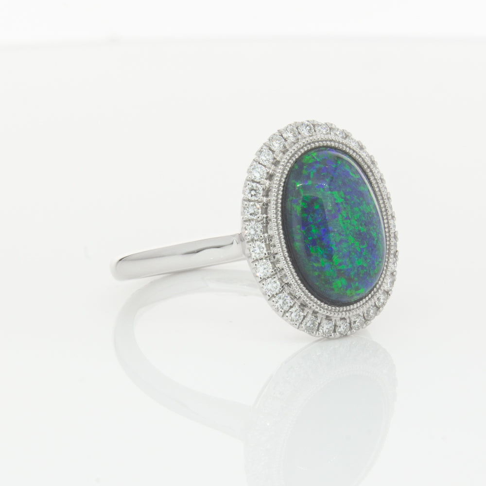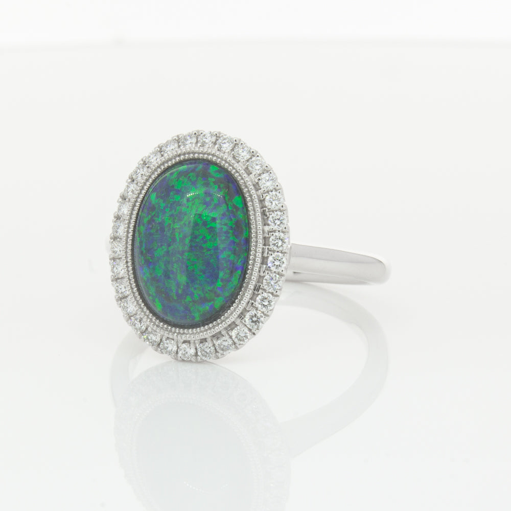 Feel wonderfully empowered with this truly superb and completely unique halo oval opal ring. Cleverly combining the strong flashes of blue and green of the black opal with highly sought after mosaic patterning, featuring a solid shank and diamond gallery of intricate beaded detailing. It also enjoys our hallmark quality, high palladium white gold setting that ensures lasting brilliance and sparkle.