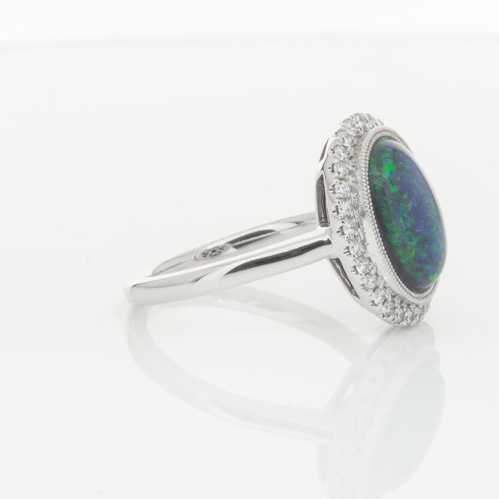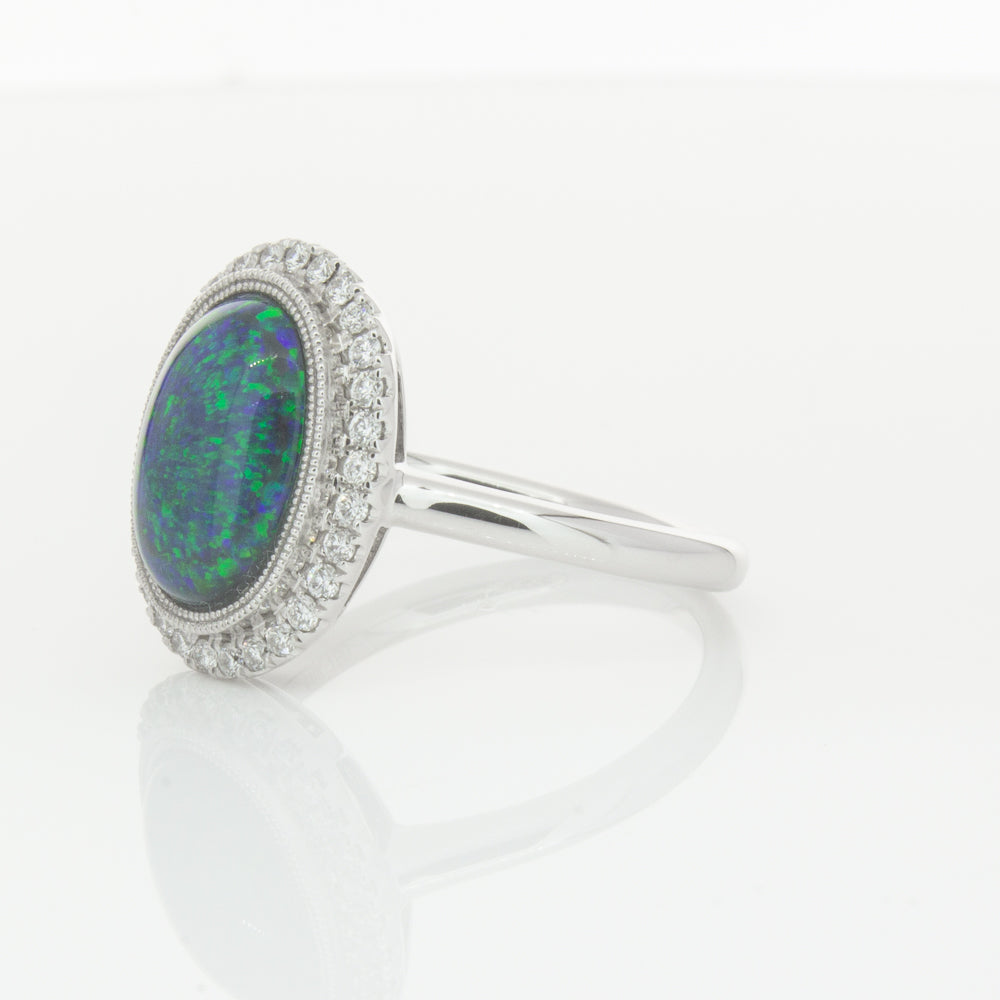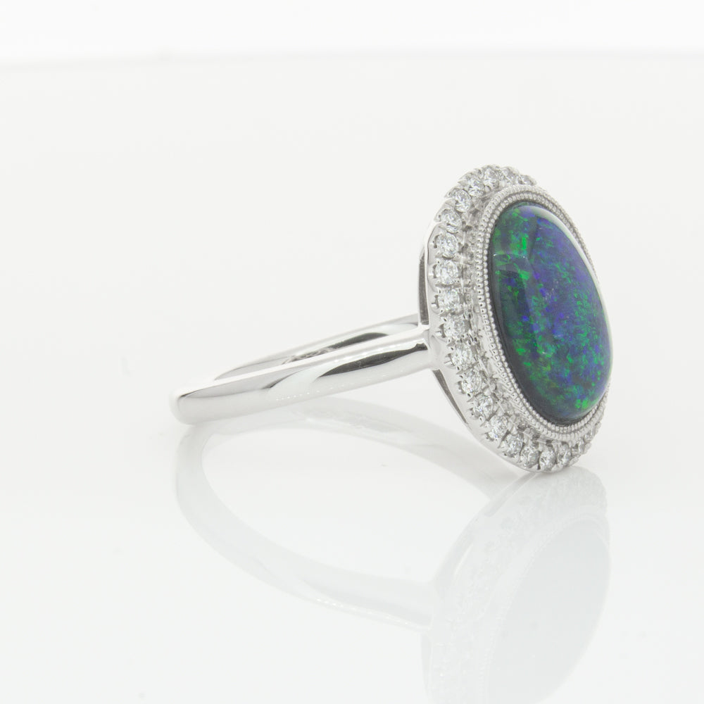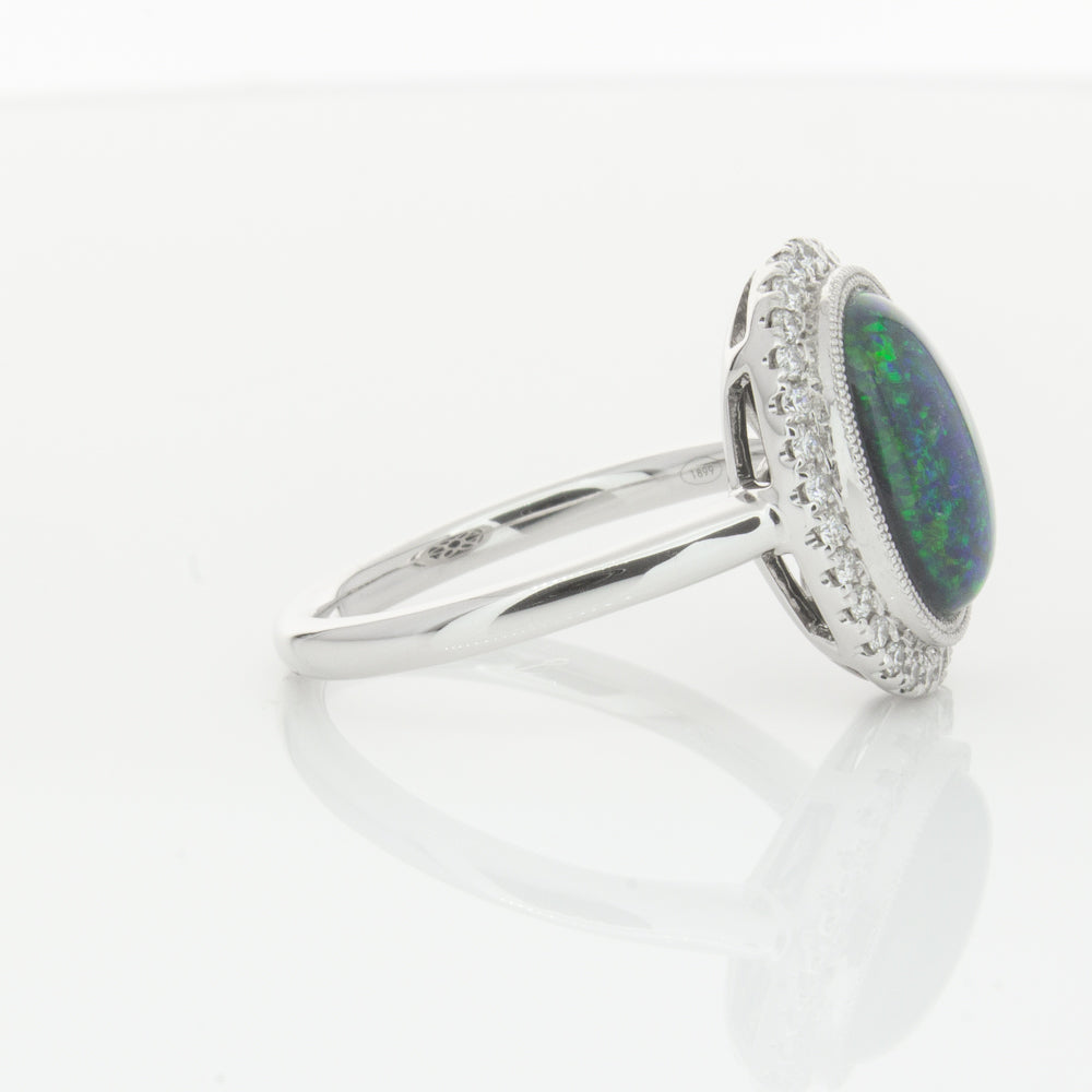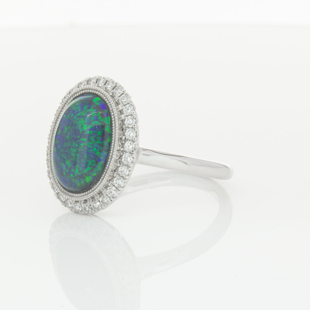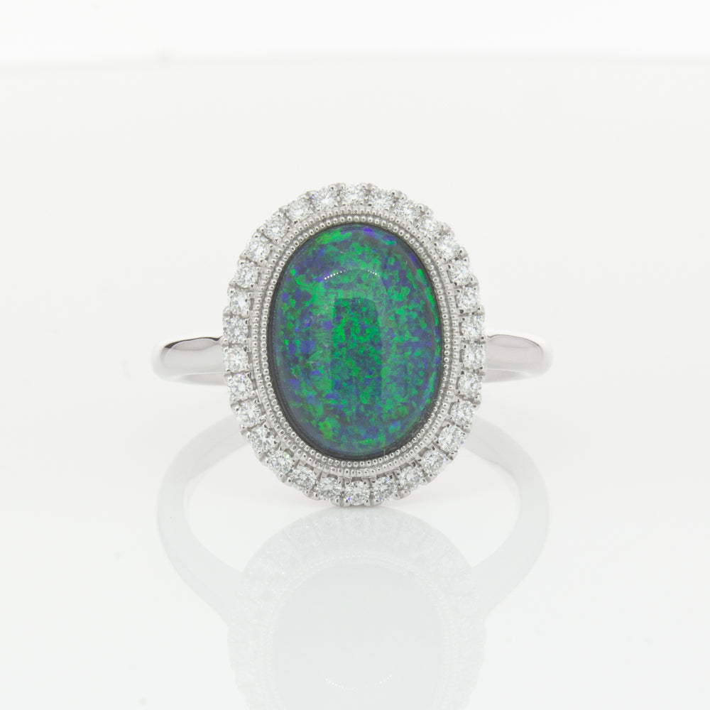 Feel wonderfully empowered with this truly superb and completely unique halo oval opal ring. Cleverly combining the strong flashes of blue and green of the black opal with highly sought after mosaic patterning, featuring a solid shank and diamond gallery of intricate beaded detailing. It also enjoys our hallmark quality, high palladium white gold setting that ensures lasting brilliance and sparkle.