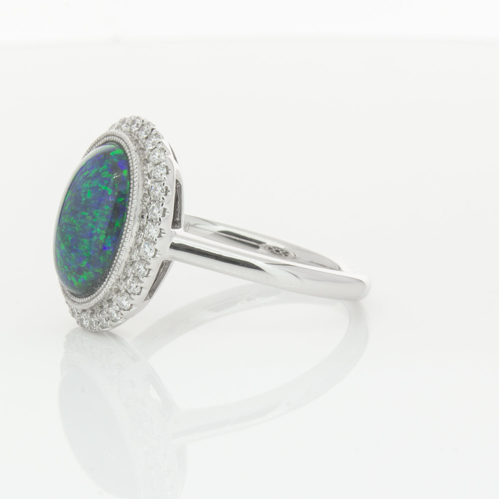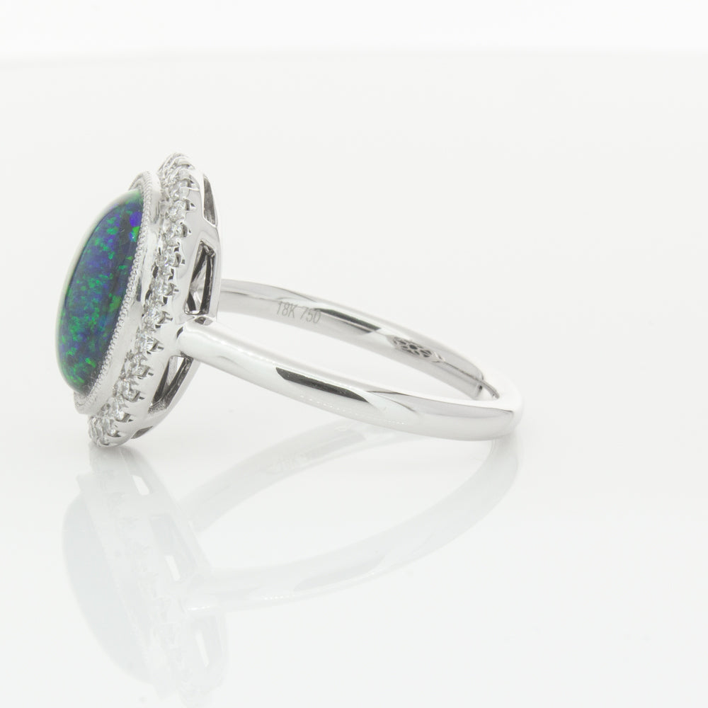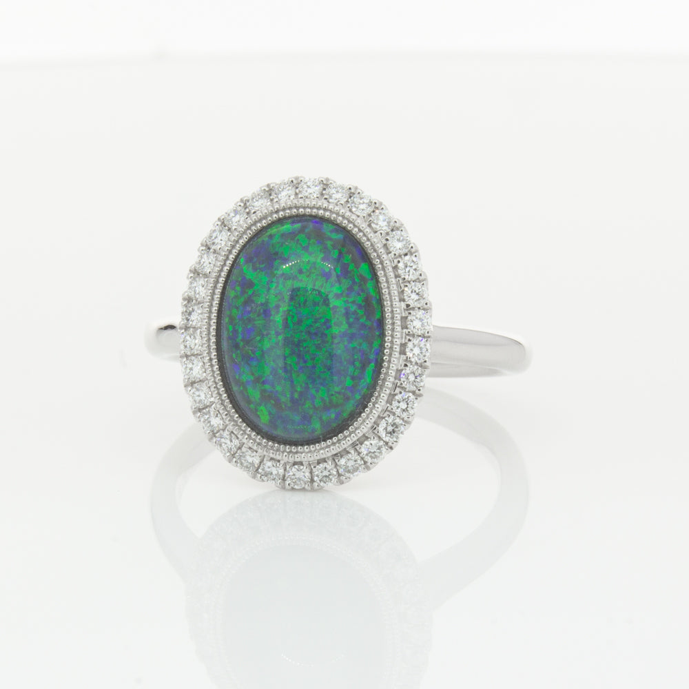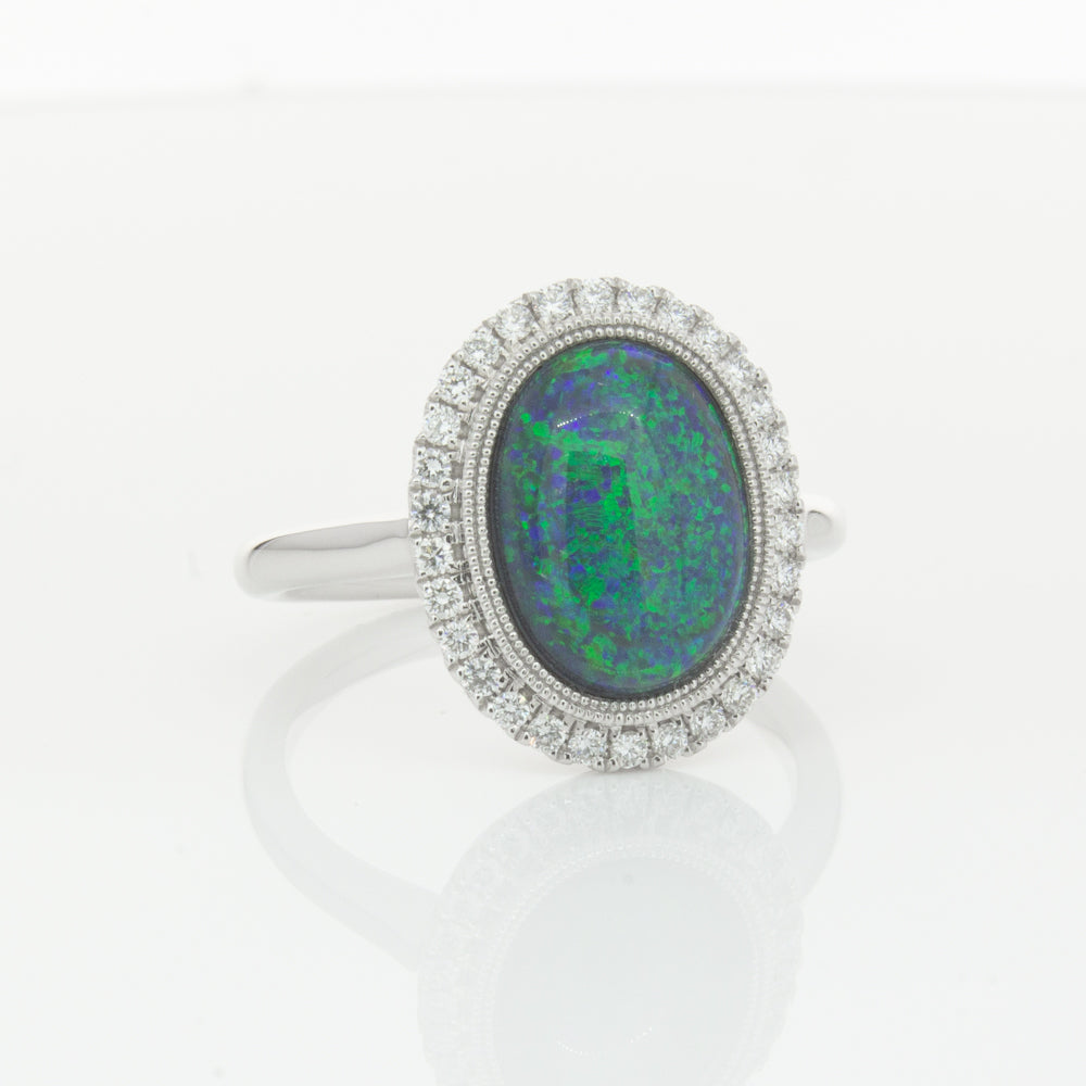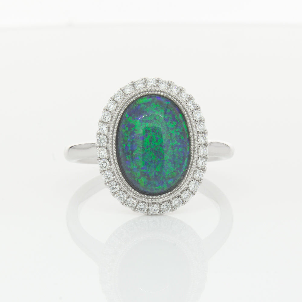 Feel wonderfully empowered with this truly superb and completely unique halo oval opal ring. Cleverly combining the strong flashes of blue and green of the black opal with highly sought after mosaic patterning, featuring a solid shank and diamond gallery of intricate beaded detailing. It also enjoys our hallmark quality, high palladium white gold setting that ensures lasting brilliance and sparkle.