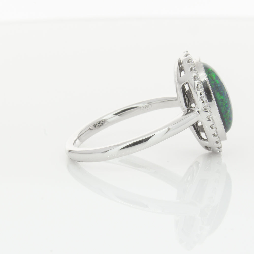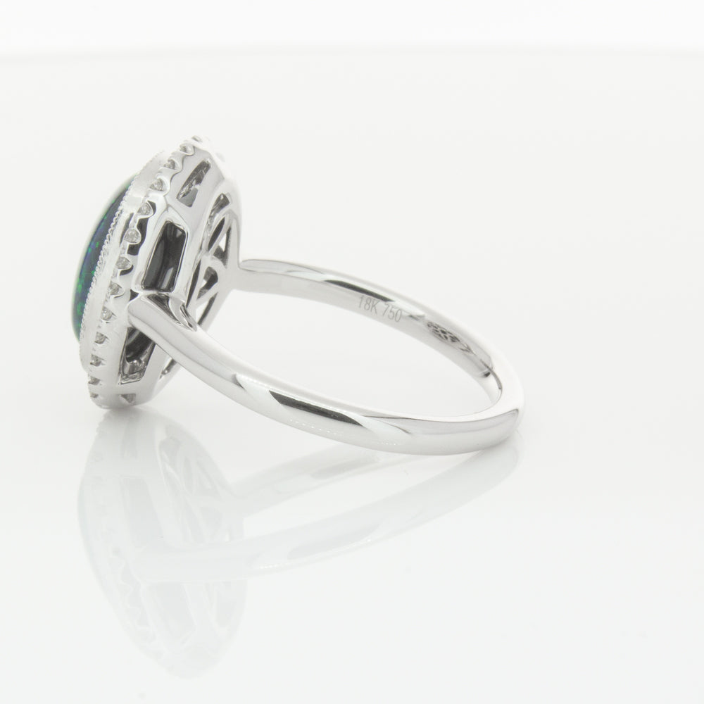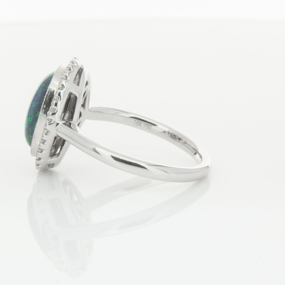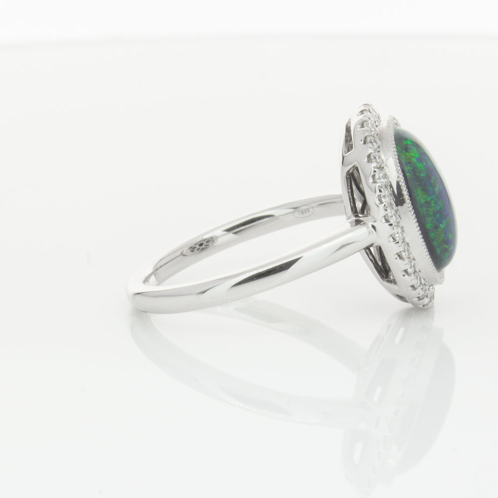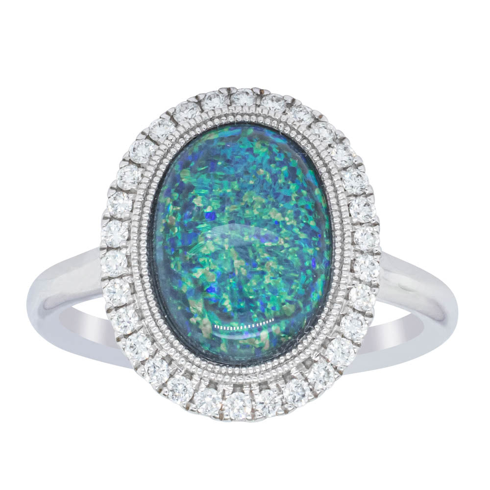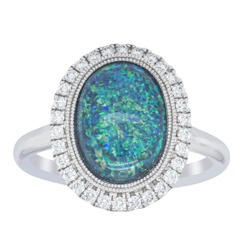 Feel wonderfully empowered with this truly superb and completely unique halo oval opal ring. Cleverly combining the strong flashes of blue and green of the black opal with highly sought after mosaic patterning, featuring a solid shank and diamond gallery of intricate beaded detailing. It also enjoys our hallmark quality, high palladium white gold setting that ensures lasting brilliance and sparkle.
