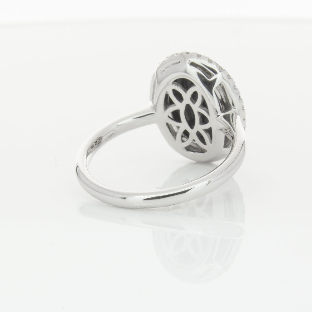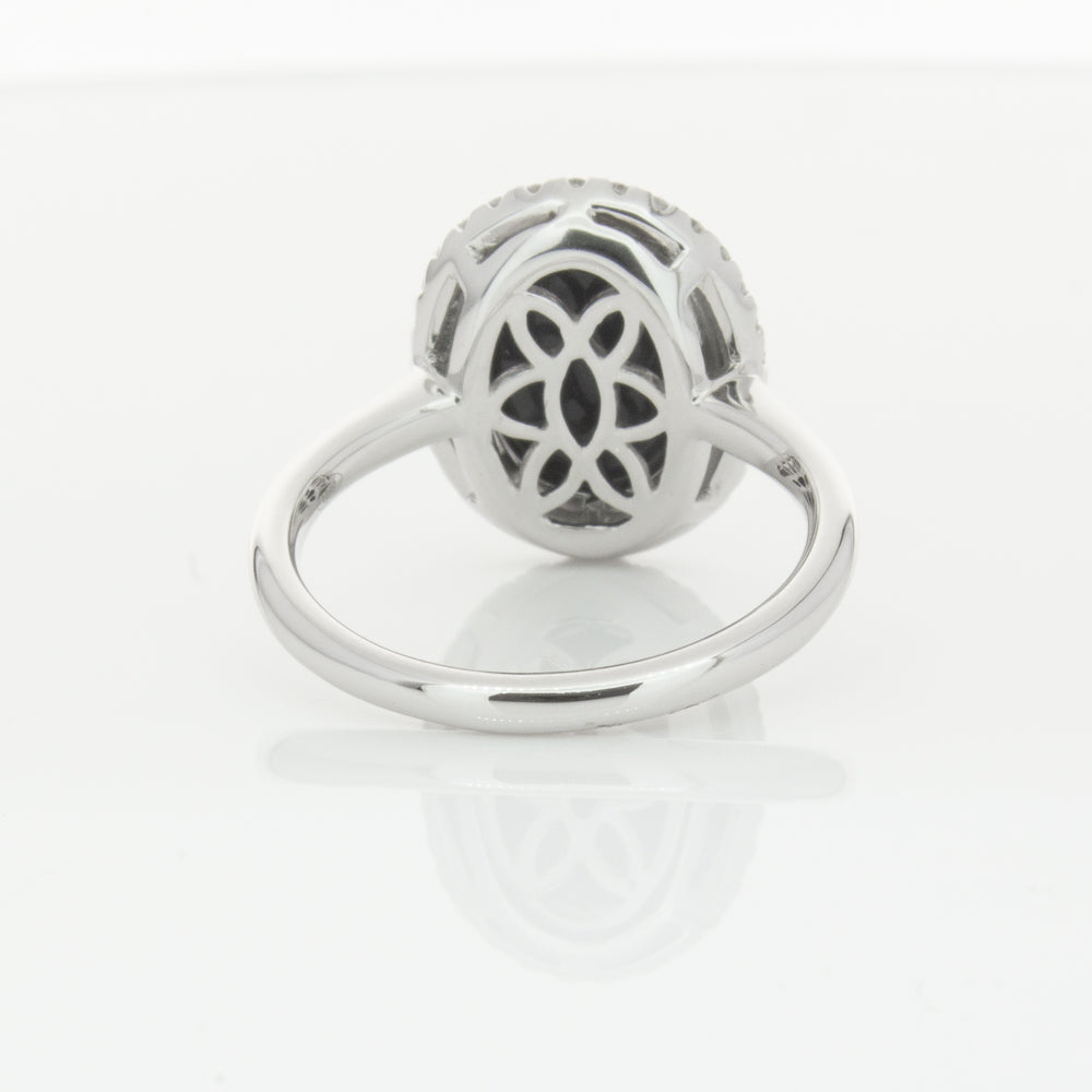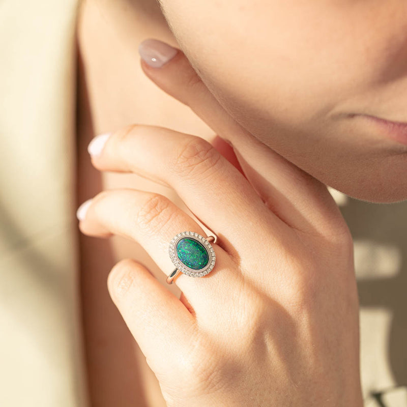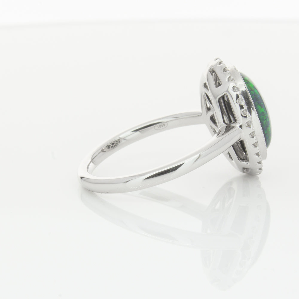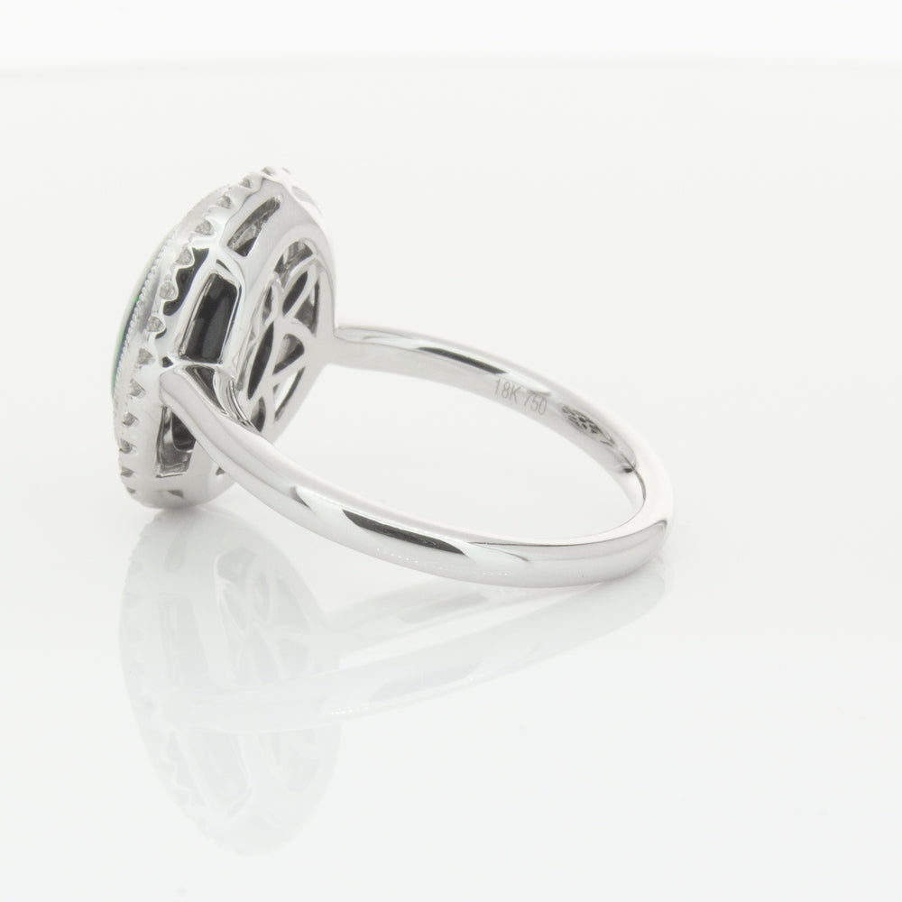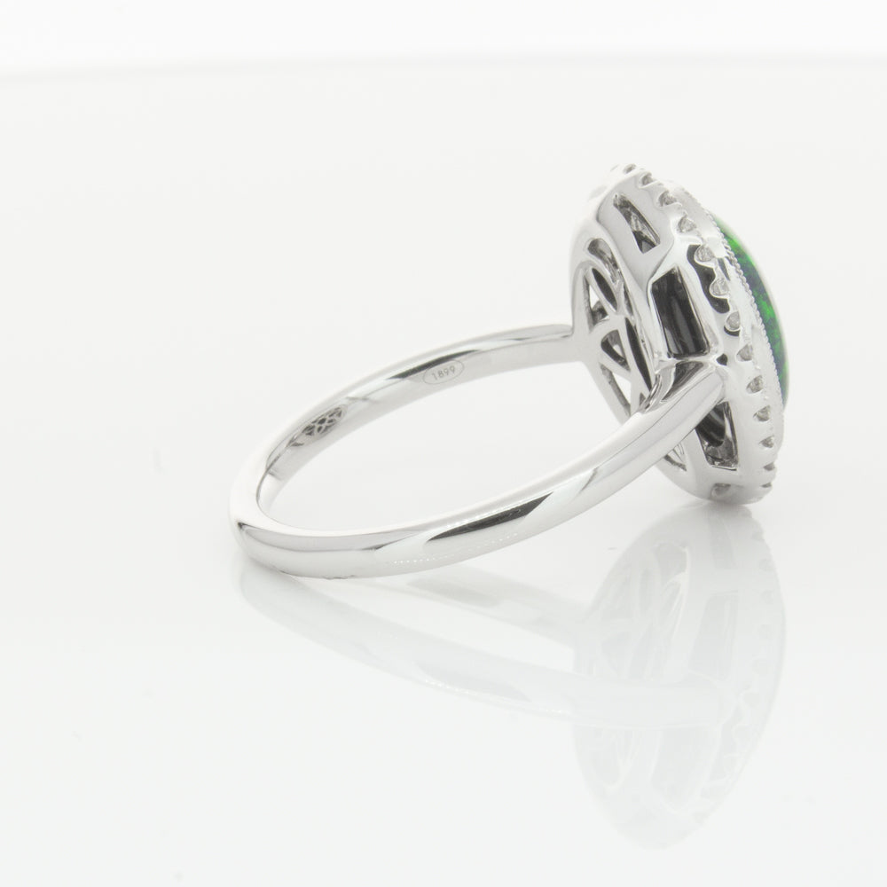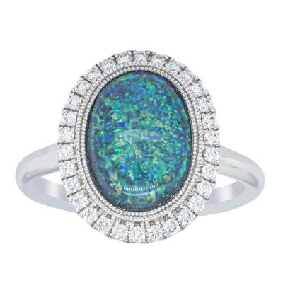 Feel wonderfully empowered with this truly superb and completely unique halo oval opal ring. Cleverly combining the strong flashes of blue and green of the black opal with highly sought after mosaic patterning, featuring a solid shank and diamond gallery of intricate beaded detailing. It also enjoys our hallmark quality, high palladium white gold setting that ensures lasting brilliance and sparkle.
