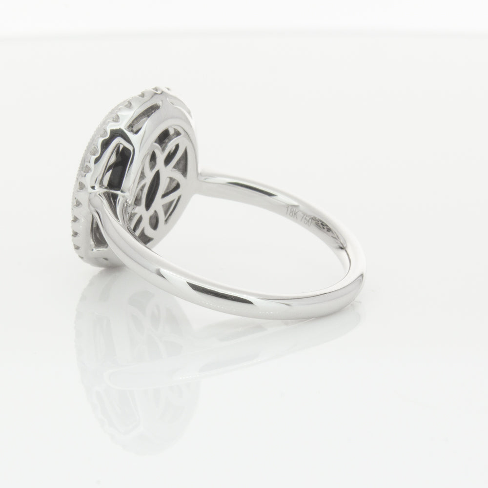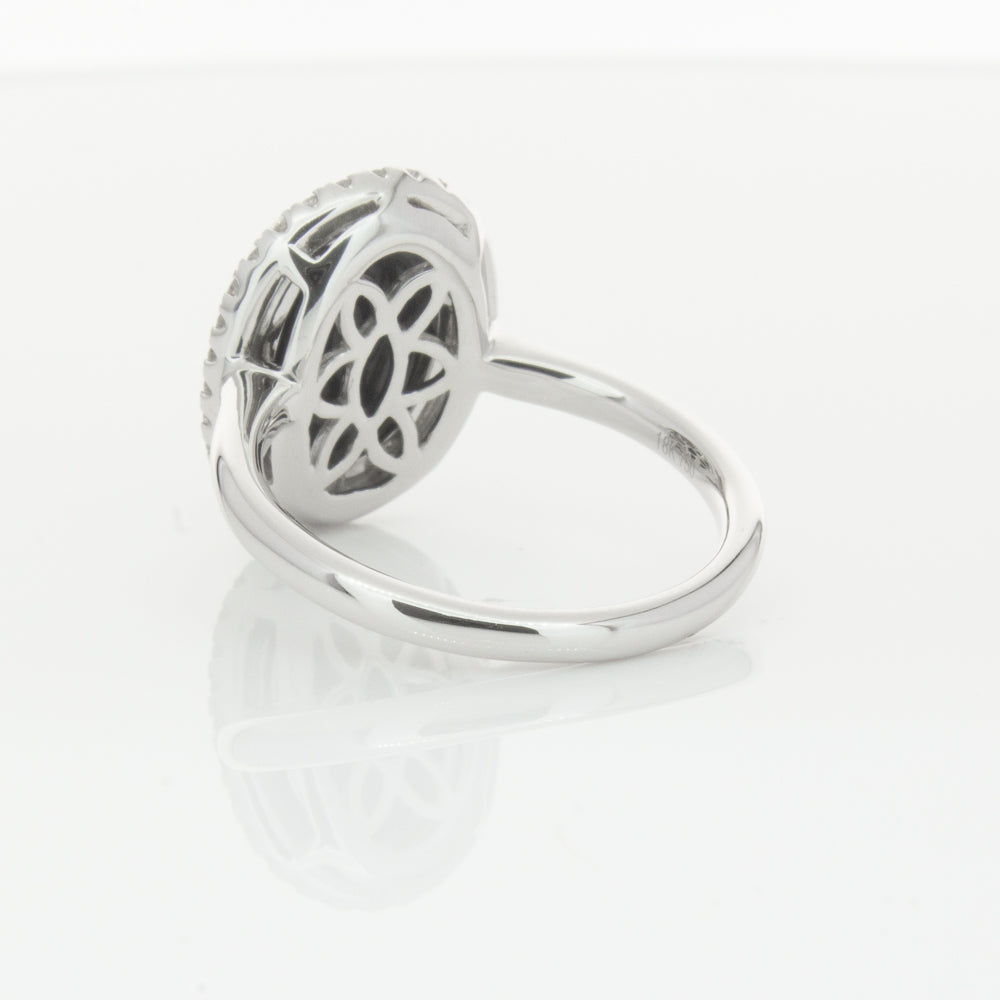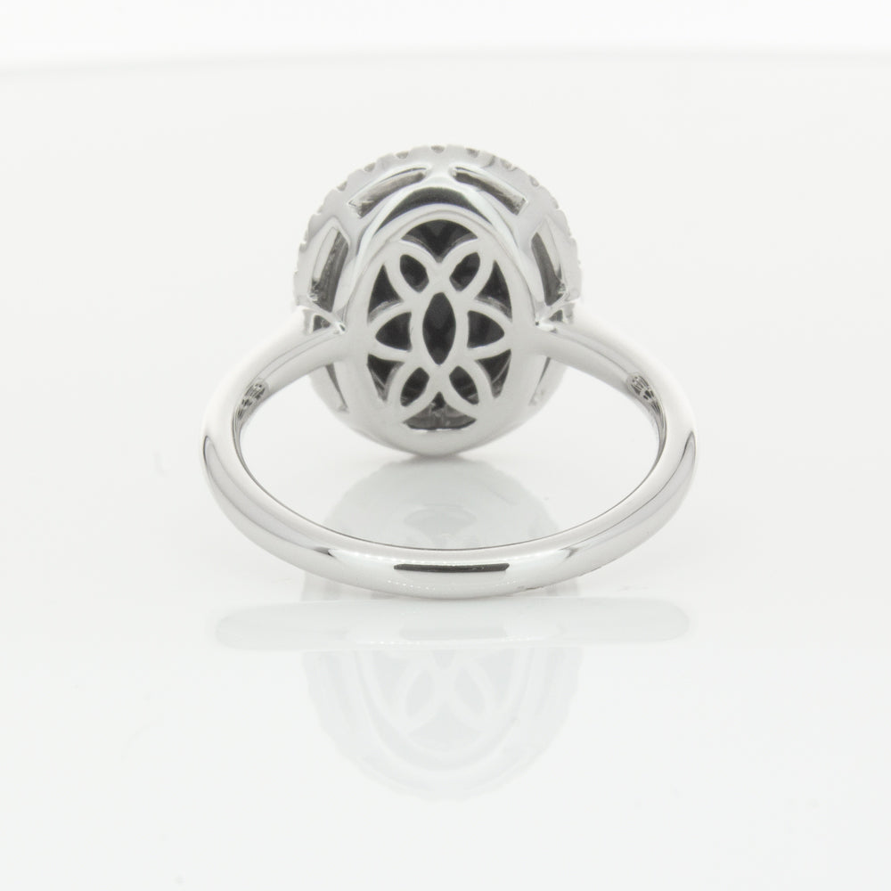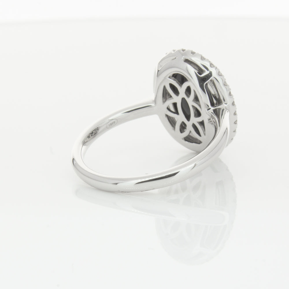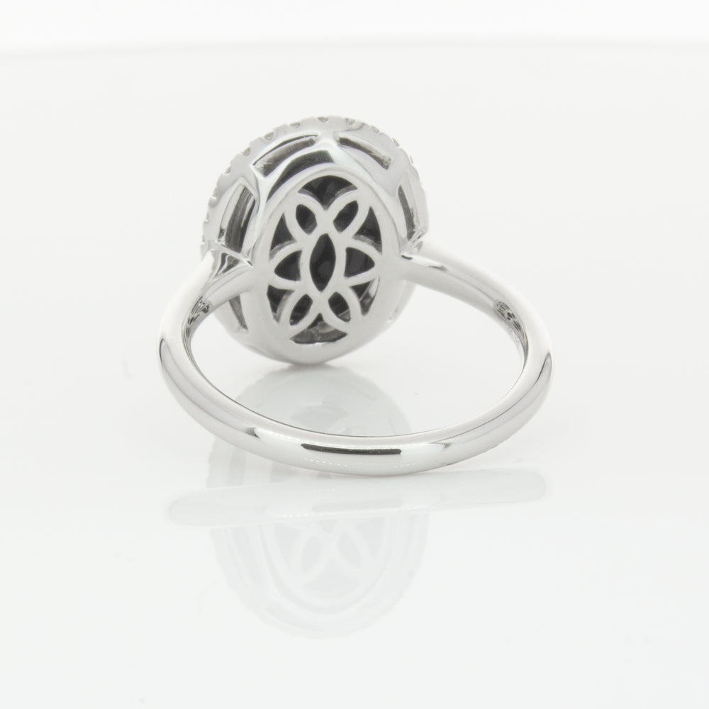 Feel wonderfully empowered with this truly superb and completely unique halo oval opal ring. Cleverly combining the strong flashes of blue and green of the black opal with highly sought after mosaic patterning, featuring a solid shank and diamond gallery of intricate beaded detailing. It also enjoys our hallmark quality, high palladium white gold setting that ensures lasting brilliance and sparkle.