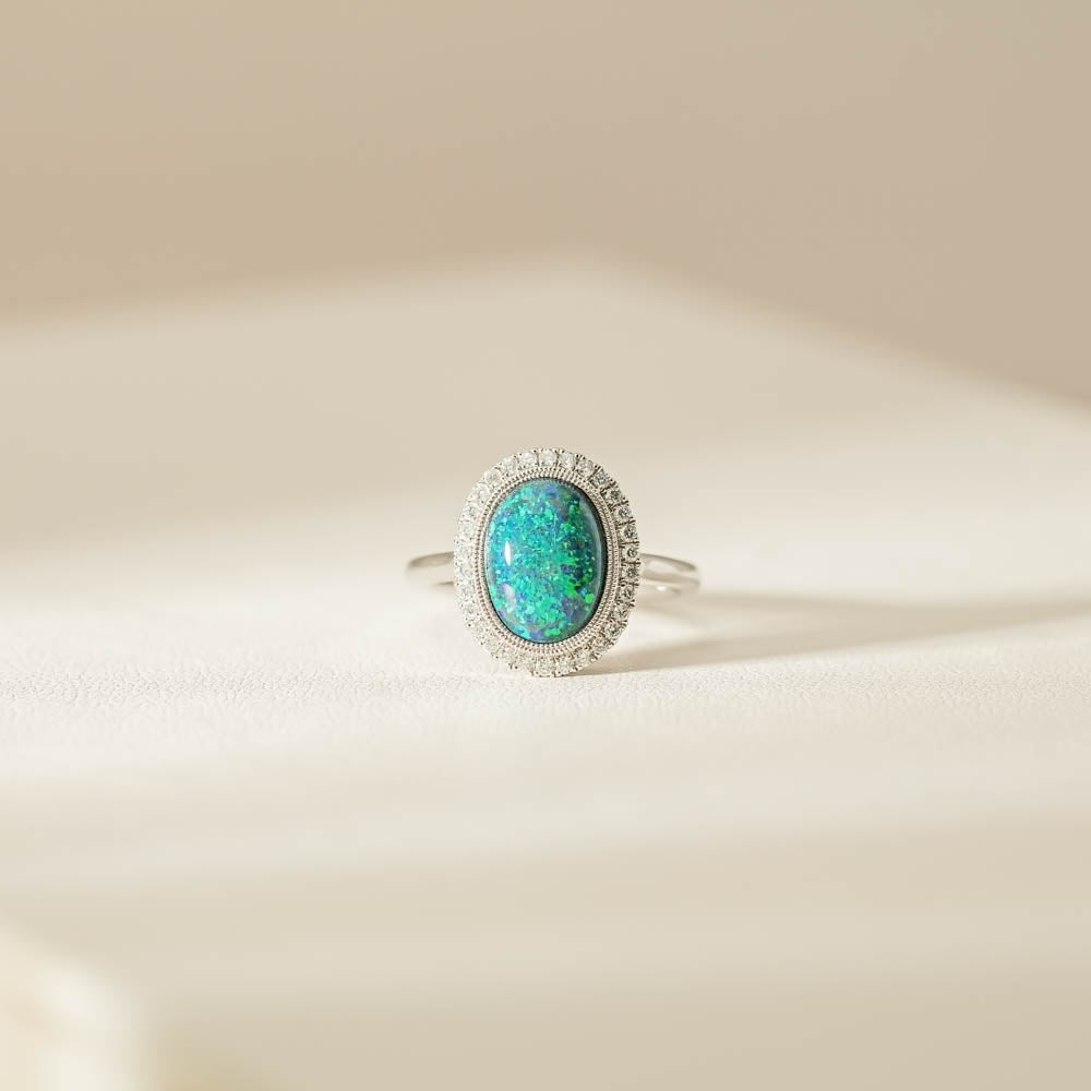 18ct White Gold 2.51ct Opal & Diamond Halo Ring