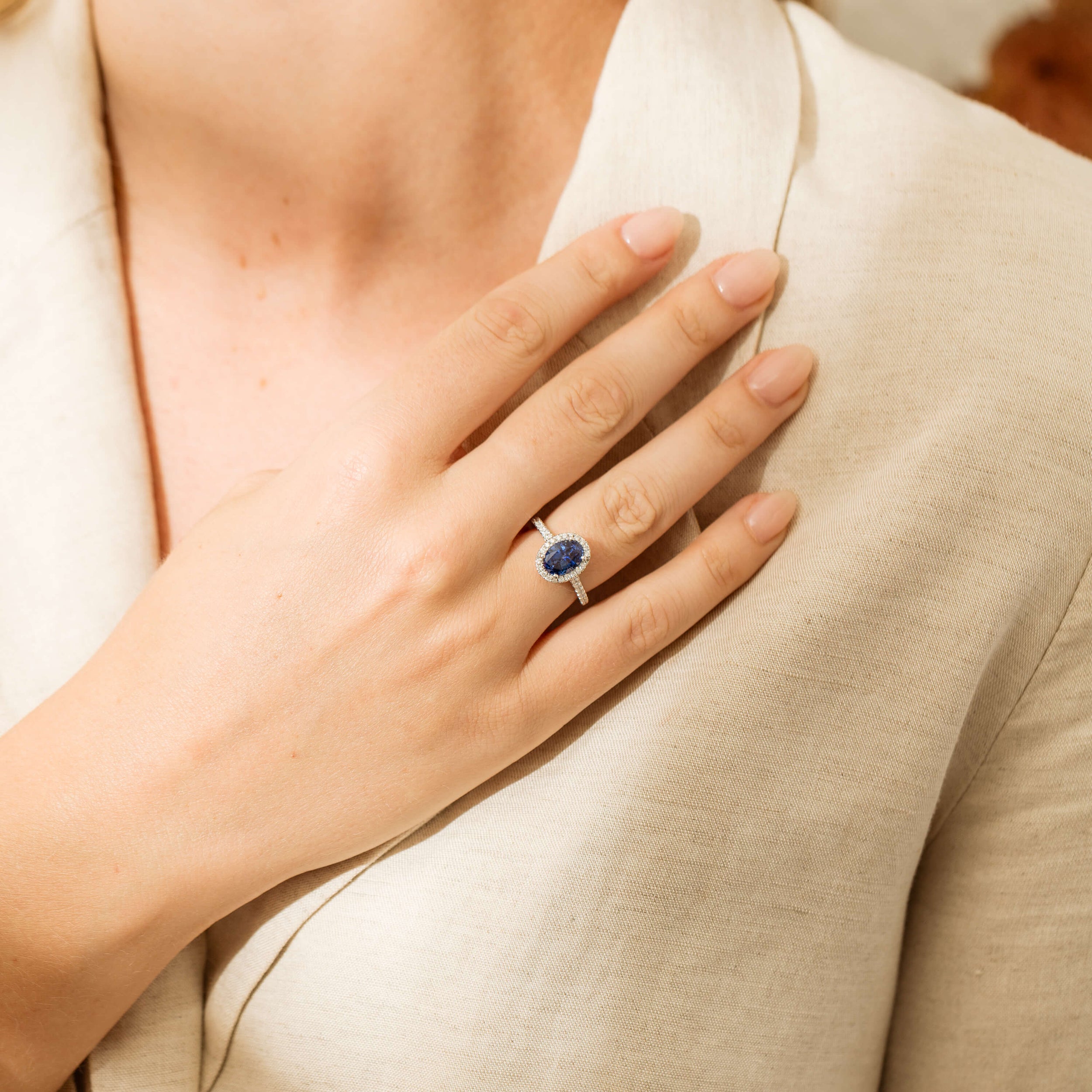 This gorgeous blue sapphire from Sri Lanka makes a luminous statement in this stunning 18ct white gold Sierra ring from our signature 1899 collection, surrounded by a halo of shimmering round brilliant cut diamonds. Complete with diamond set shoulders, this ring is simply divine.