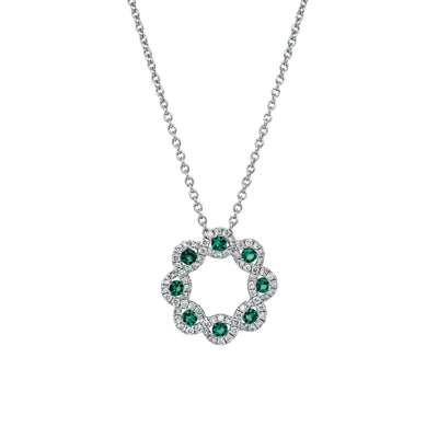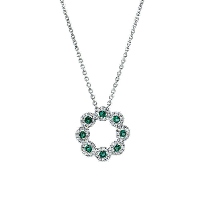 A wonderful surprise for a May-born beauty, or someone with glistening green eyes! This pendant boasts eight vibrant round faceted emeralds surrounded by round brilliant cut diamonds. Set in divine 18ct white gold, this will soon become her favourite piece.