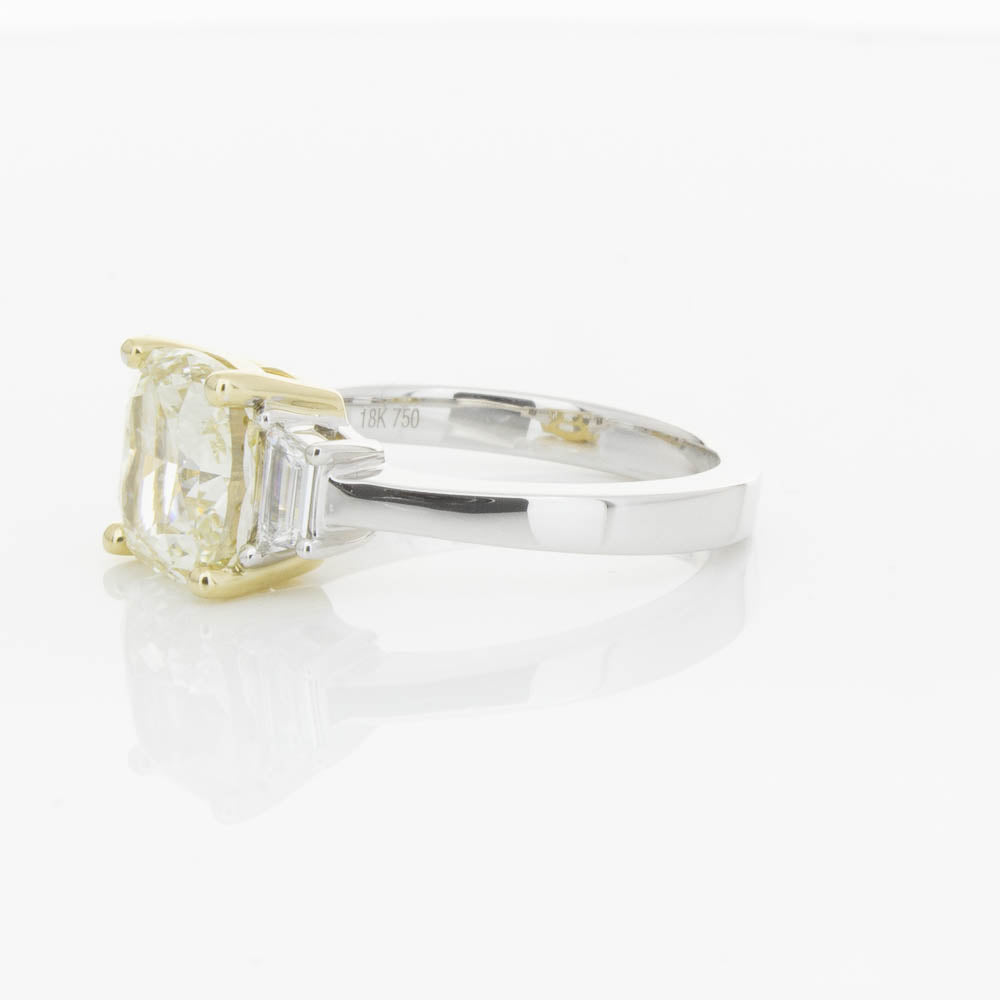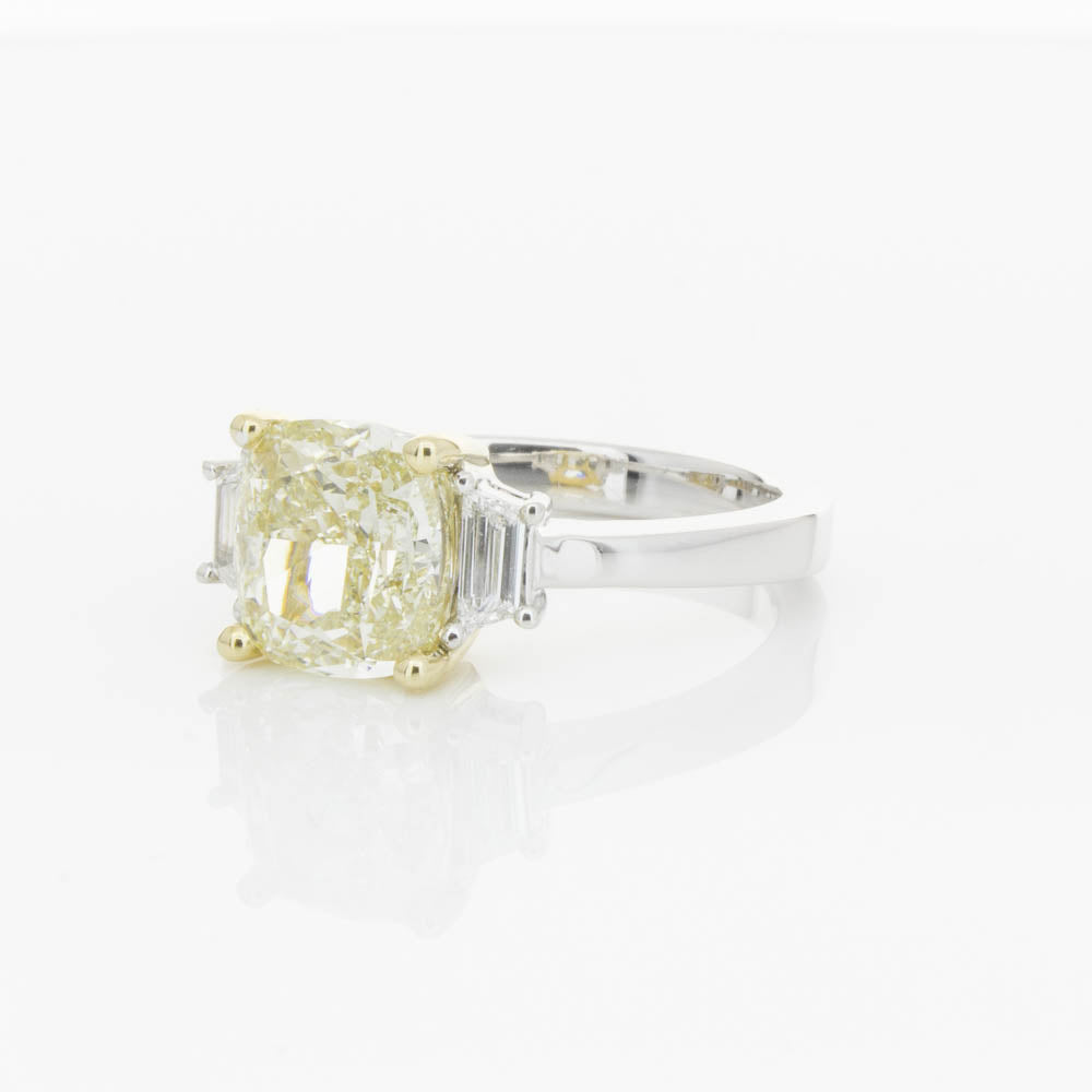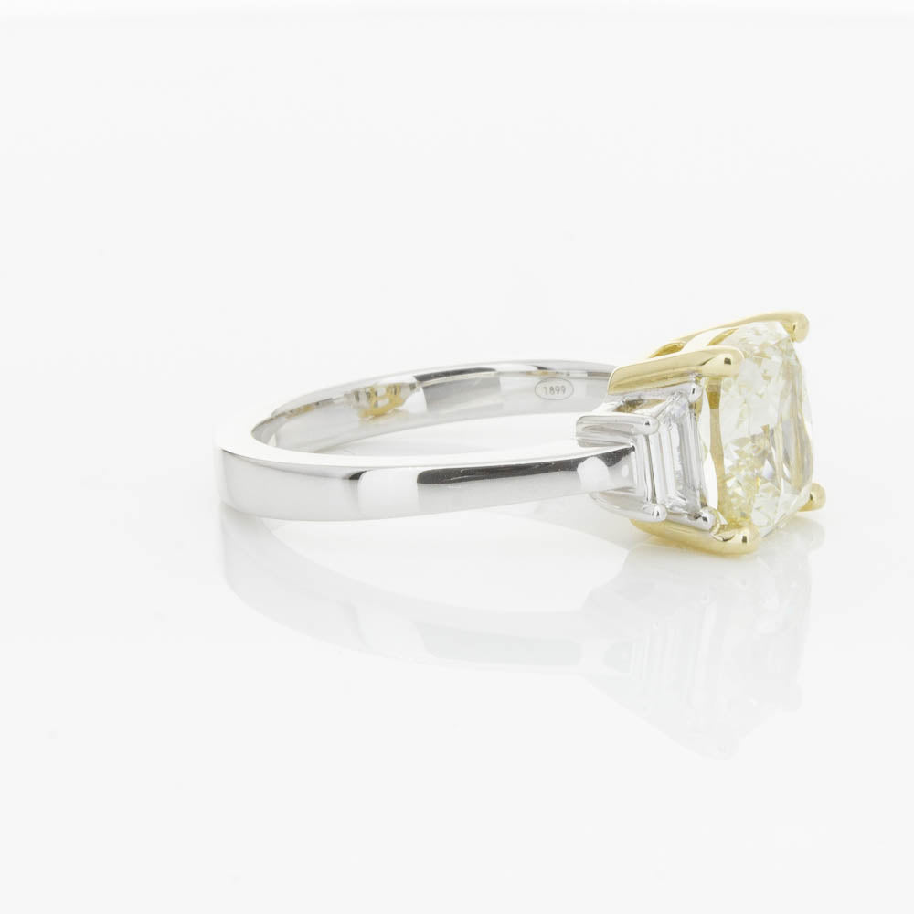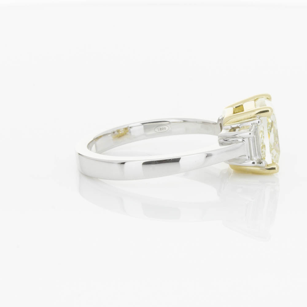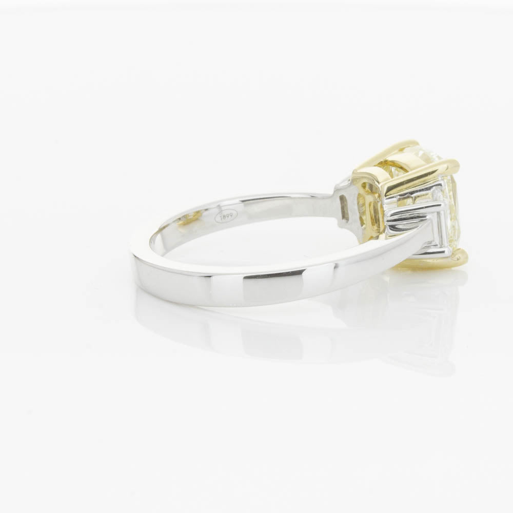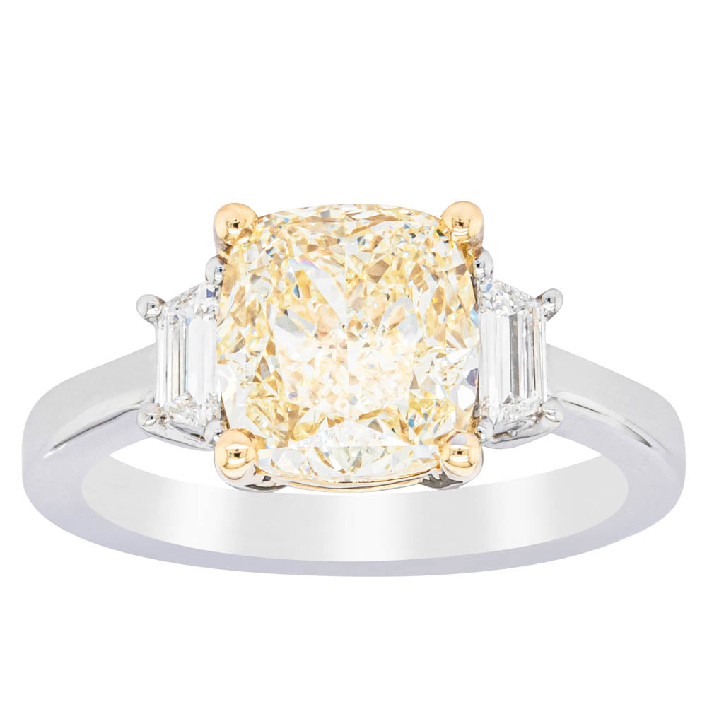 Appealing rays of sunshine radiate from the soft cushion proportions of this natural yellow diamond. Tapered trapezoids are thoughtfully employed to enhance the gentle outline of the centre diamond and lead to a gently tapering band. Refined and exceptional.