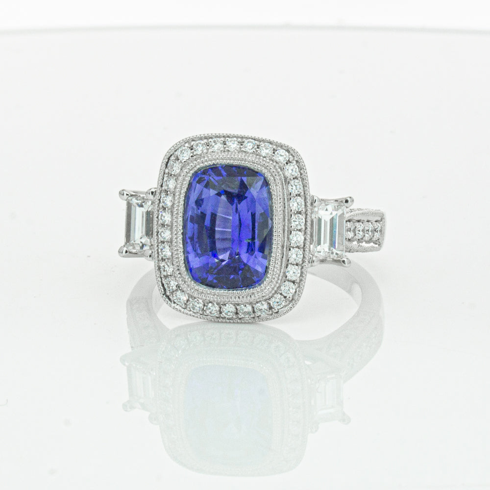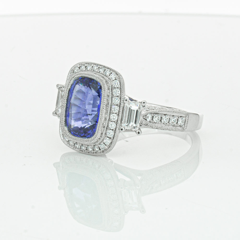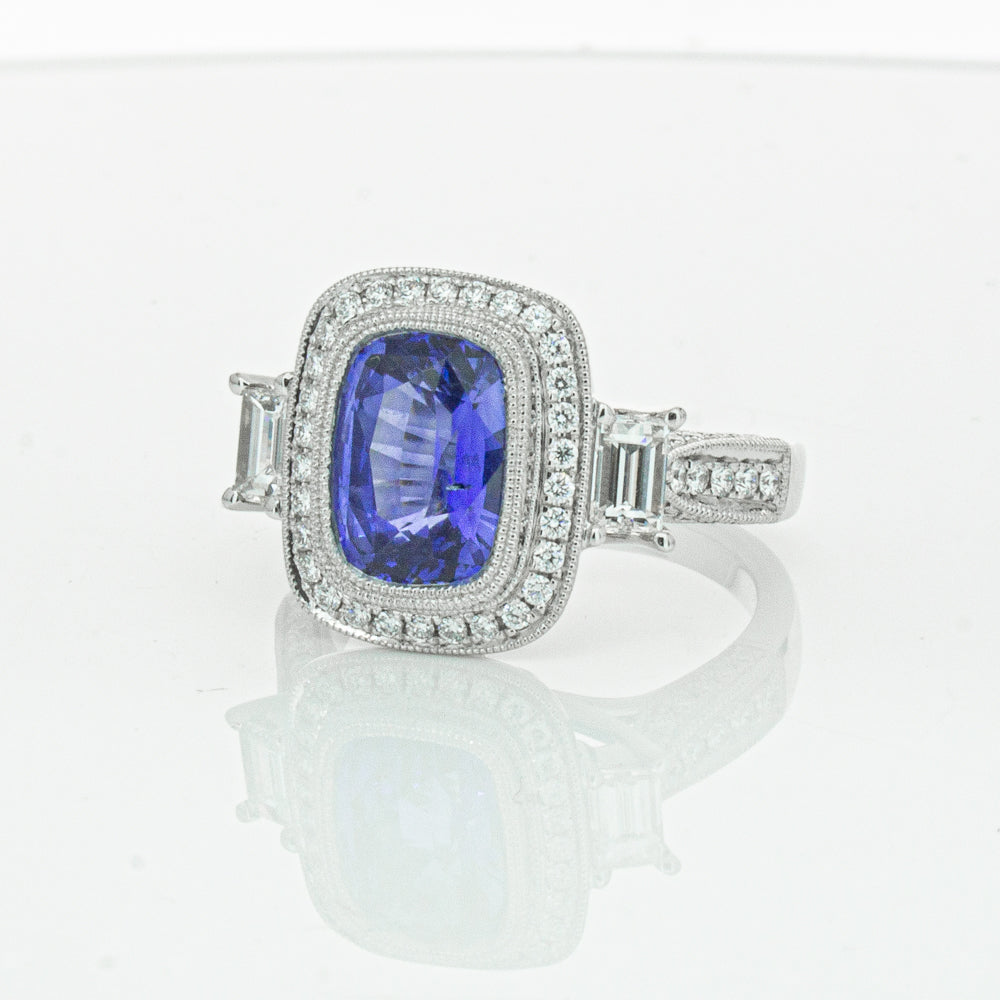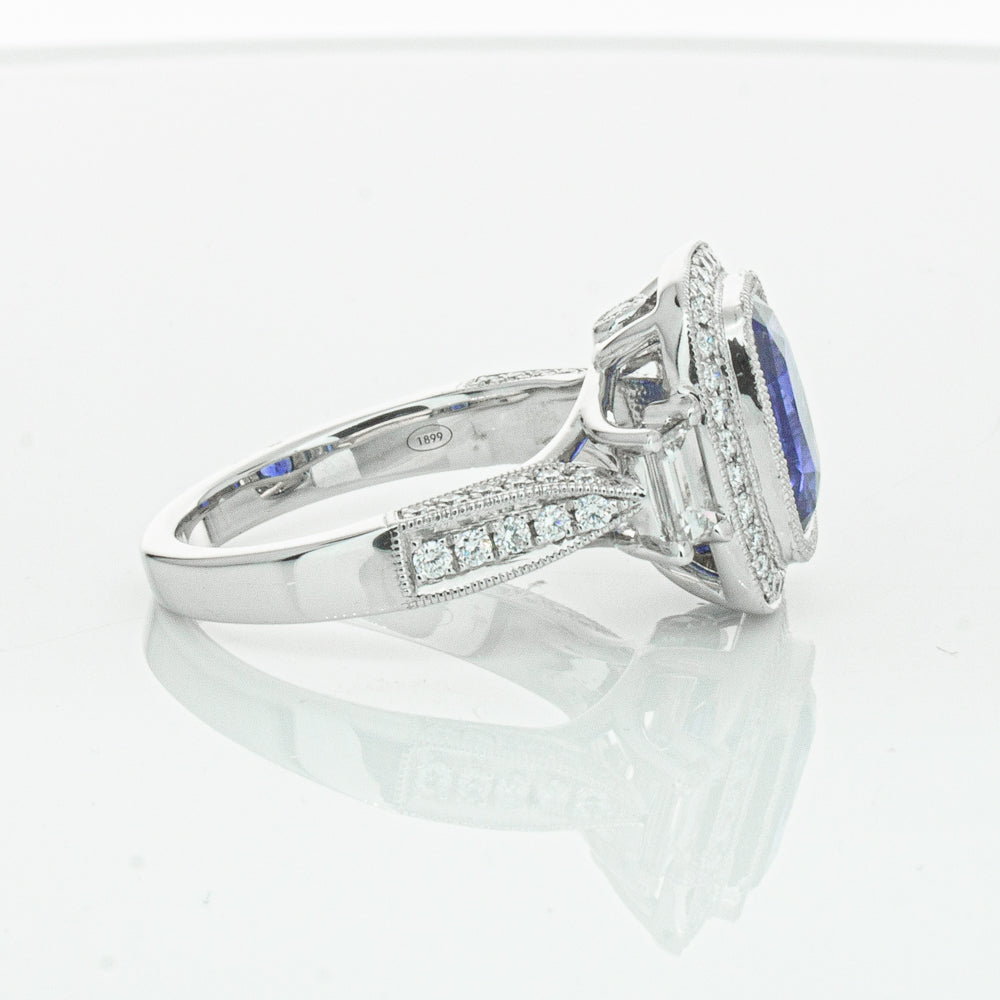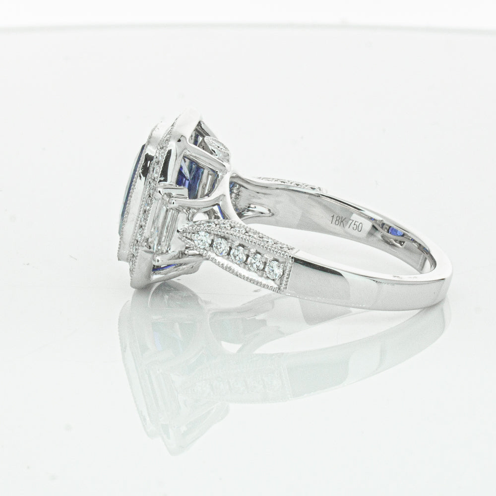 This stunning 18ct white gold ring showcases a 3.34ct blue sapphire, accented by a halo of diamonds that highlight its elongated shape. The baguette cut diamonds on each side mimic the sapphire's step-cut facets and bring balance and symmetry to the design.