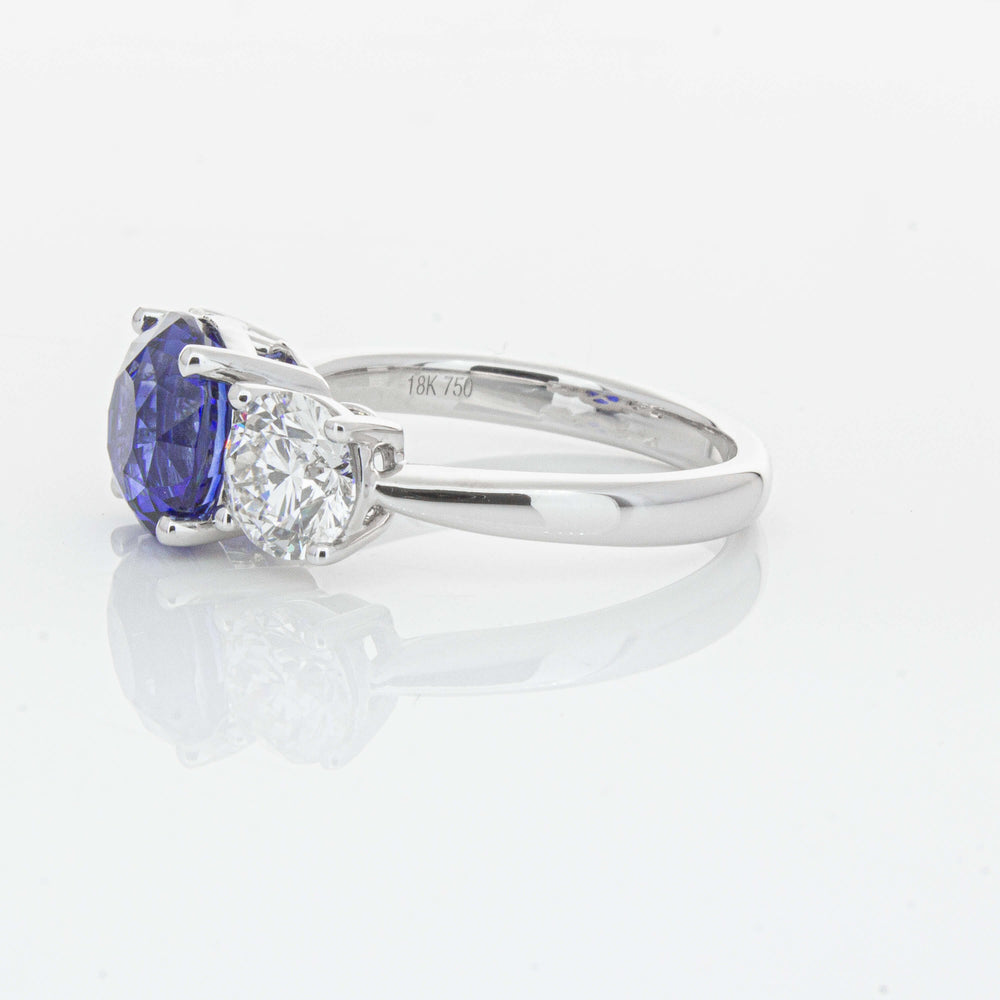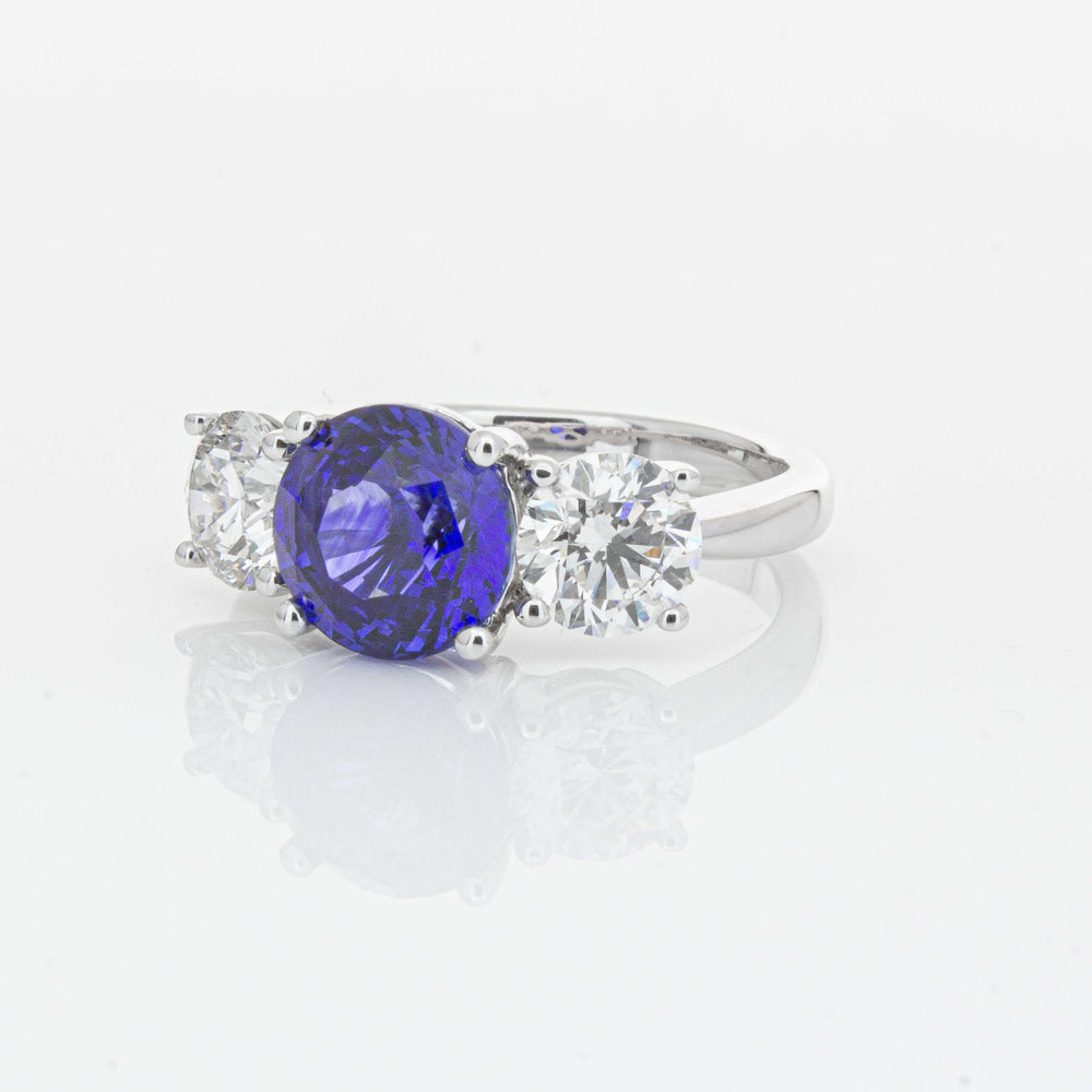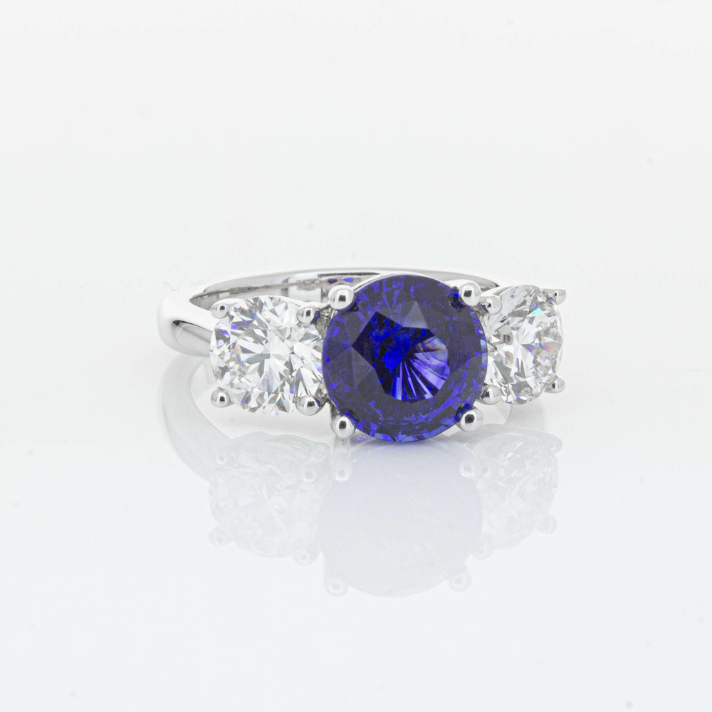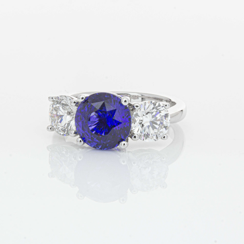 “A rare 3.51ct round sapphire, sourced from the cascading waters of central Sri Lanka. Remarkable for its intense, velvety royal blue hue, this sapphire’s rich colour is amplified by its size, shape and quality. Set in a simple yet elegant Trinity design crafted in high palladium 18ct white gold. The sapphire is flanked by generous matching natural round brilliant diamonds which create contrast, accentuating its vibrant hue.” - Joseph Tattersfield