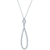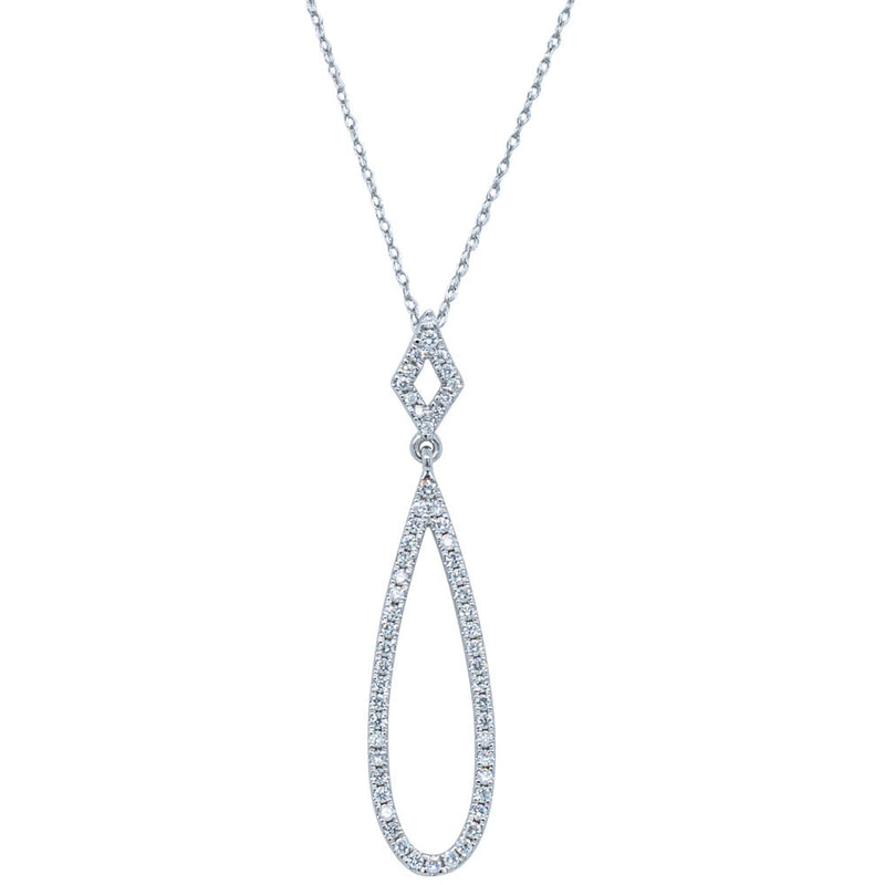 This 18ct white gold pendant boasts a striking drop shape, perfect for elegantly adorning the décolletage. It is set with round brilliant cut diamonds. This dazzling piece is sure to sparkle with sophisticated style and make a statement.