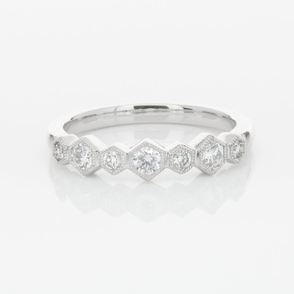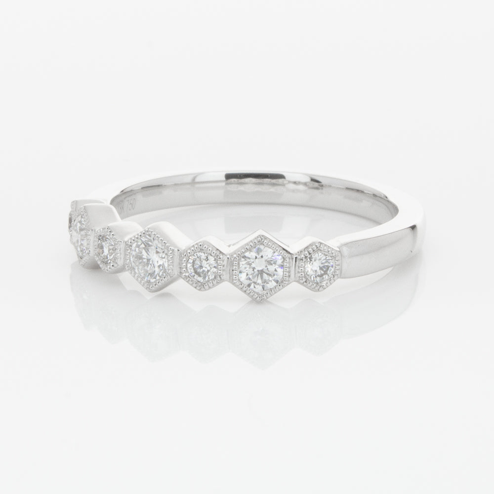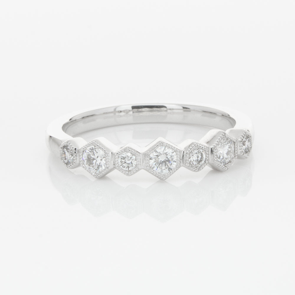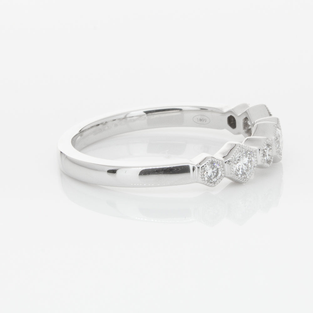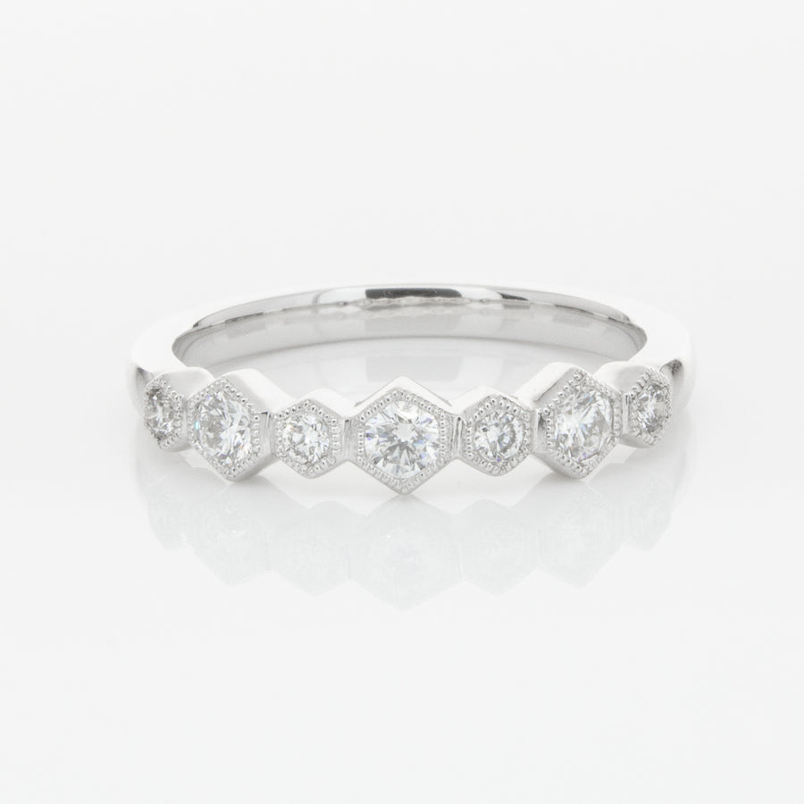 Carefully crafted in 18ct white gold from our signature 1899 collection, this beautiful ring boasts seven round brilliant cut diamonds with millgrain settings.