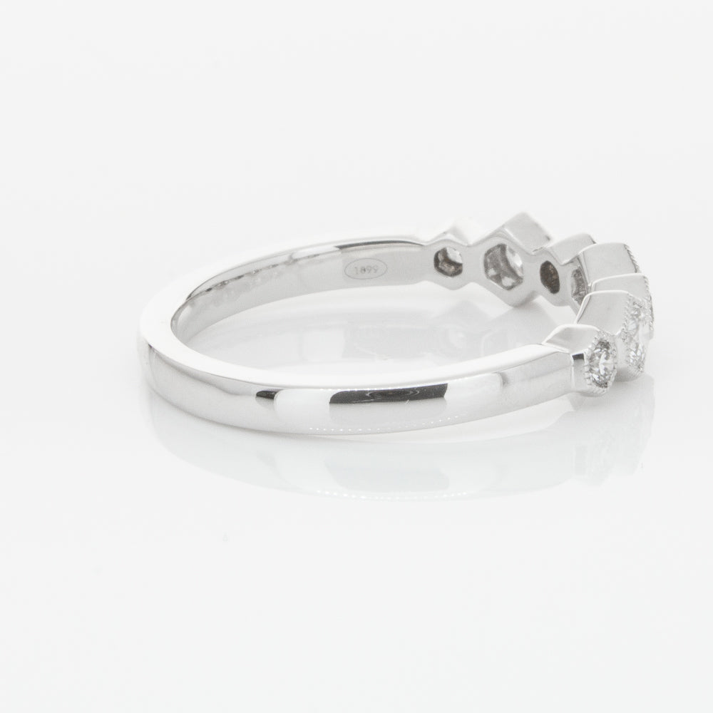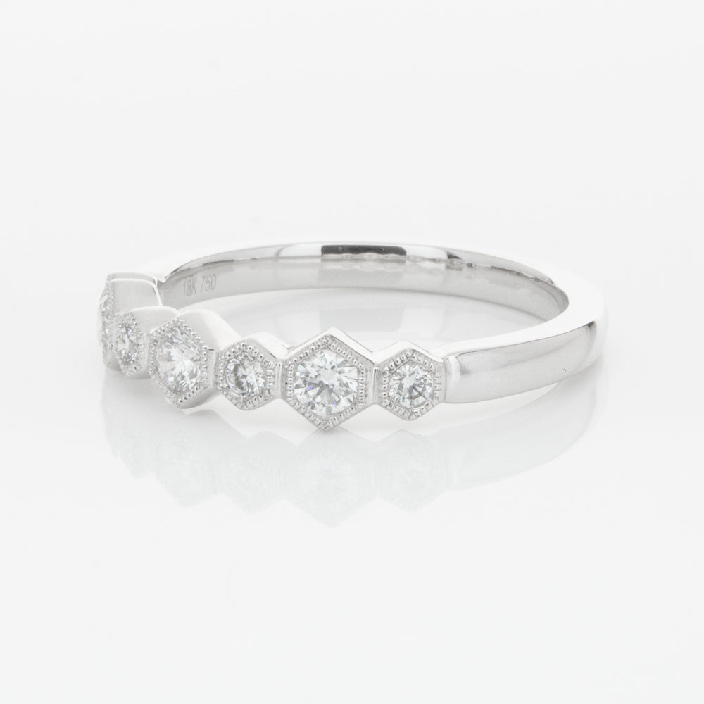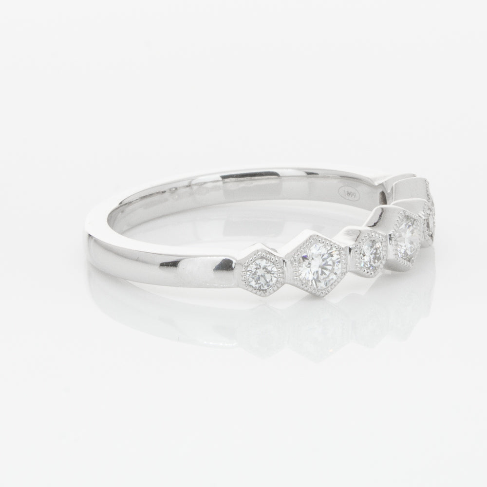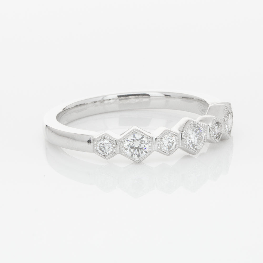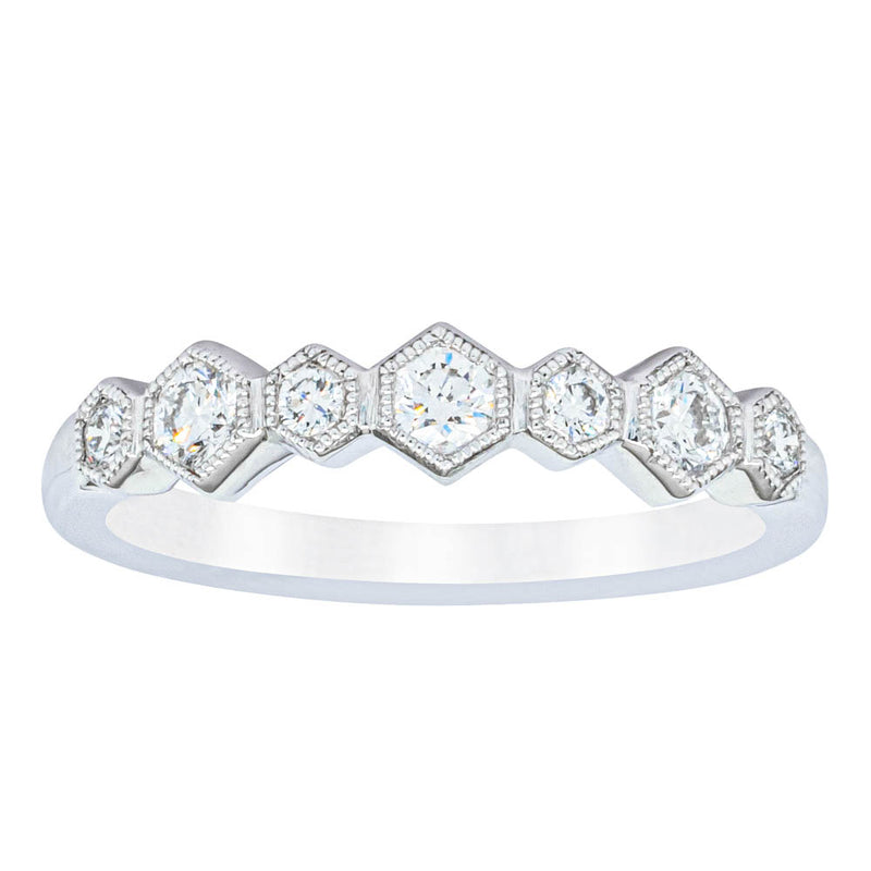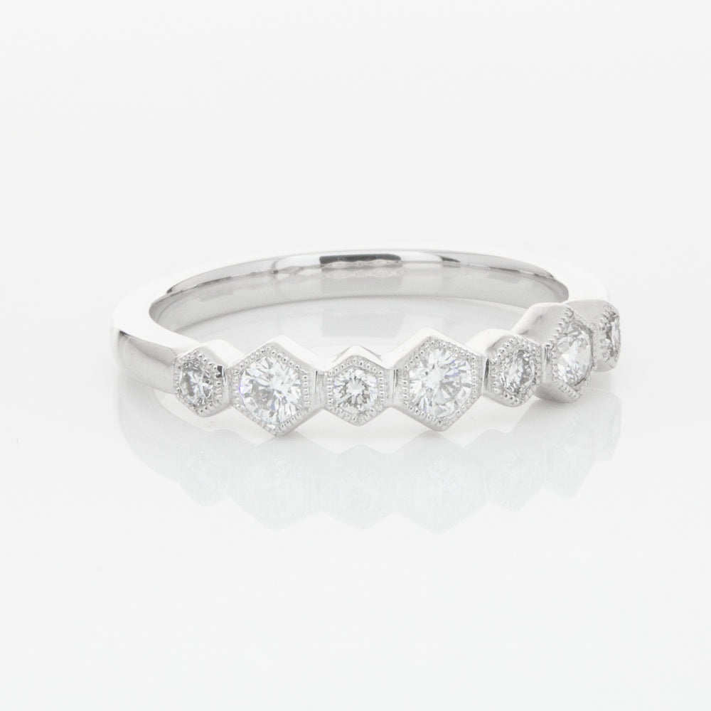 Carefully crafted in 18ct white gold from our signature 1899 collection, this beautiful ring boasts seven round brilliant cut diamonds with millgrain settings.