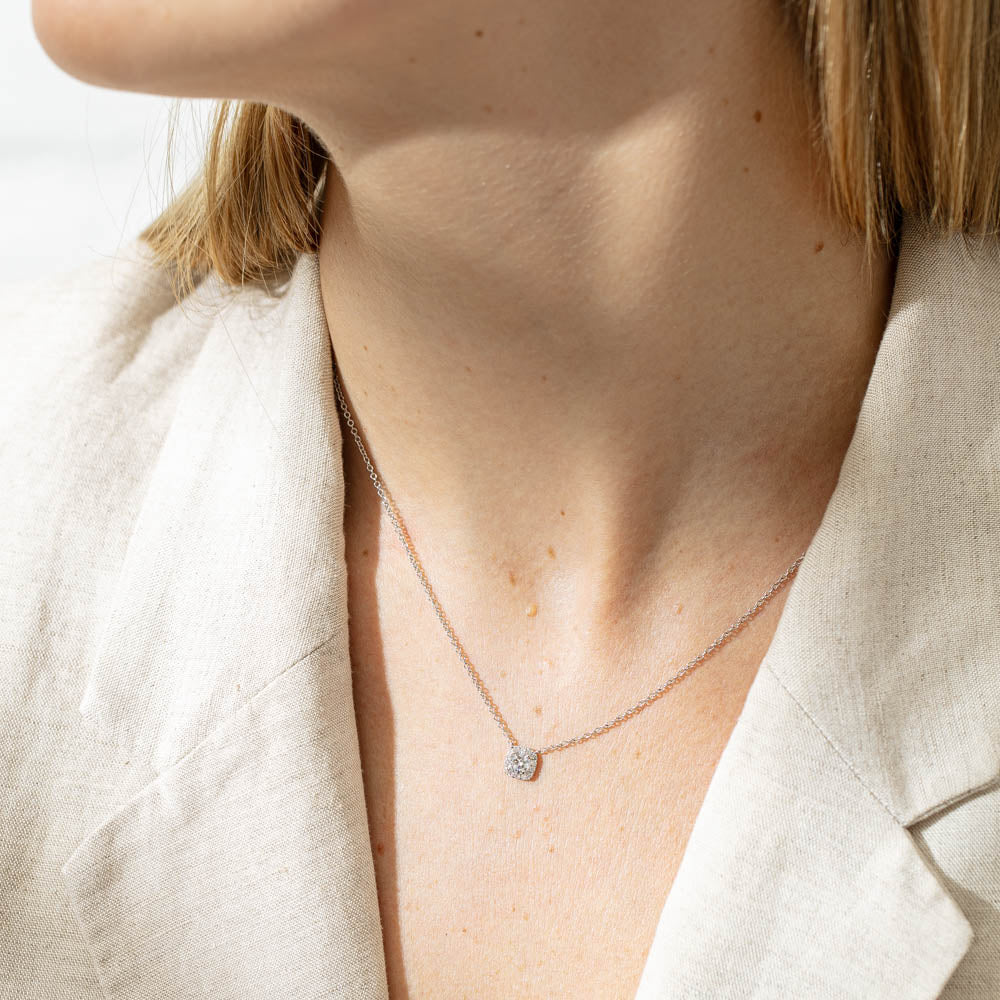 This timeless diamond pendant features a beautiful .38ct round brilliant cut centre diamond framed by a halo of dazzling dainty diamonds! Set in luxurious 18ct white gold, this elegant pendant will soon become your favourite.