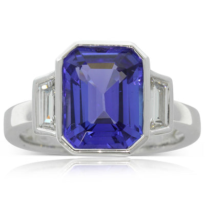 You will be the centre of attention wearing this magnificent tanzanite and diamond ring. A strong violetish blue tanzanite framed by two twinkling taper cut diamonds grace this elegant 18ct white gold ring.