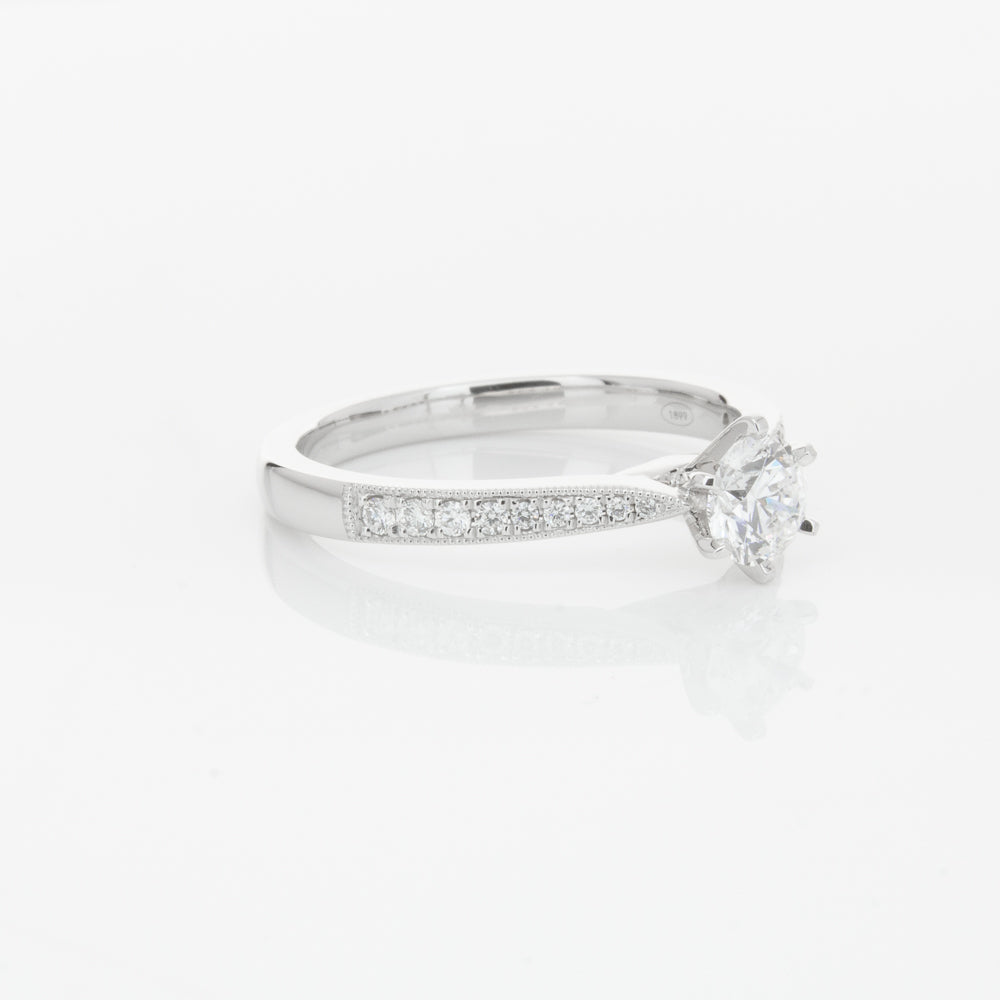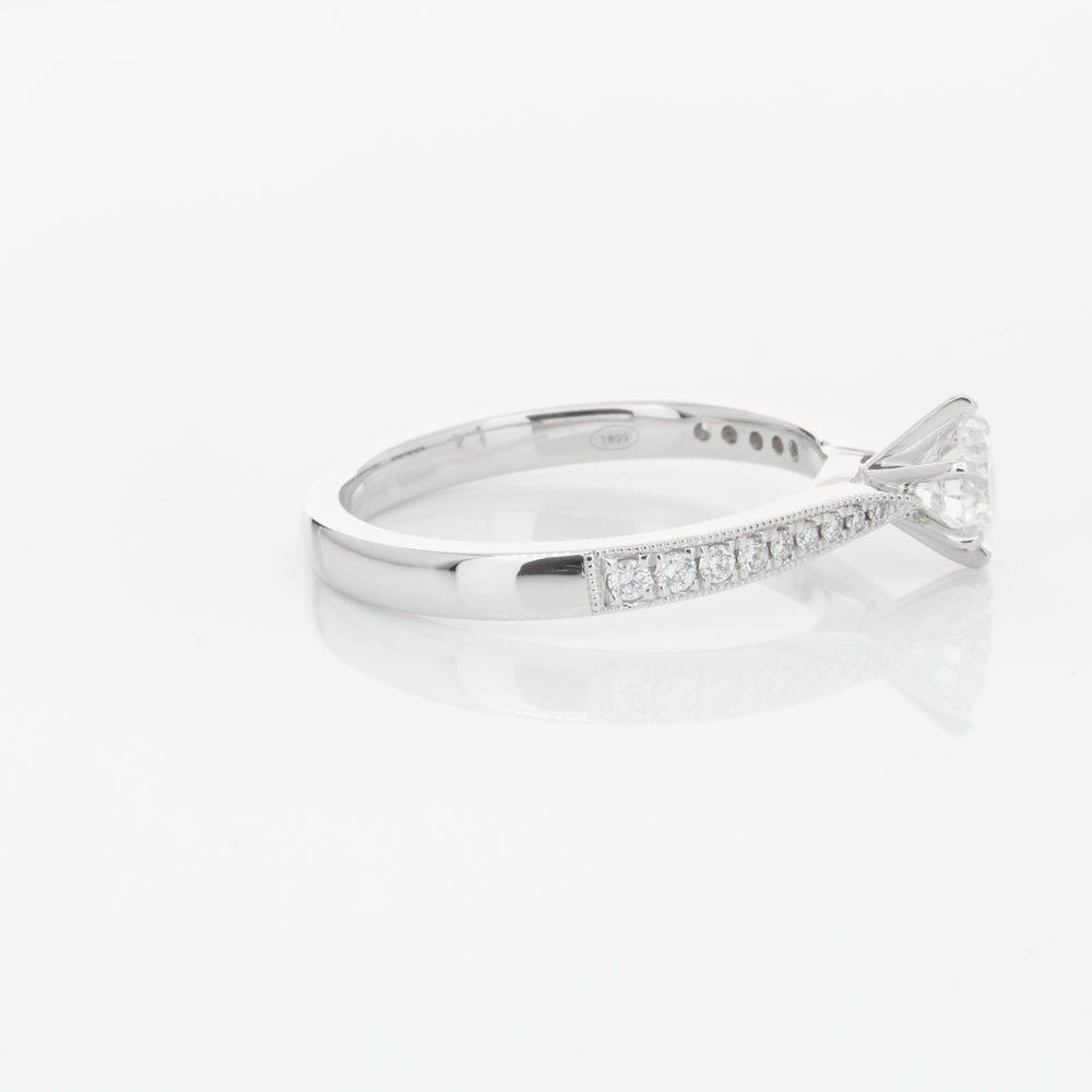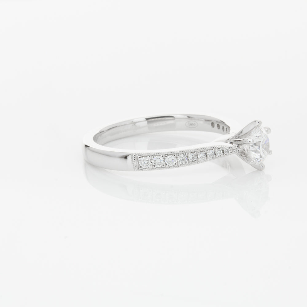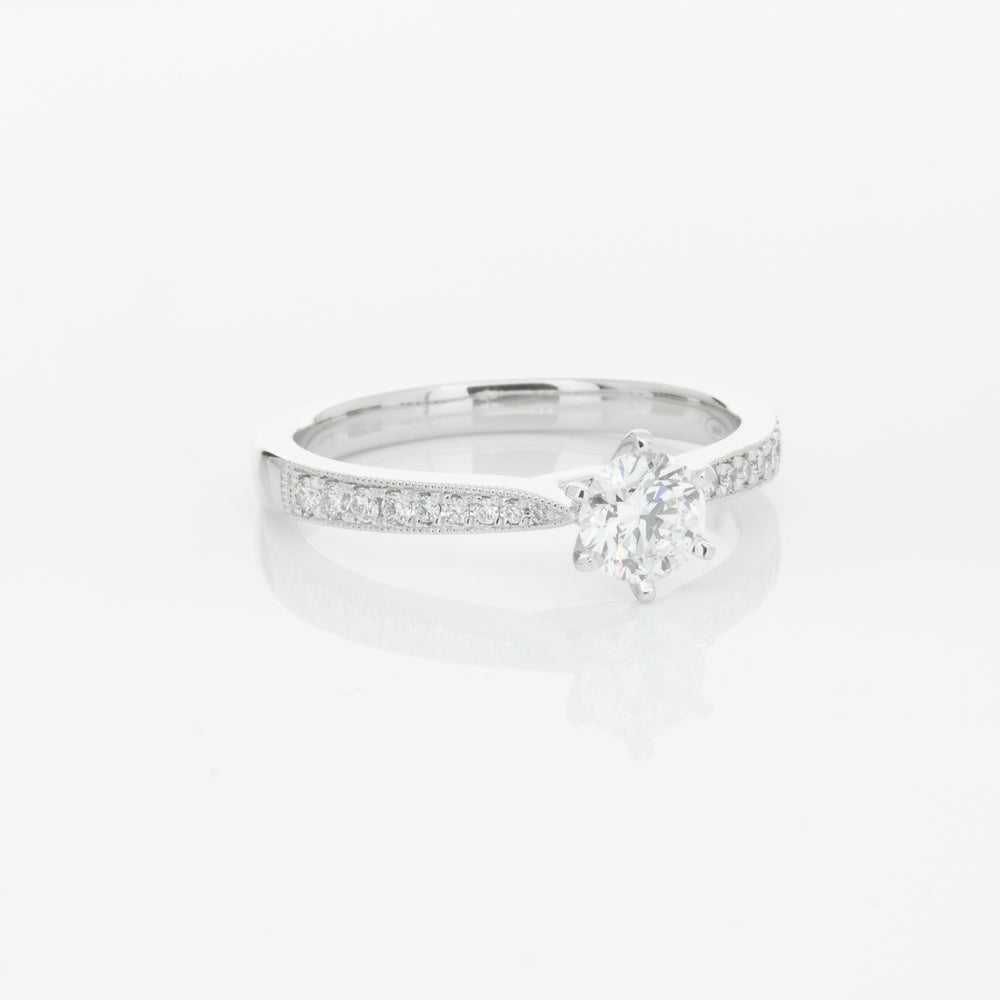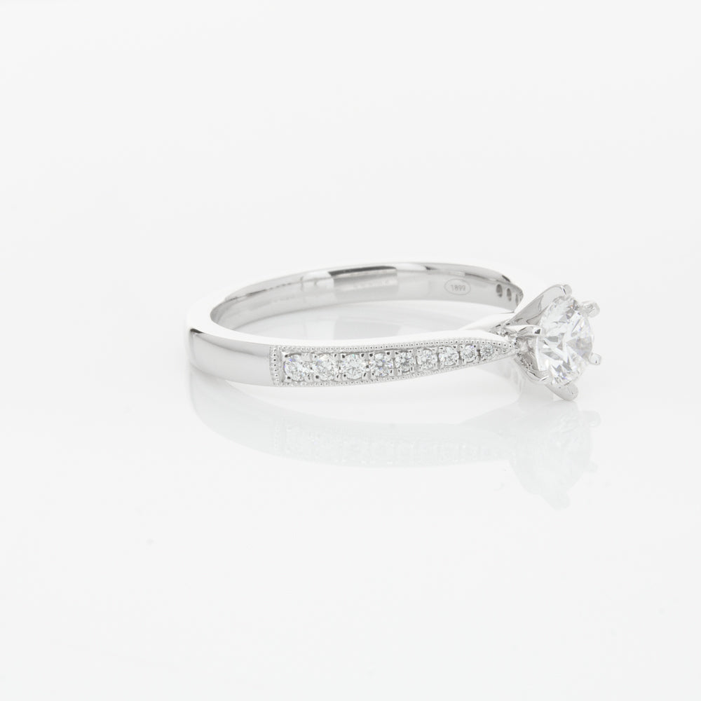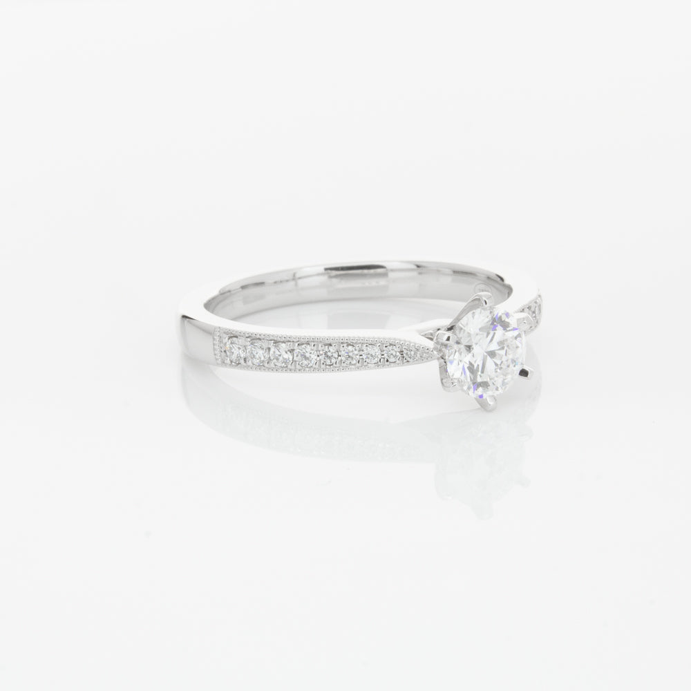 A delicate diamond set band with milgrain detailing, tapers towards the zenith to showcase a sparkling diamond.