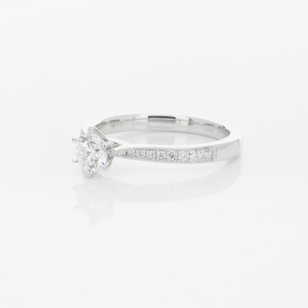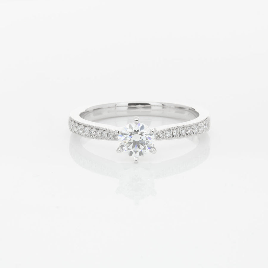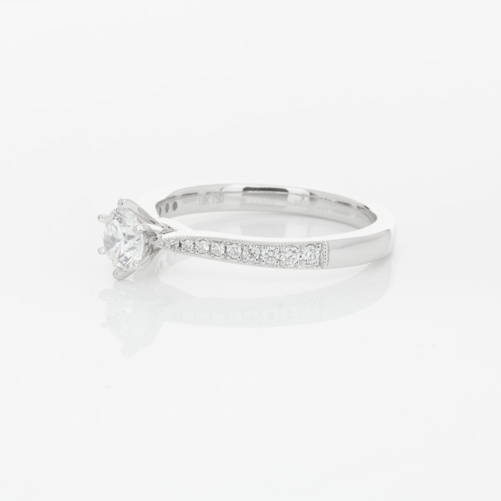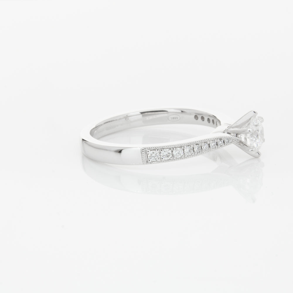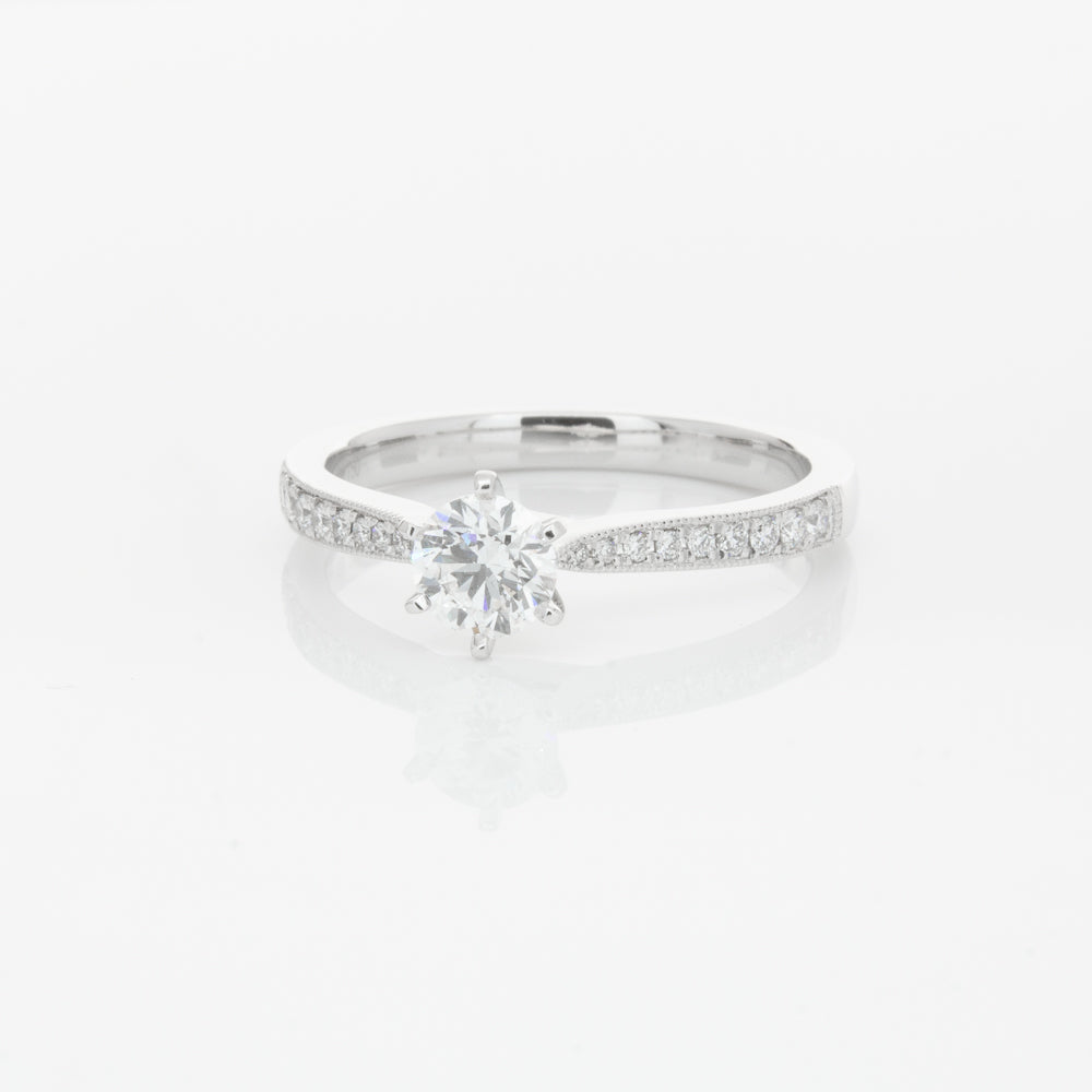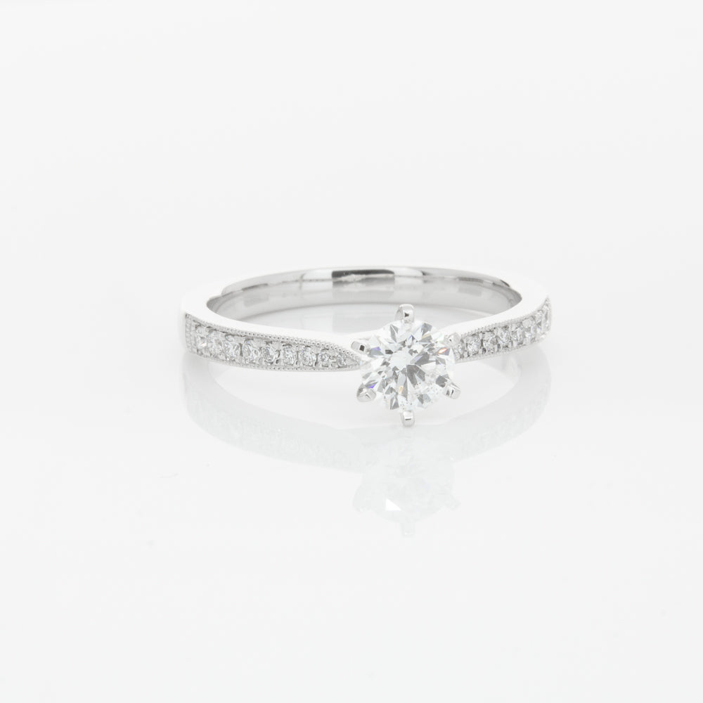 A delicate diamond set band with milgrain detailing, tapers towards the zenith to showcase a sparkling diamond.