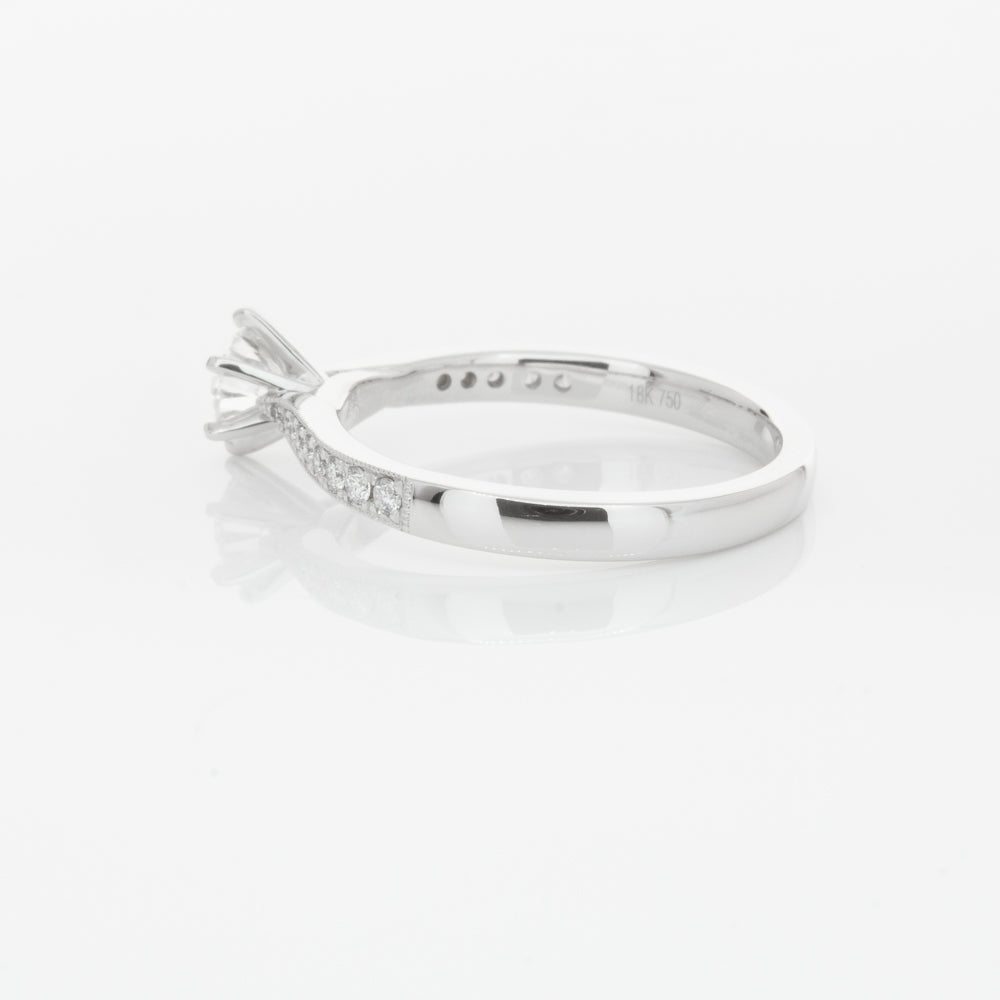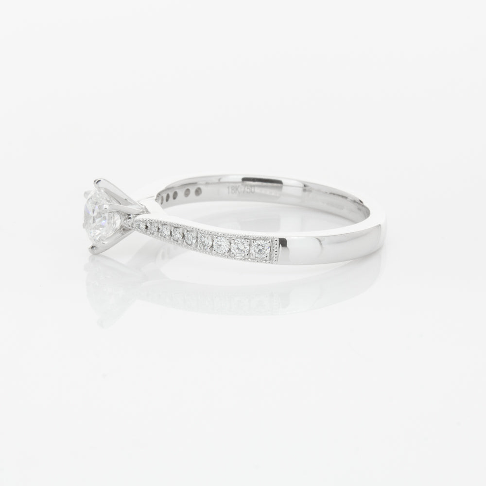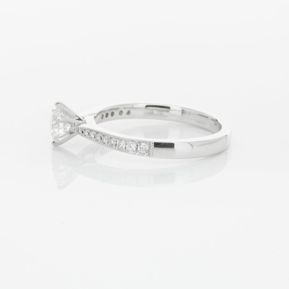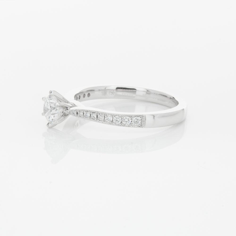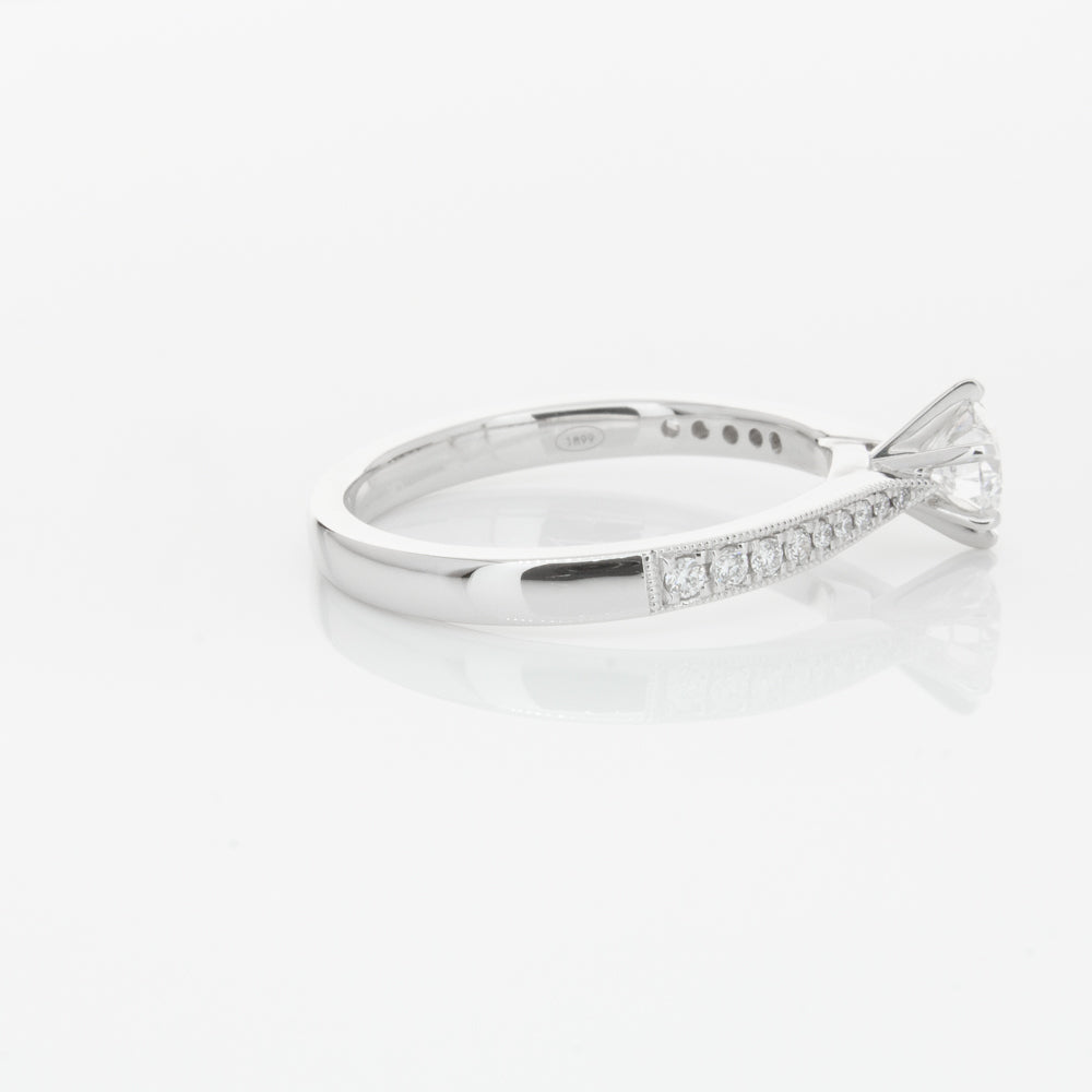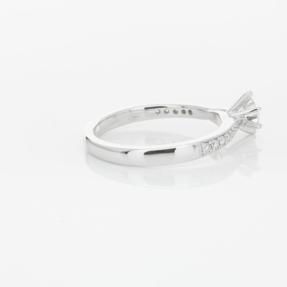 A delicate diamond set band with milgrain detailing, tapers towards the zenith to showcase a sparkling diamond.